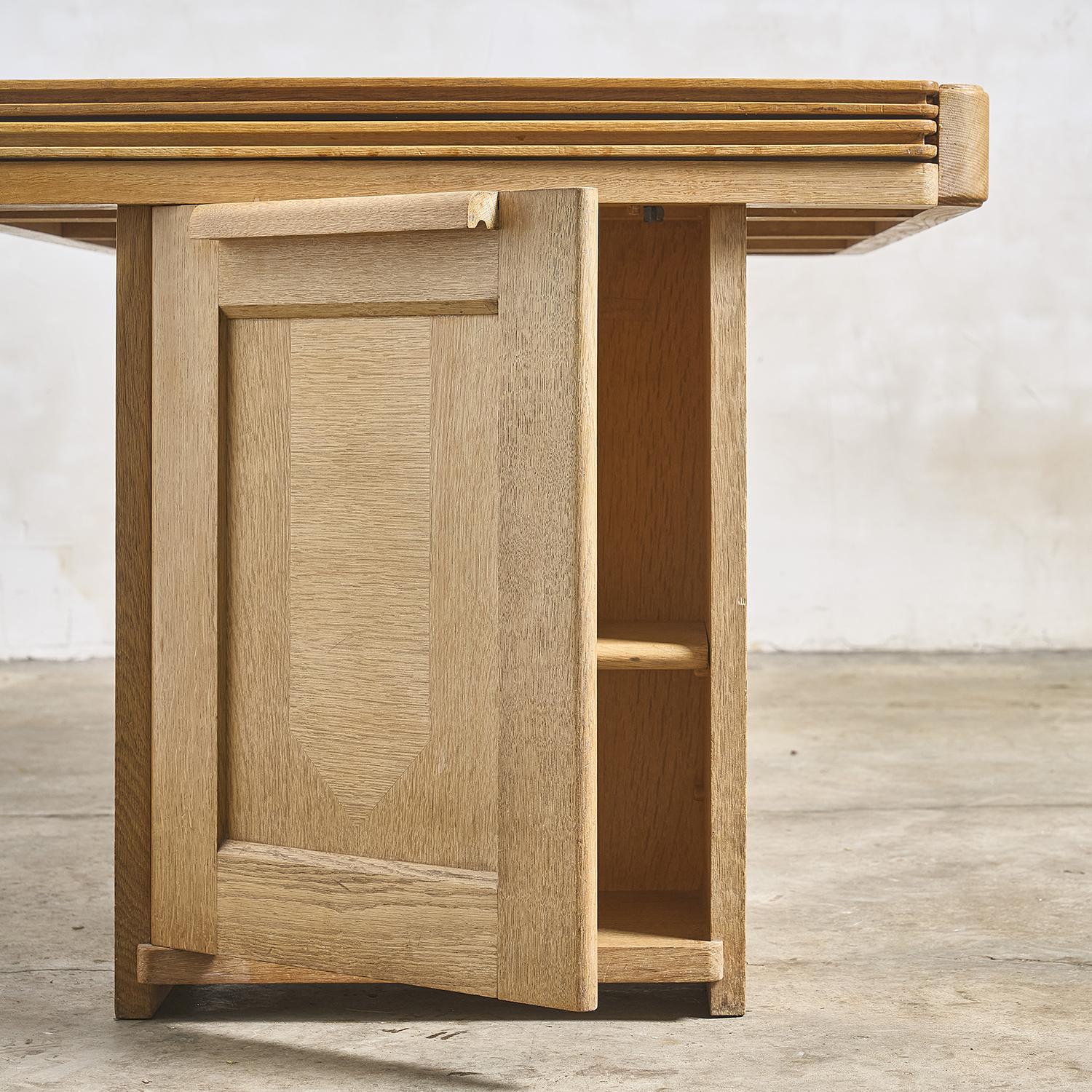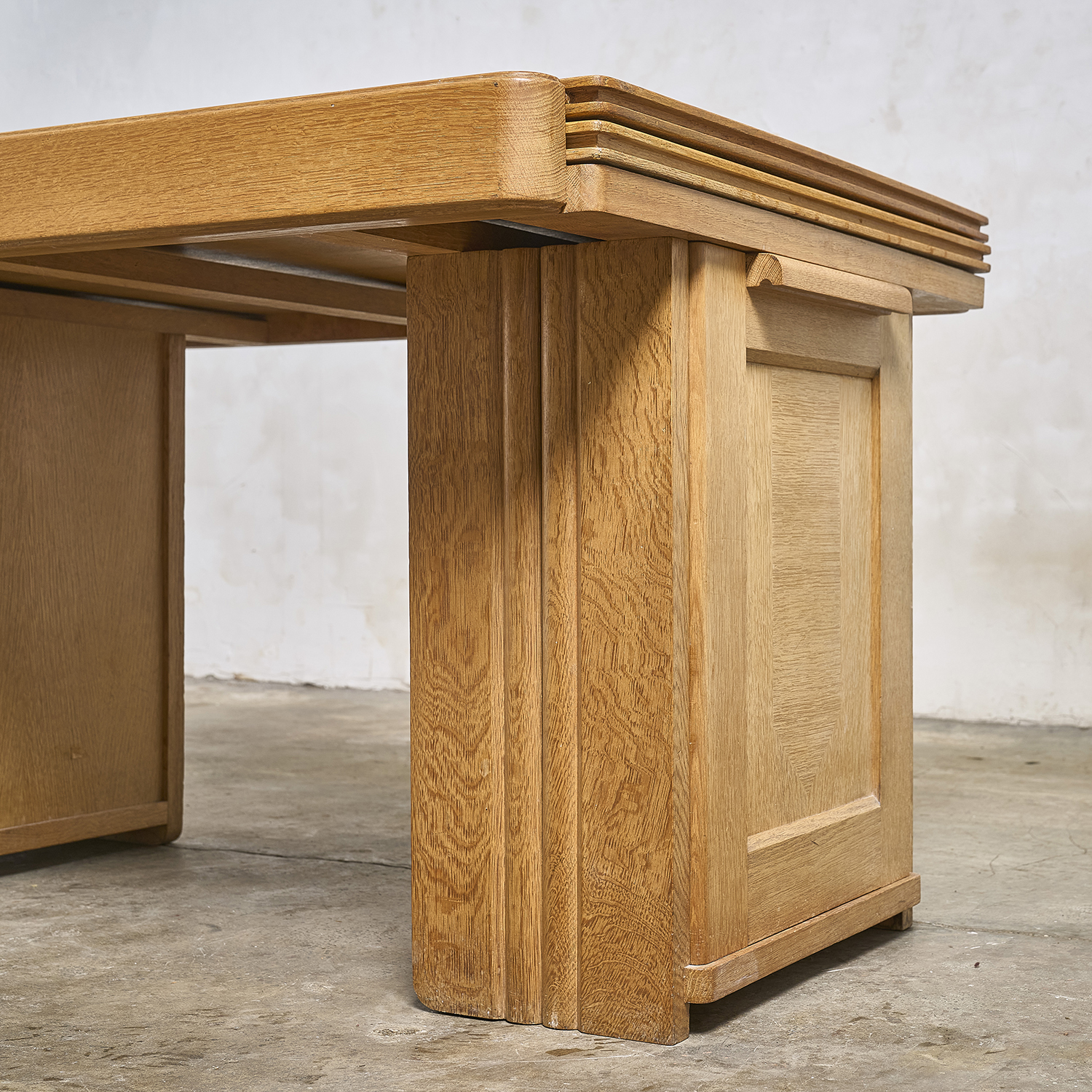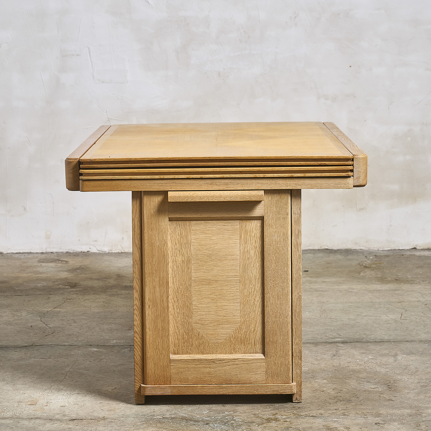 Guillerme and Chambron – Editions Votre Maison, circa 1960. Oak desk that converts into a table, with a double rectangular sliding top resting on two drawers, each with a door.