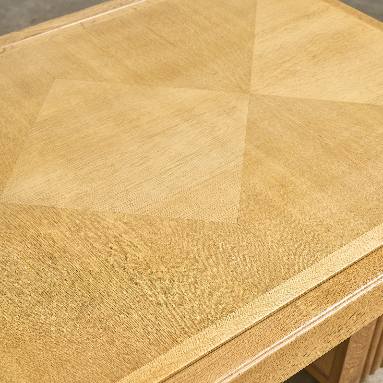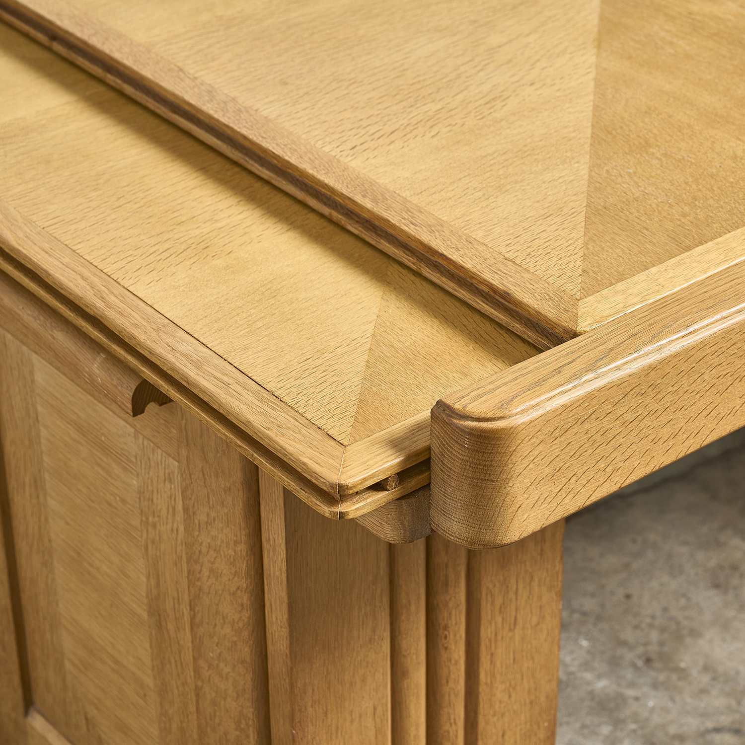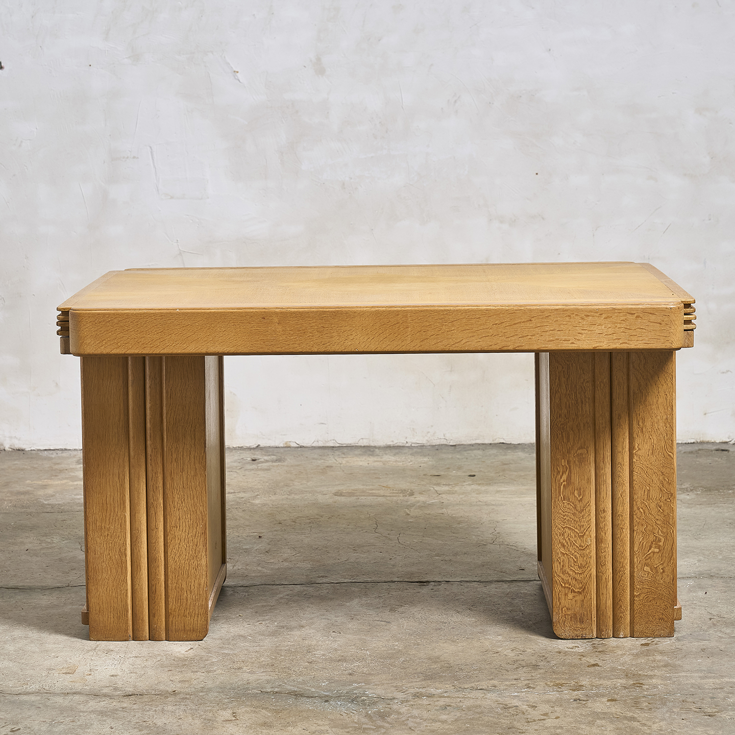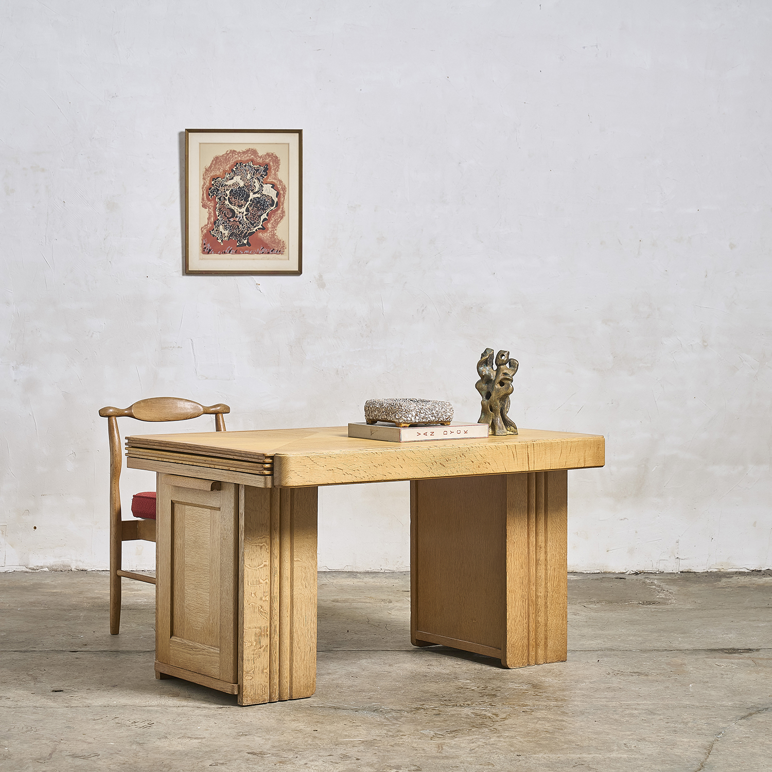 Guillerme and Chambron – Editions Votre Maison, circa 1960. Oak desk that converts into a table, with a double rectangular sliding top resting on two drawers, each with a door.