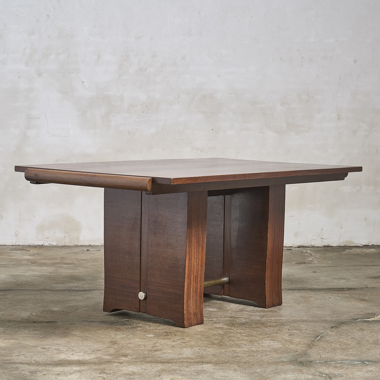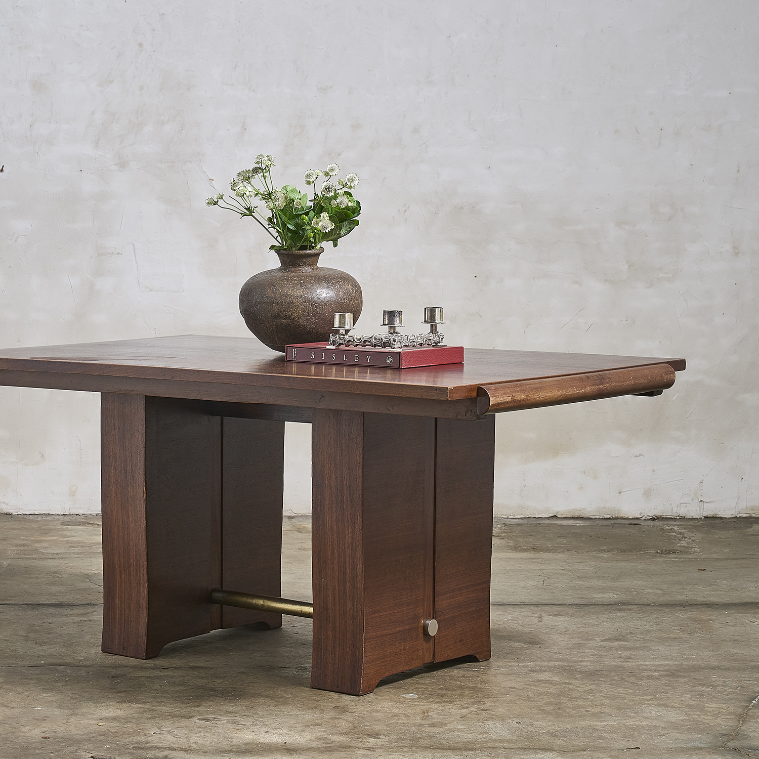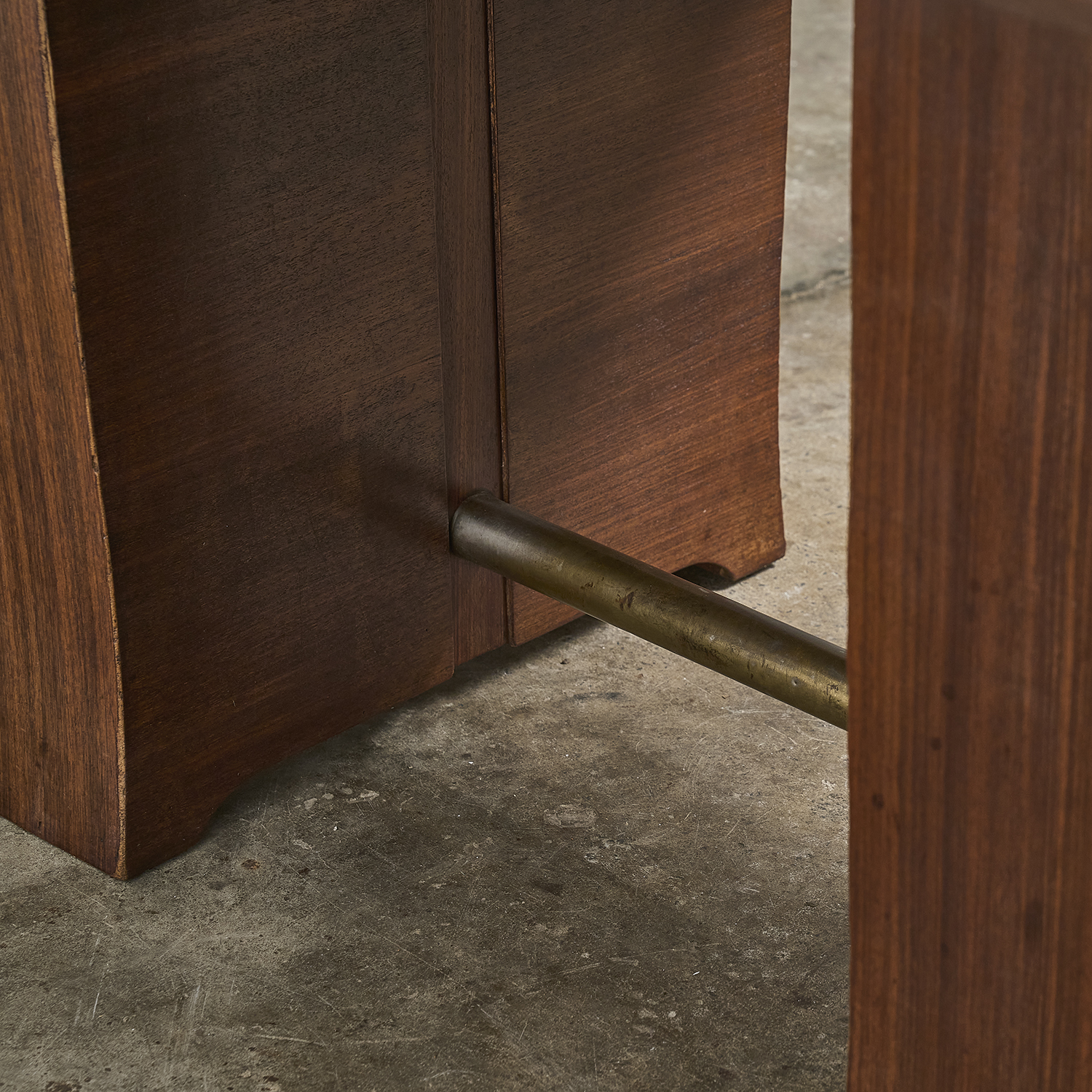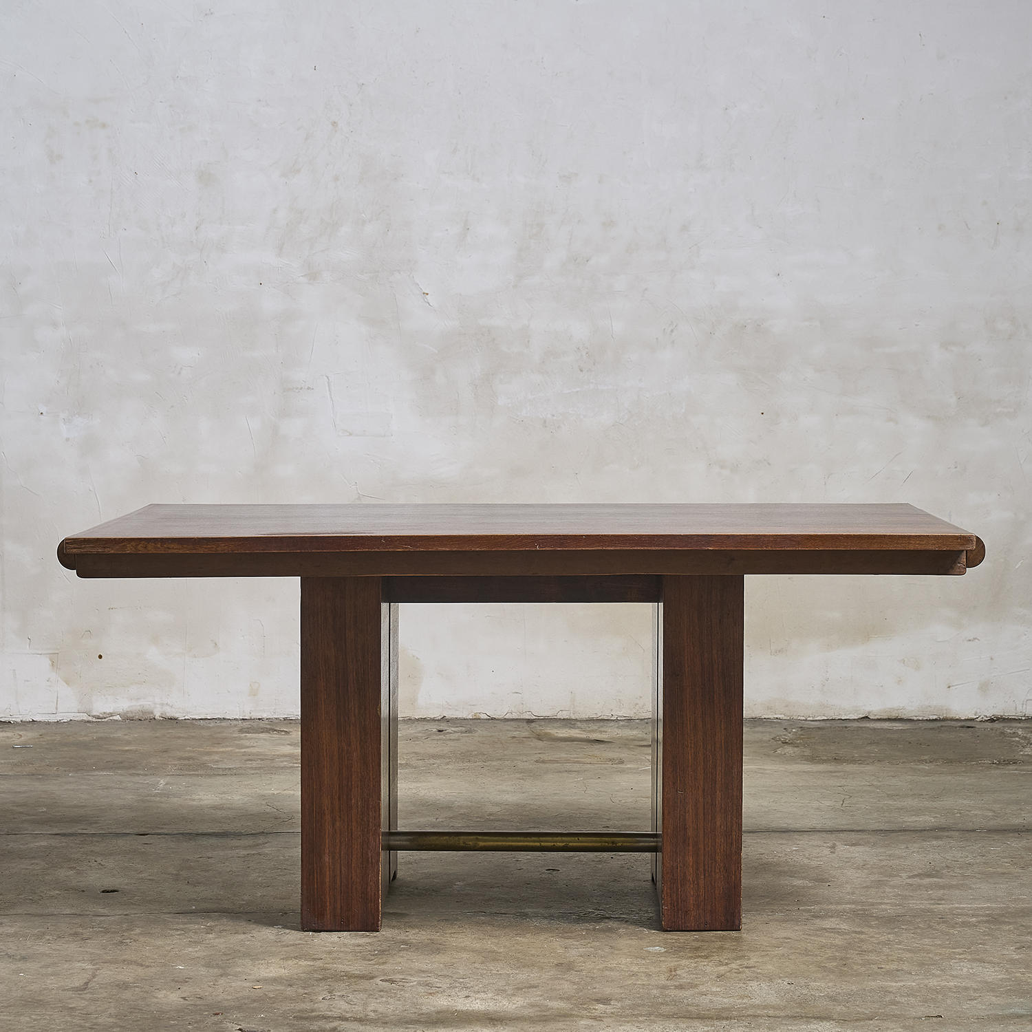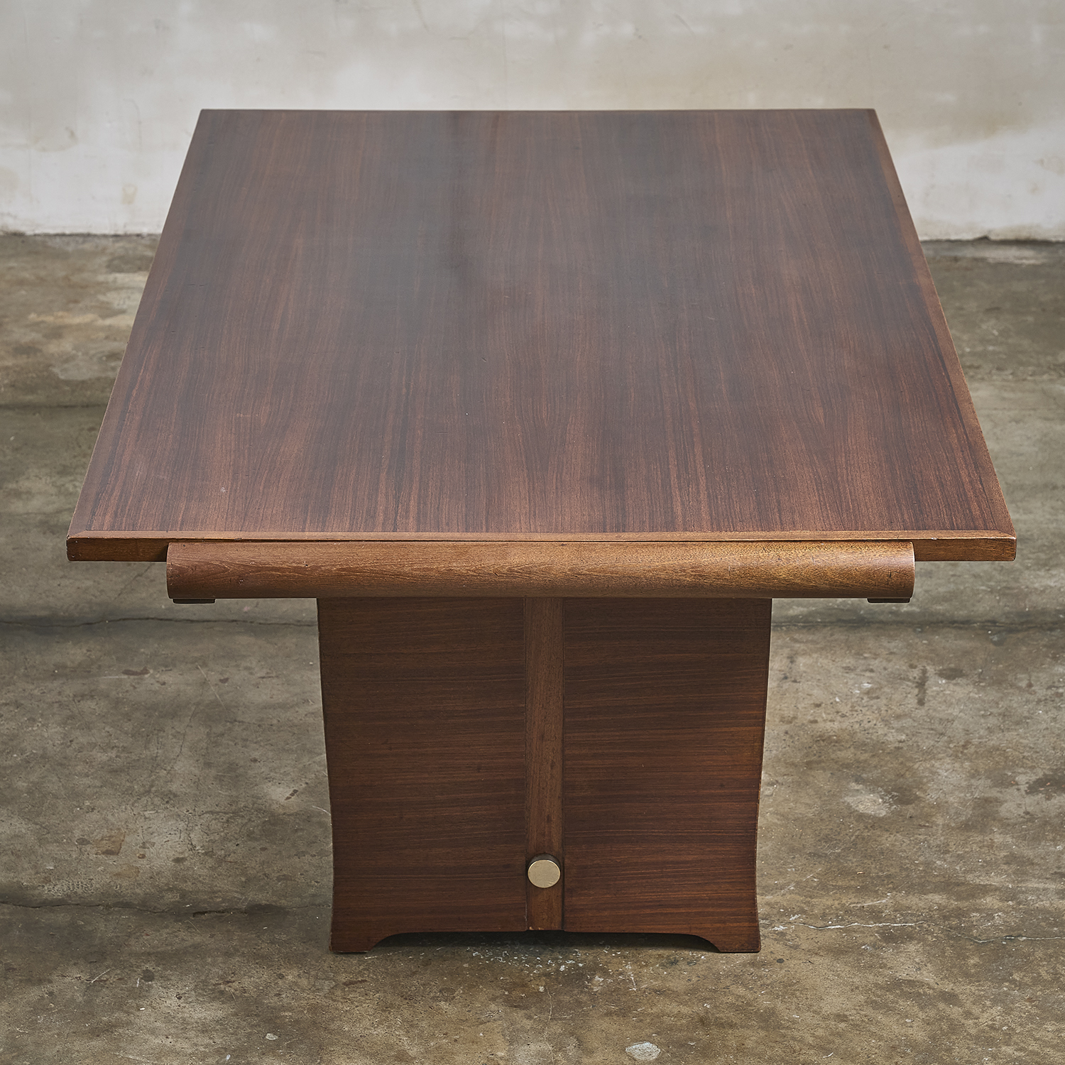 Art Deco rosewood dining table with a rectangular top resting on two legs joined by a nickel-plated brass tubular stretcher.