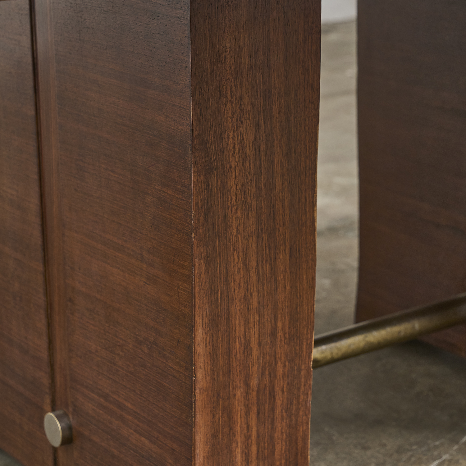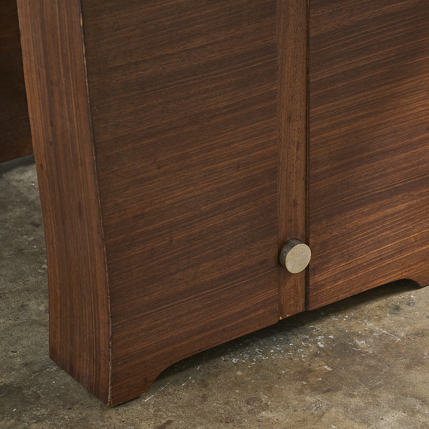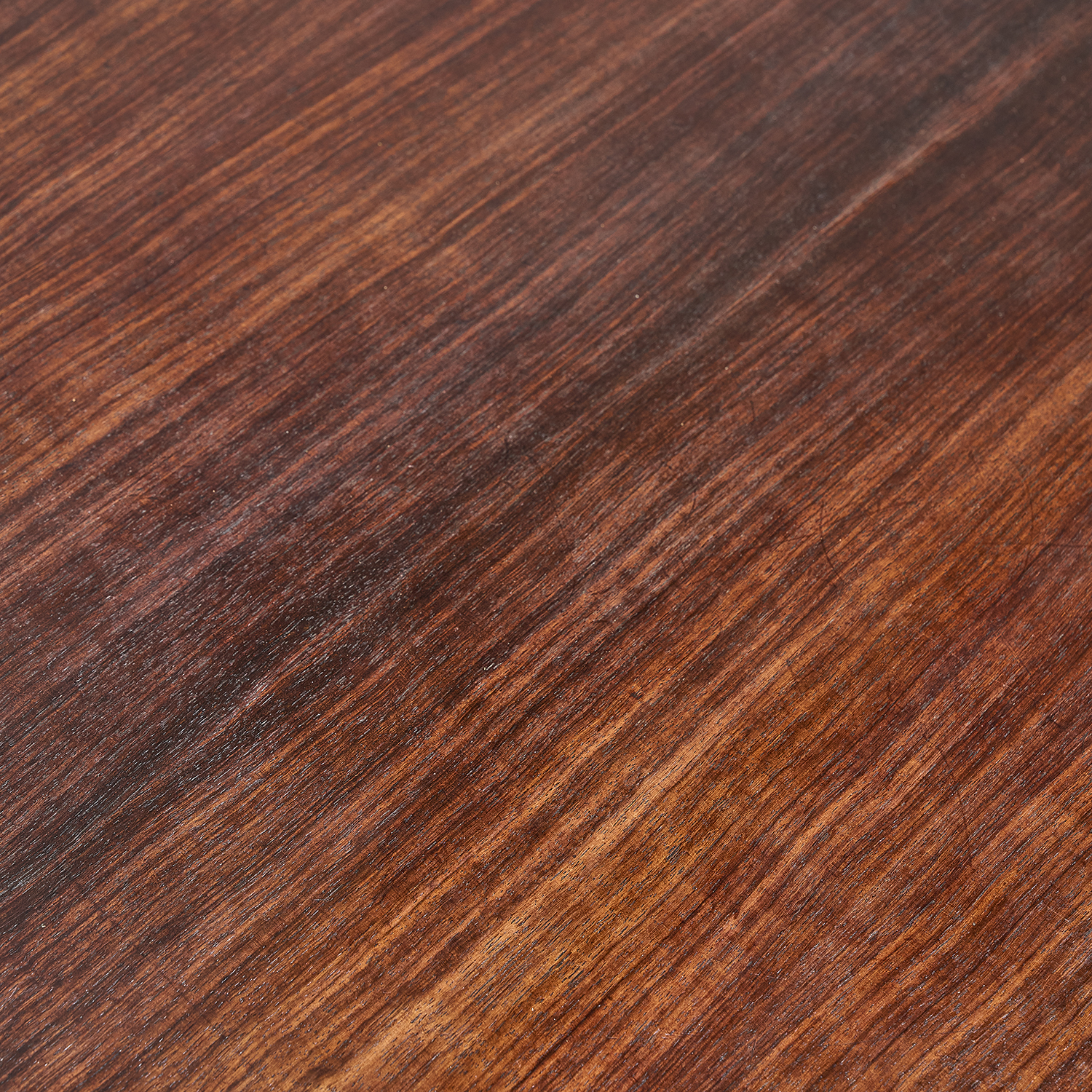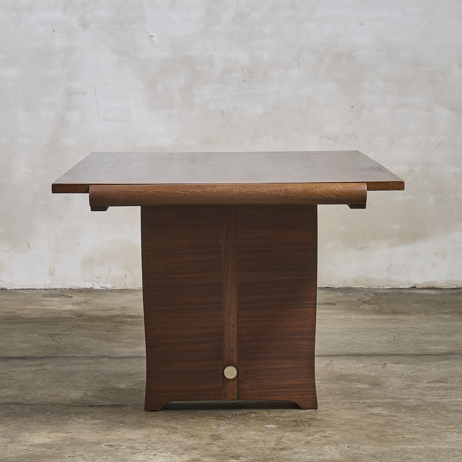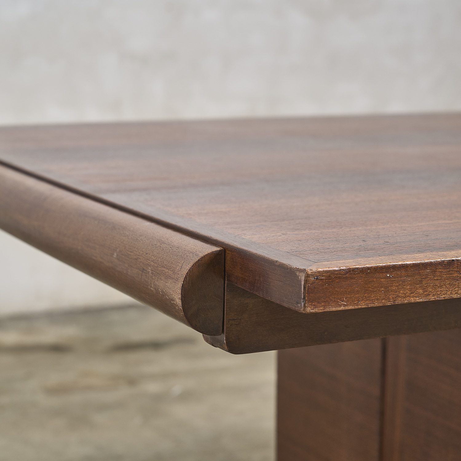 Art Deco rosewood dining table with a rectangular top resting on two legs joined by a nickel-plated brass tubular stretcher.