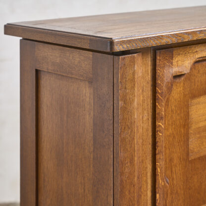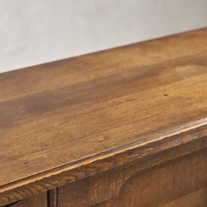 Guillerme et Chambron – Editions Votre Maison, circa 1960. “Bouvines” oak cupboard opening on the front with two molded doors and two side panels revealing shelves. H. 145 cm W. 162 cm D. 47 cm