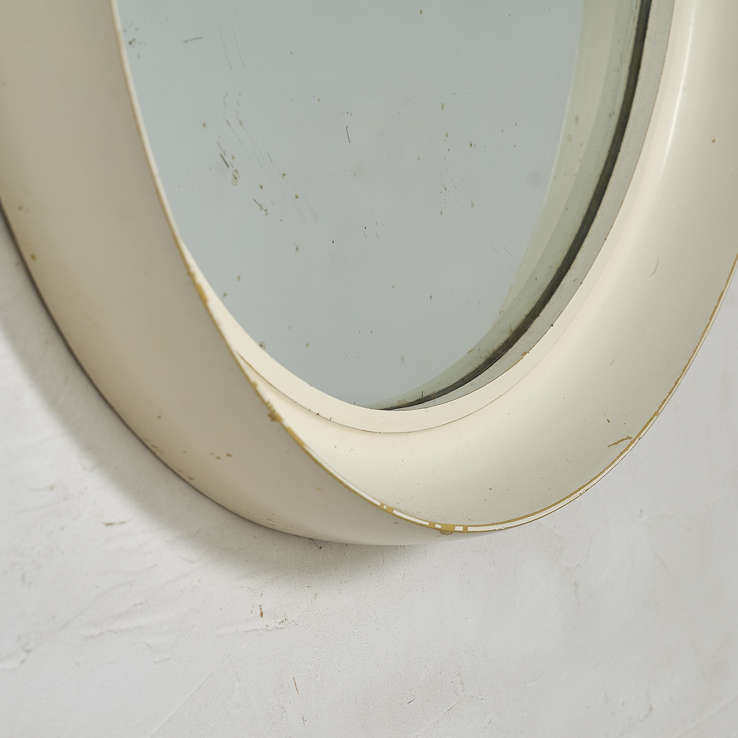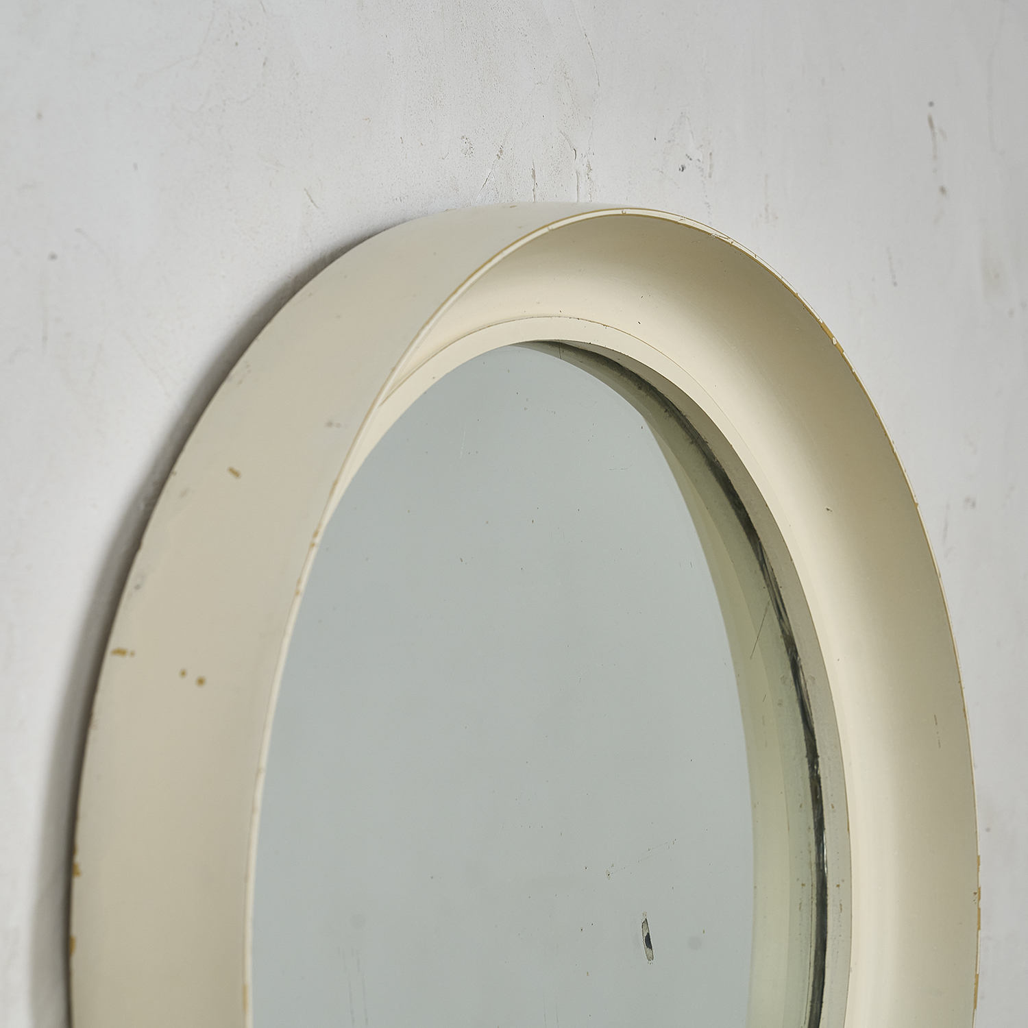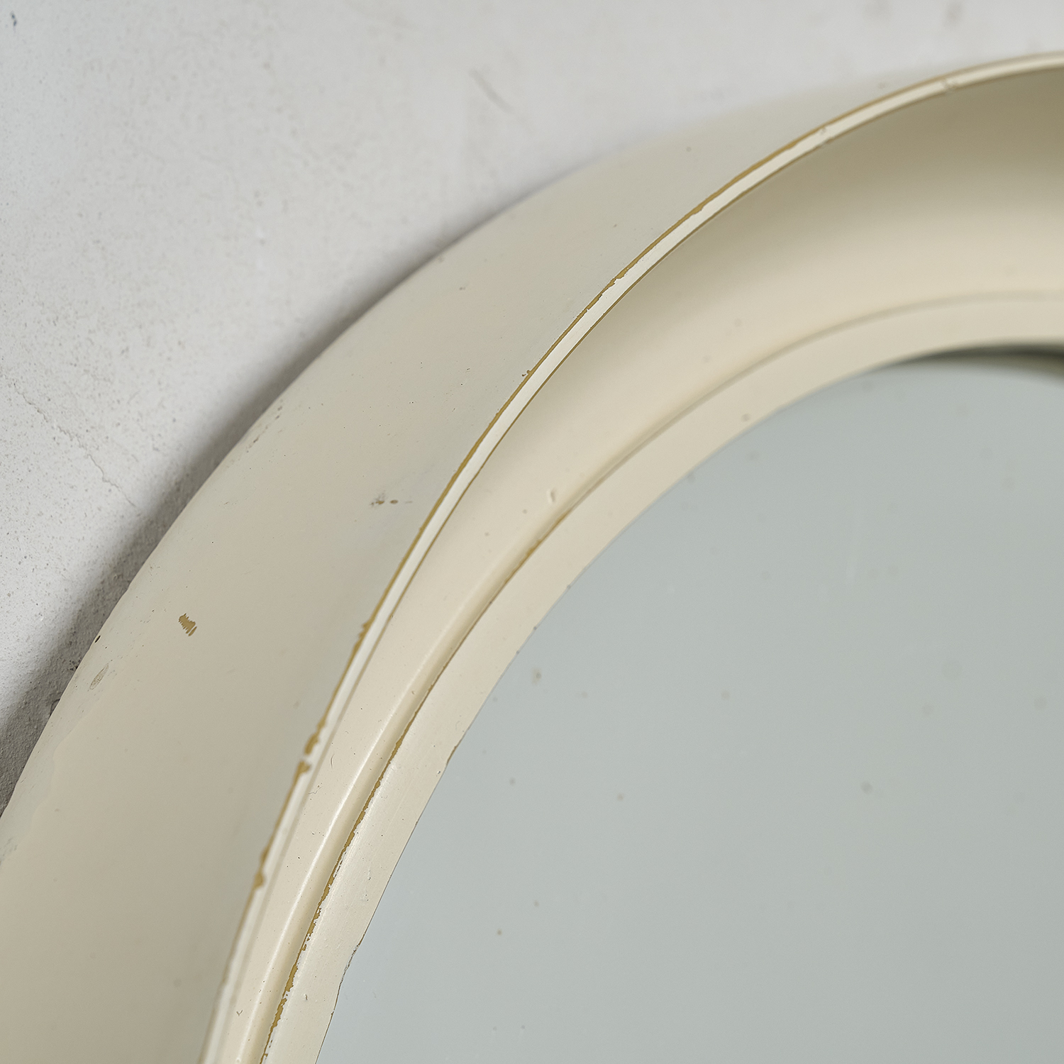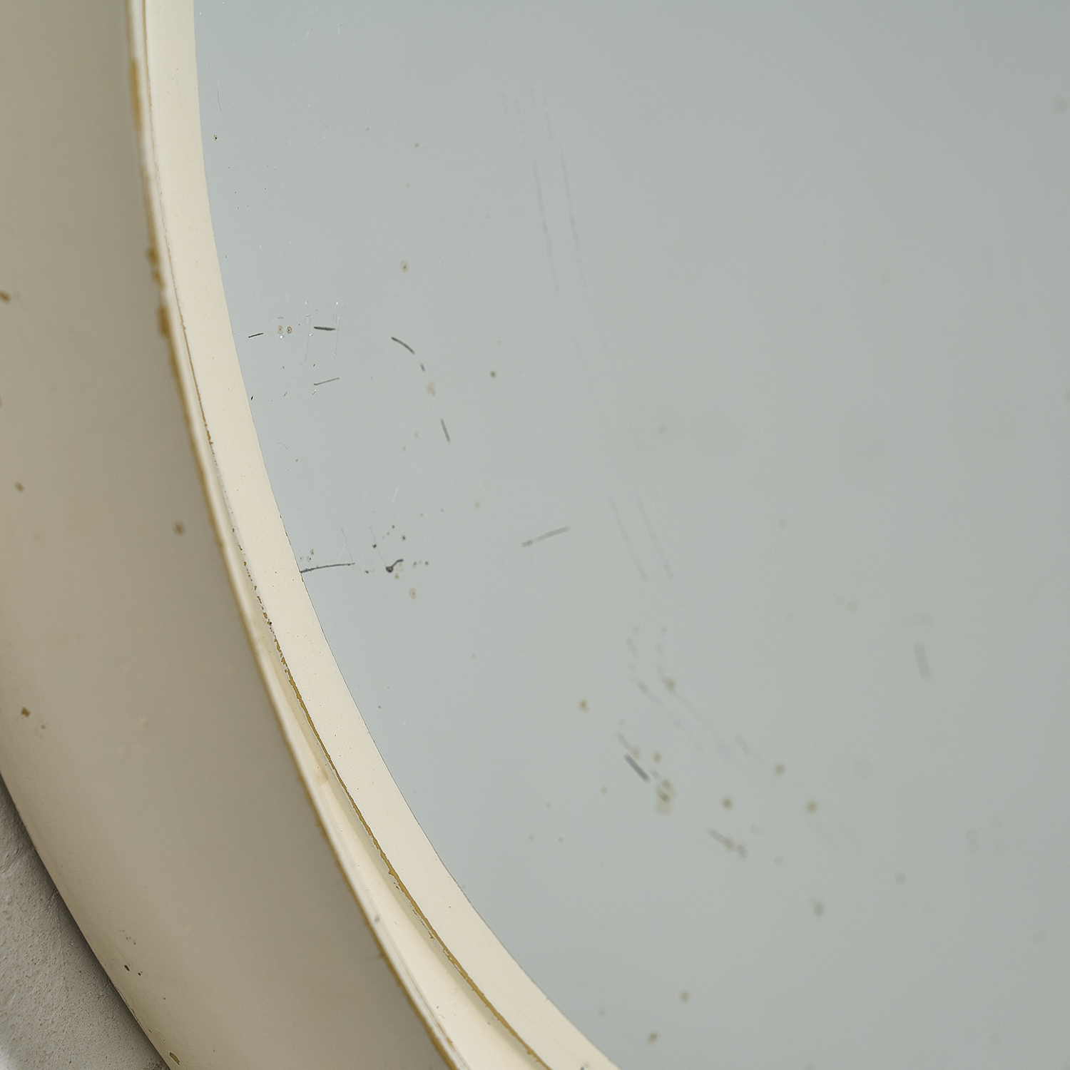 Circular wooden mirror with a white patina. France, circa 1960. Slight scratch on the glass (see photo). Diameter: 49 cm, Height: 6 cm Mirror diameter: 39 cm