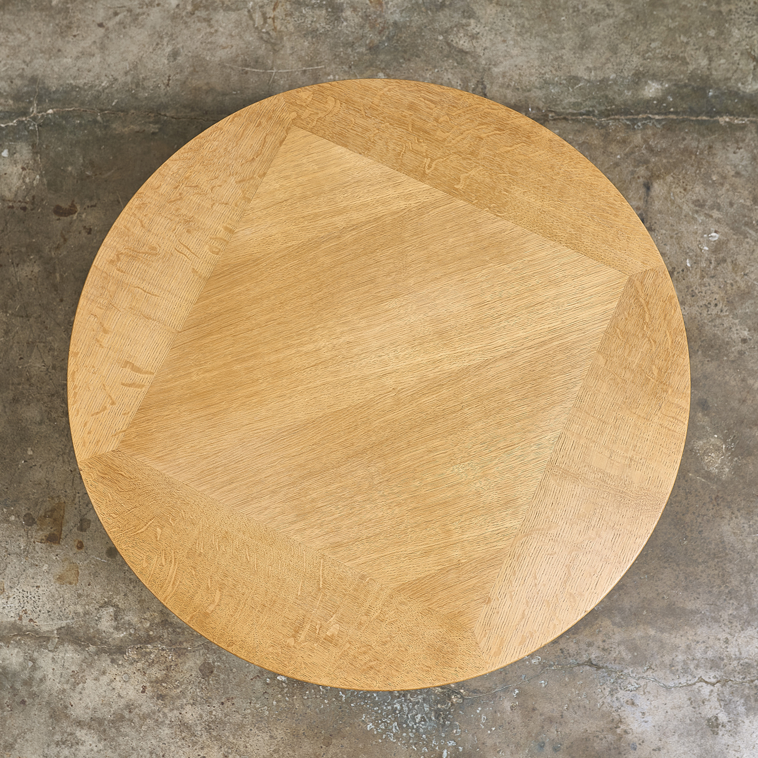 Charles DUDOUYT (1885-1946). Circular, profiled coffee table in light oak, with a slightly tapered, slightly divergent base. Manufactured by La Gentilhommière, stamped CH. D. with a hot iron under the waistband, circa 1960. H. 43 cm D. 75 cm