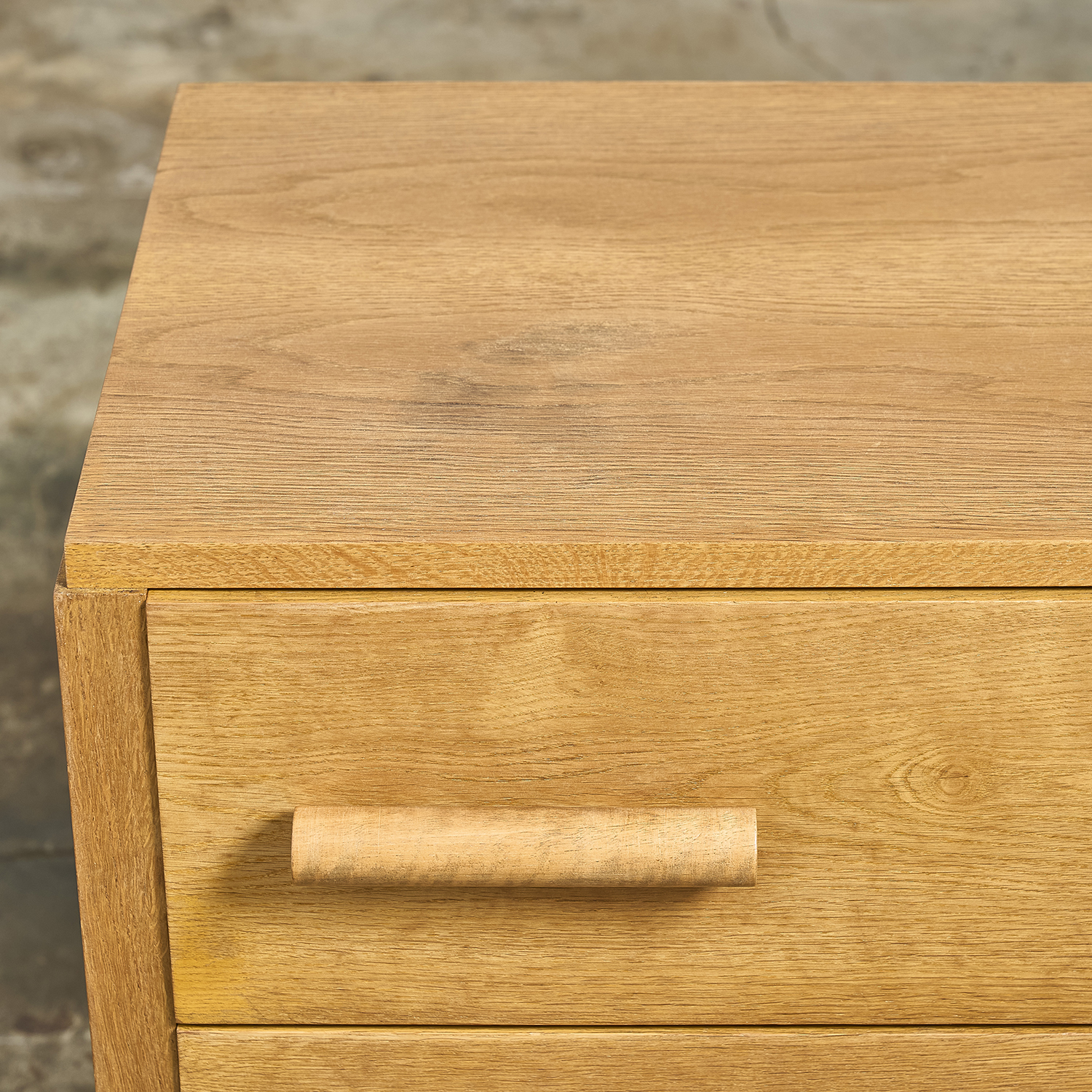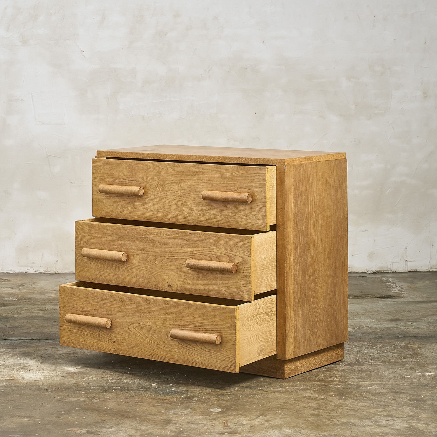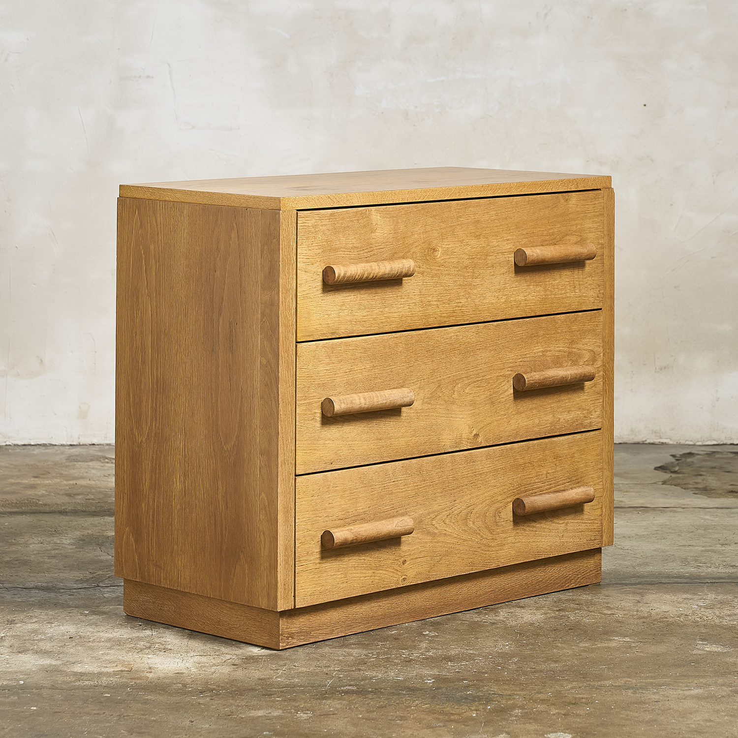 Chest of drawers in light oak with three drawers on the front, each with a cylindrical pull handle. France, circa 1950. H. 80 cm W. 90 cm D. 49 cm
