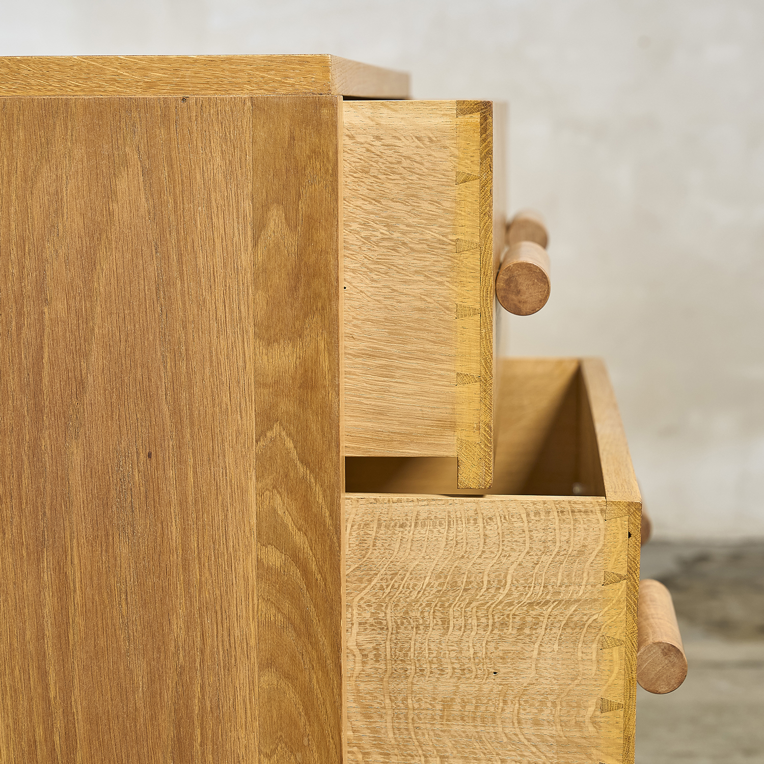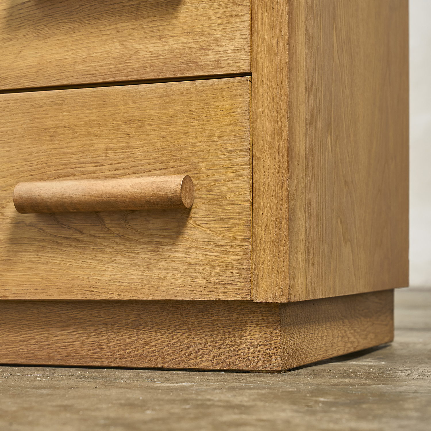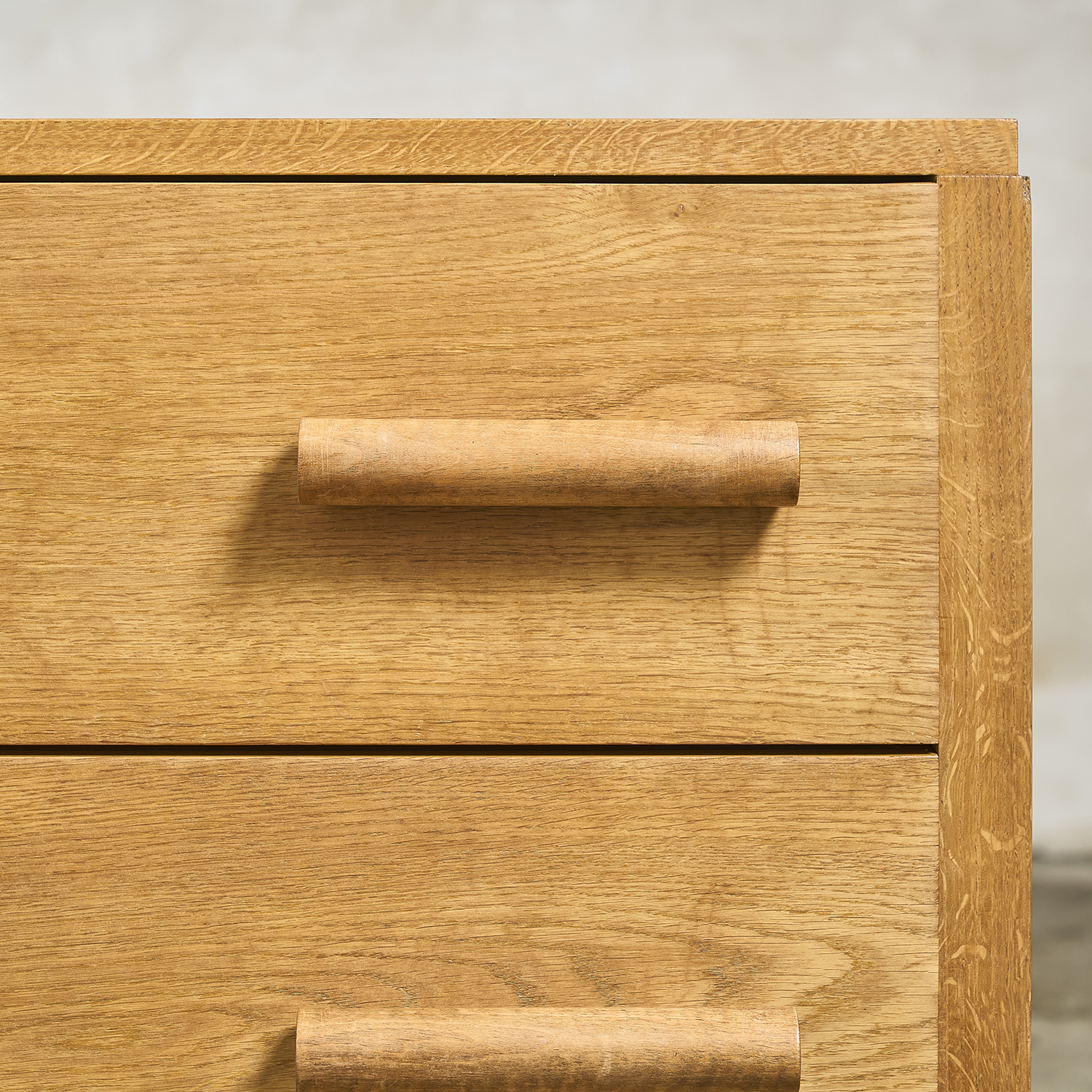 Chest of drawers in light oak with three drawers on the front, each with a cylindrical pull handle. France, circa 1950. H. 80 cm W. 90 cm D. 49 cm