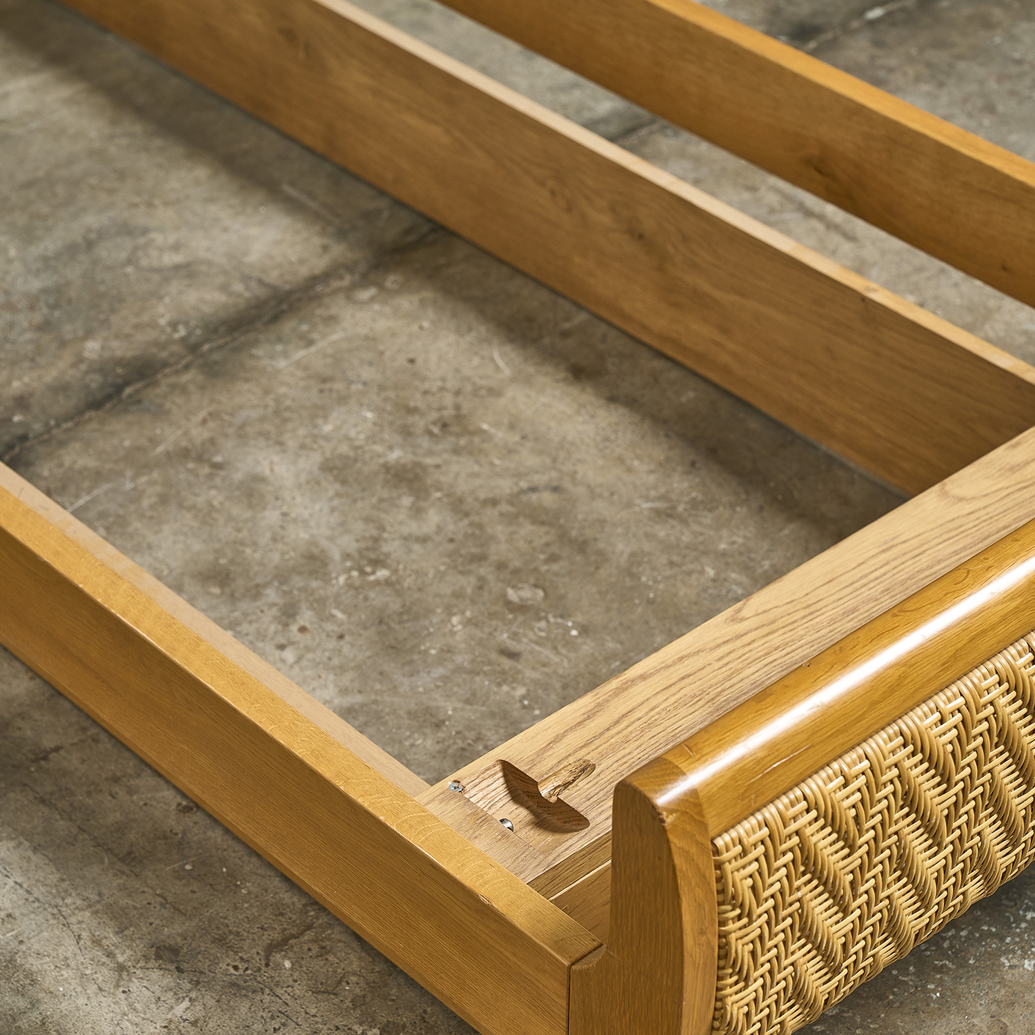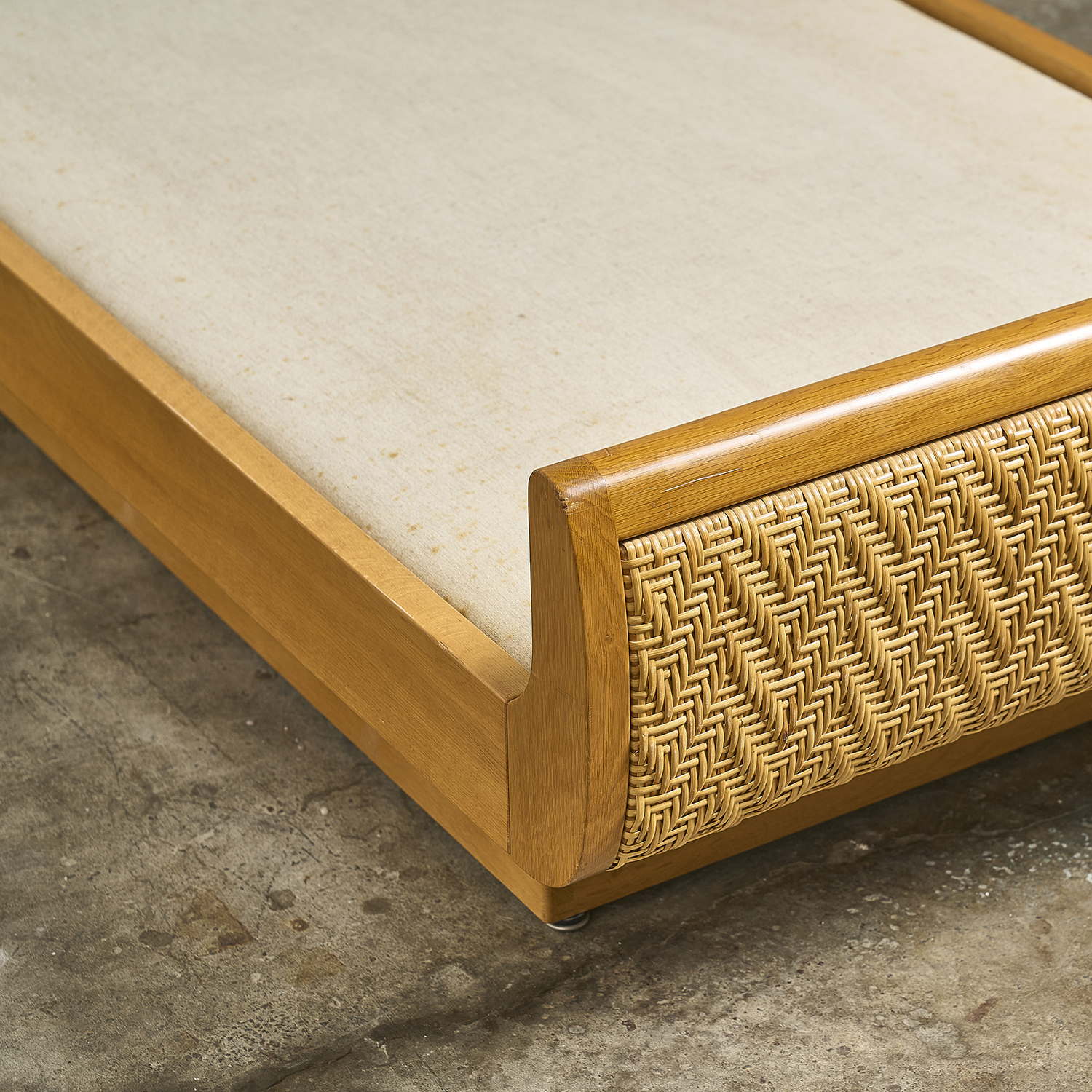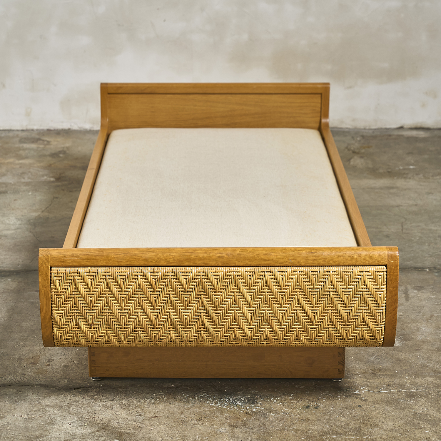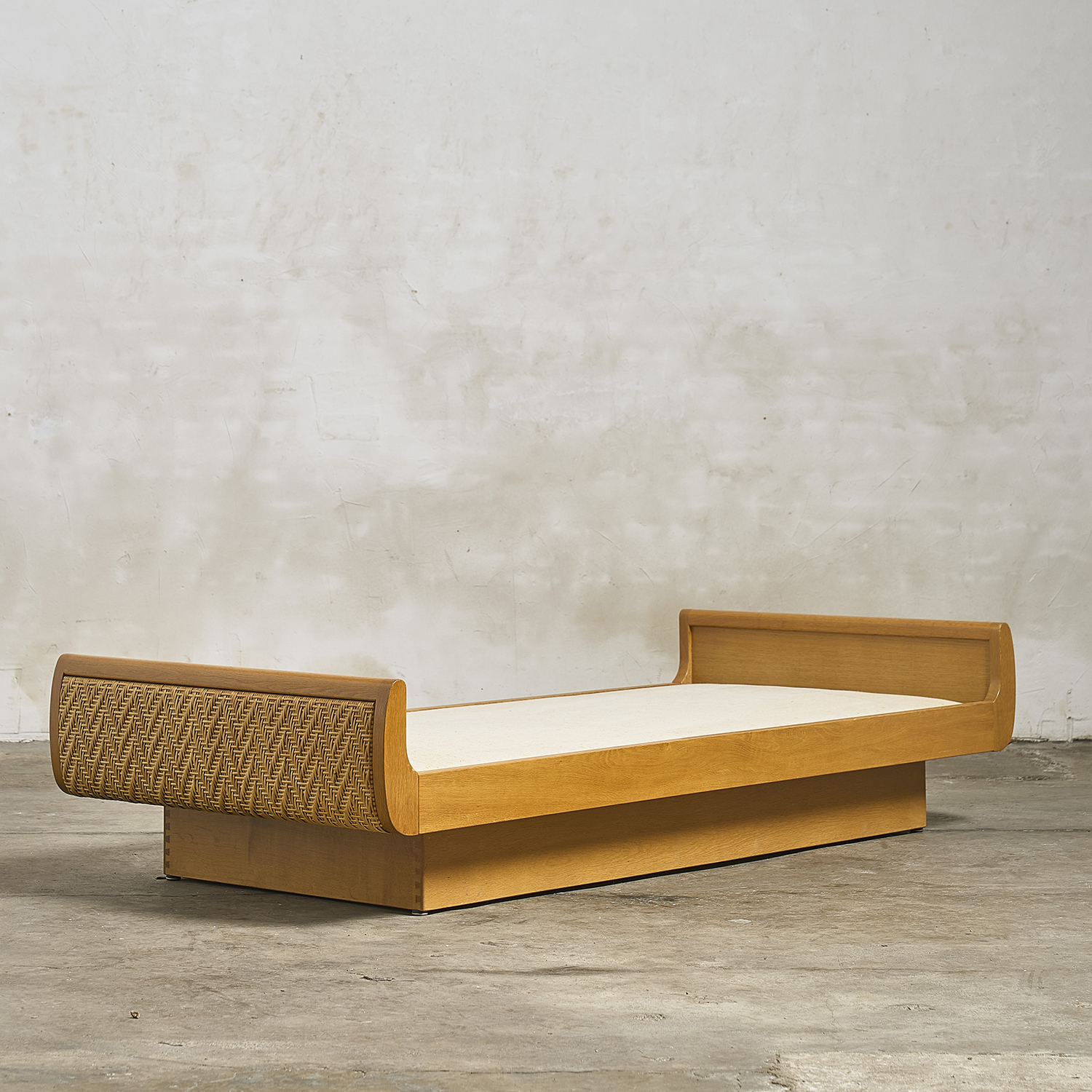 Daybed in light oak, the curved sides covered in woven rattan. France, circa 1960.