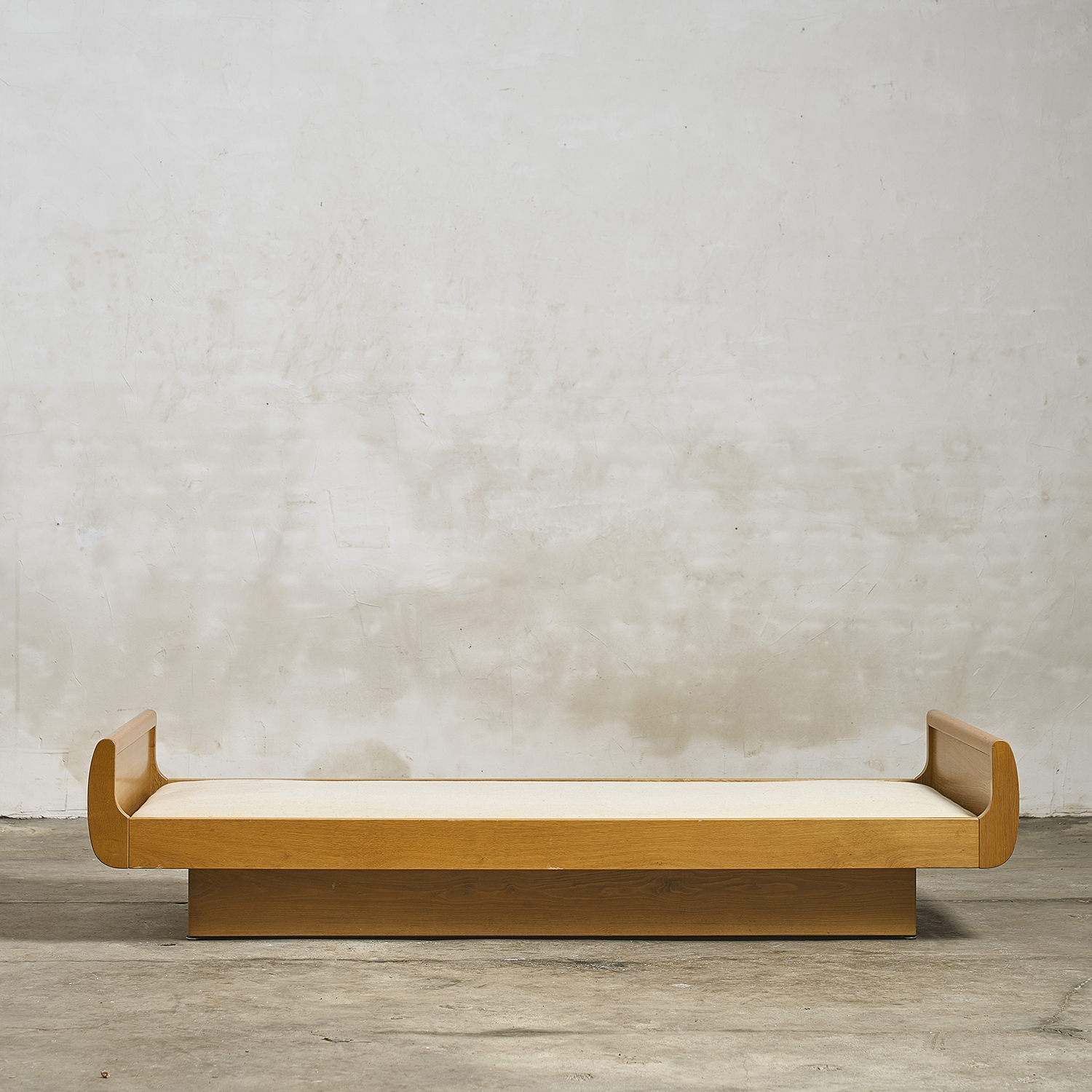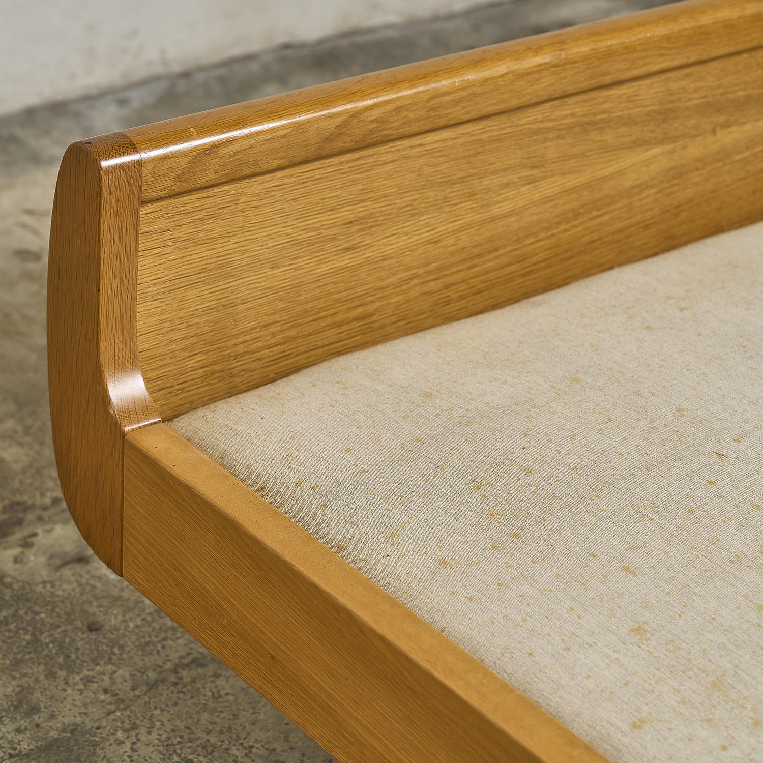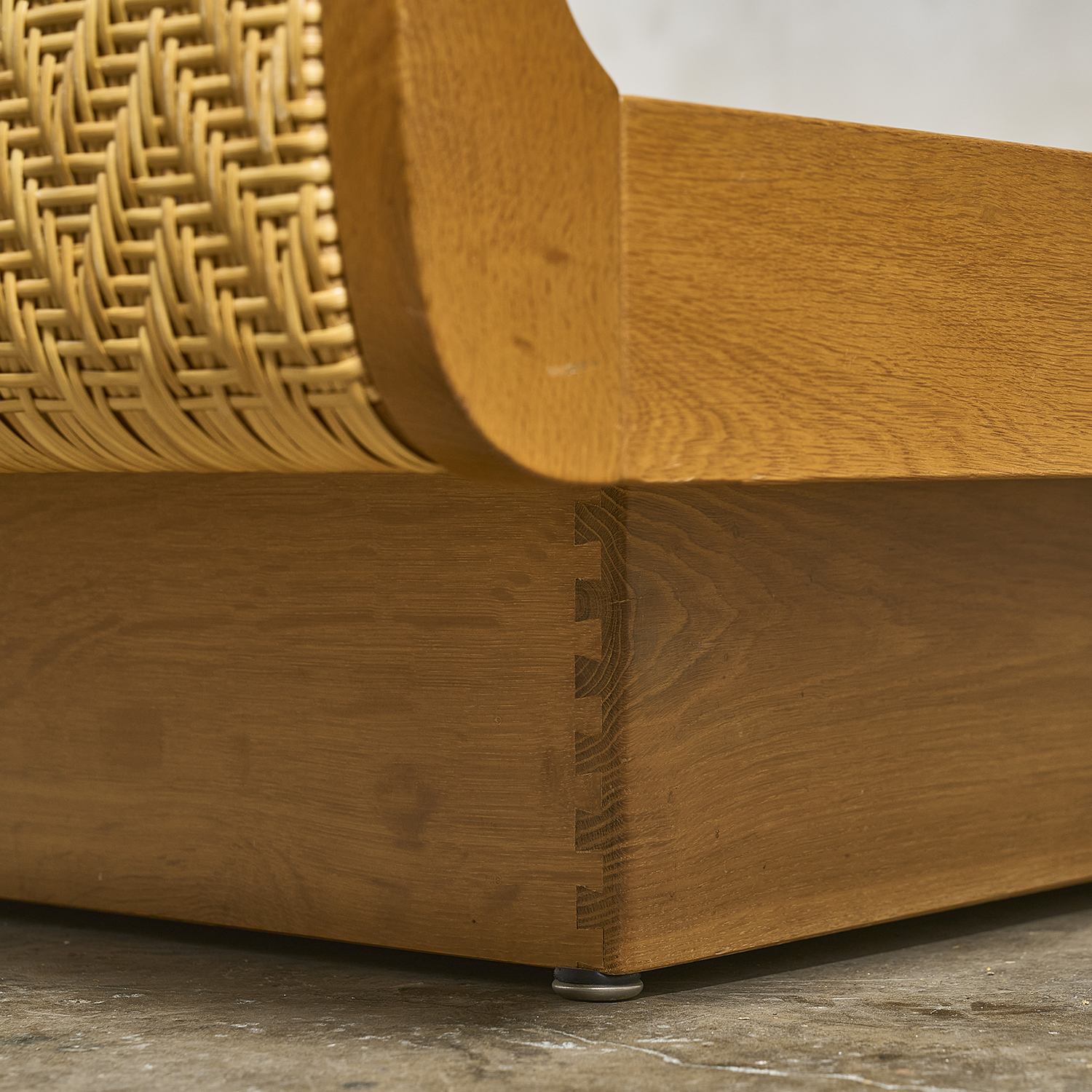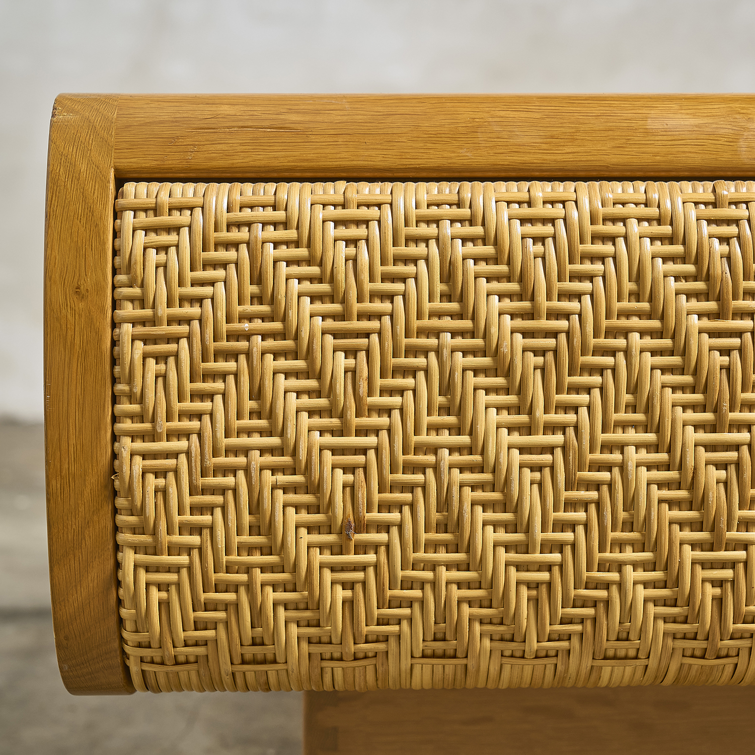 Daybed in light oak, the curved sides covered in woven rattan. France, circa 1960.