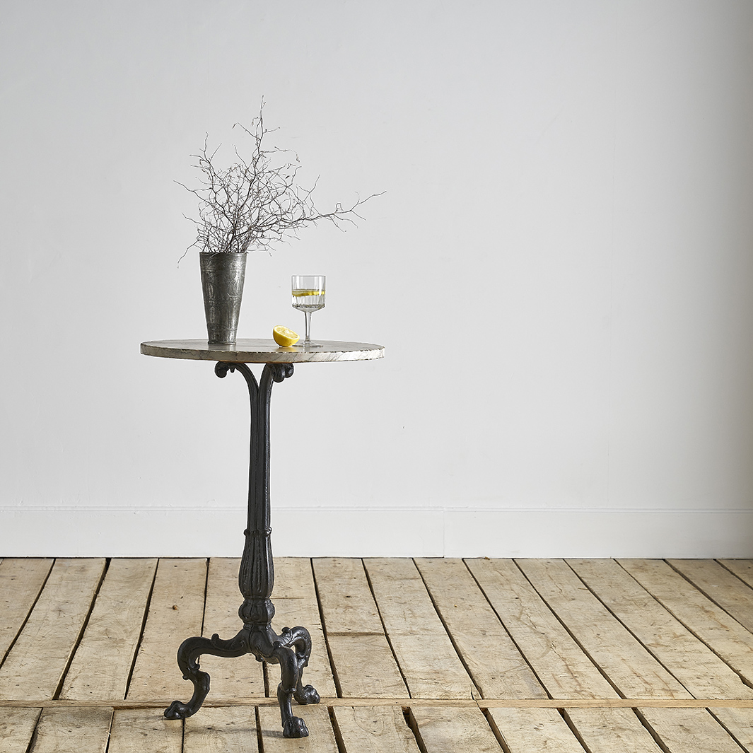 Wooden bistro table, with spacer legs. Patinated brass crossbar. H. 75 cm L. 77 cm D. 61 cm Top thickness: 2.5 cm