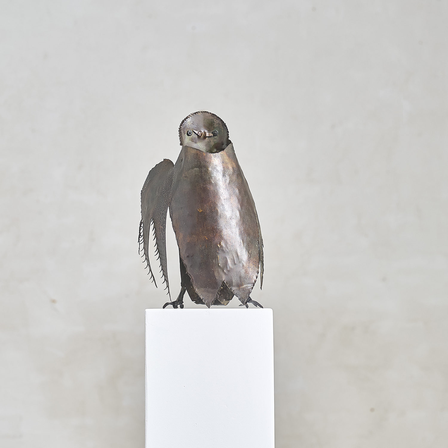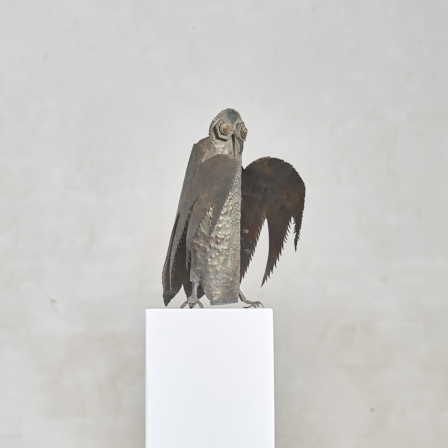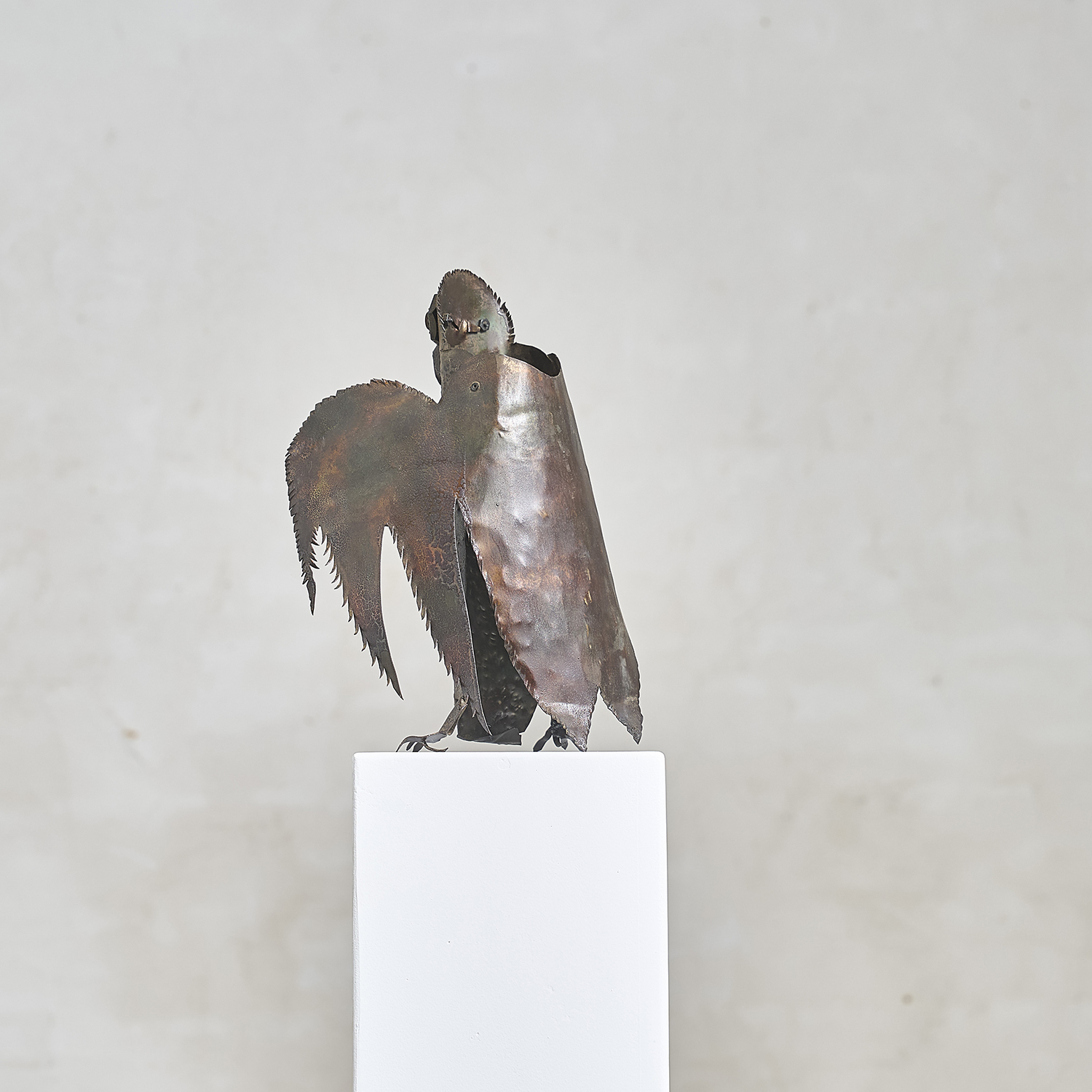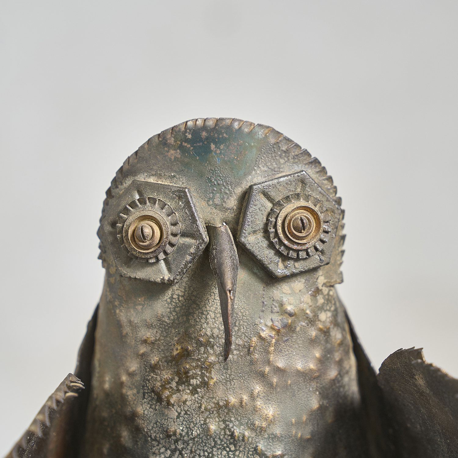 Brutalist sculpture in folded, worked, and welded metal depicting an owl, circa 1970. Anonymous.