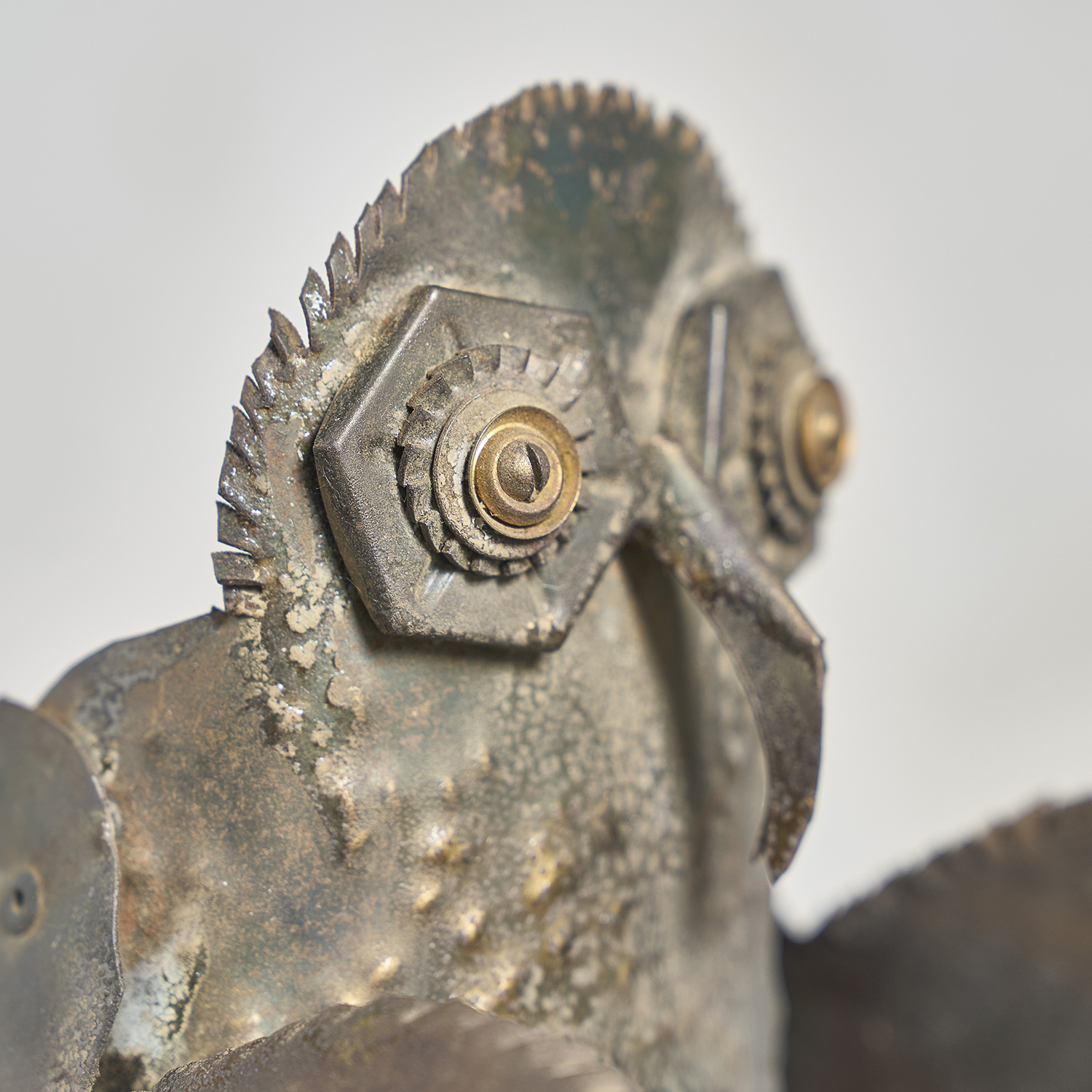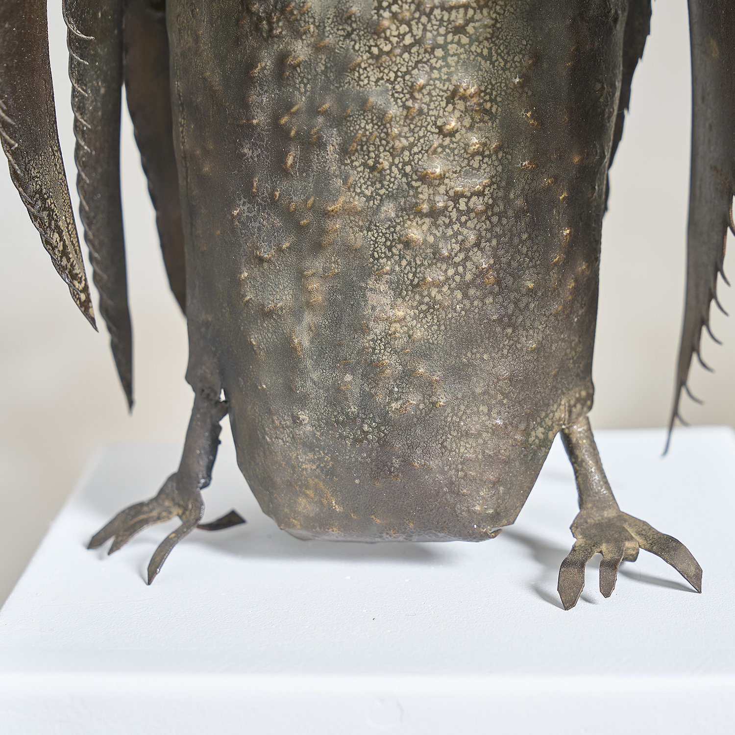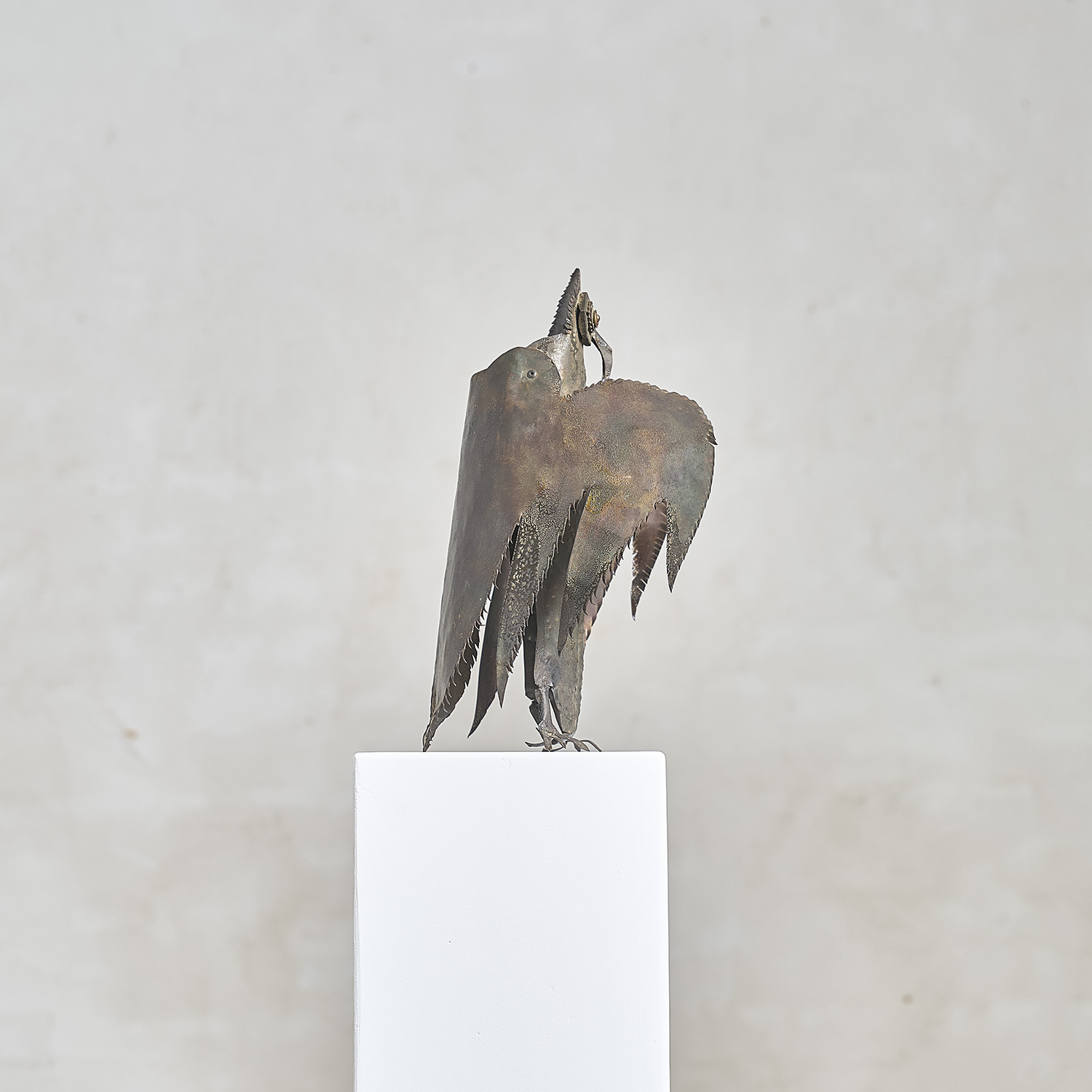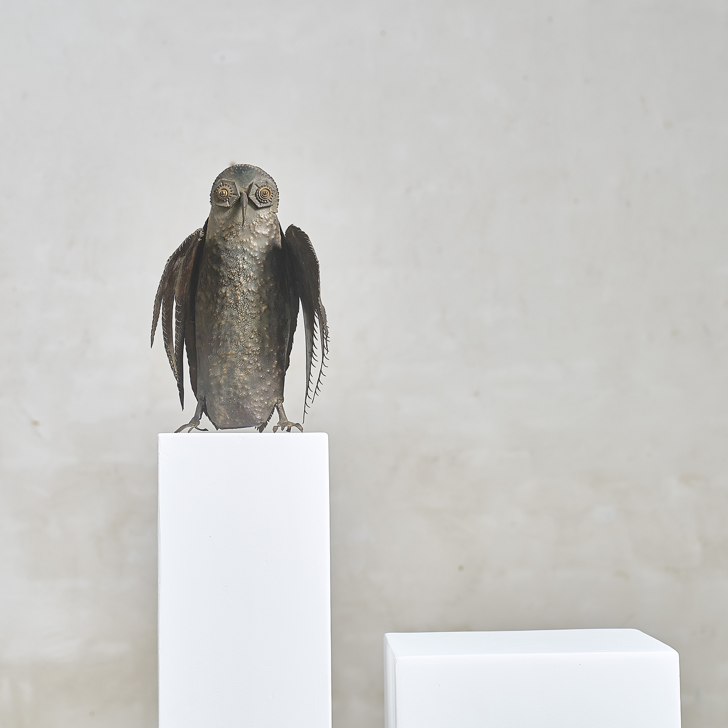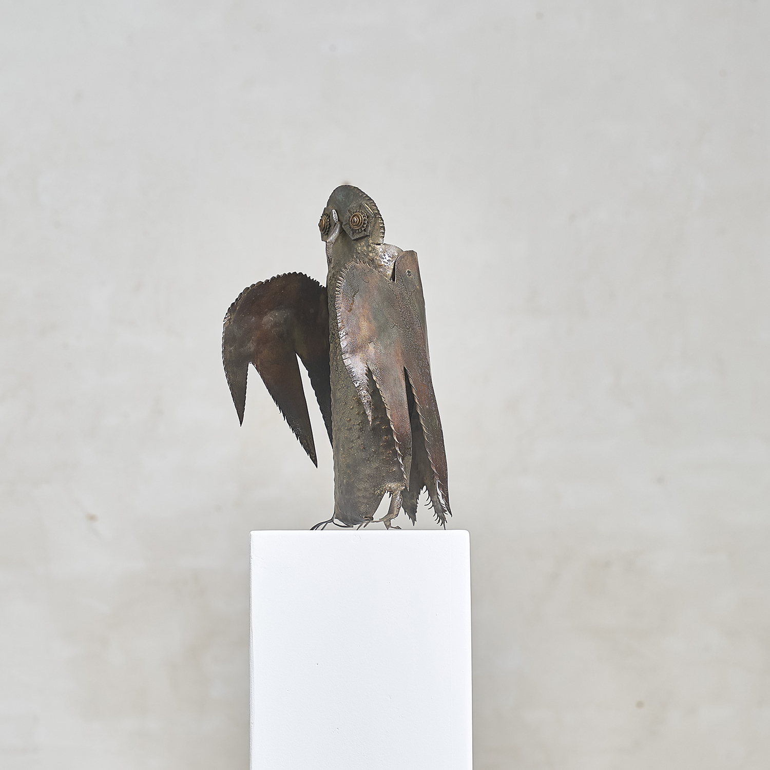 Brutalist sculpture in folded, worked, and welded metal depicting an owl, circa 1970. Anonymous.