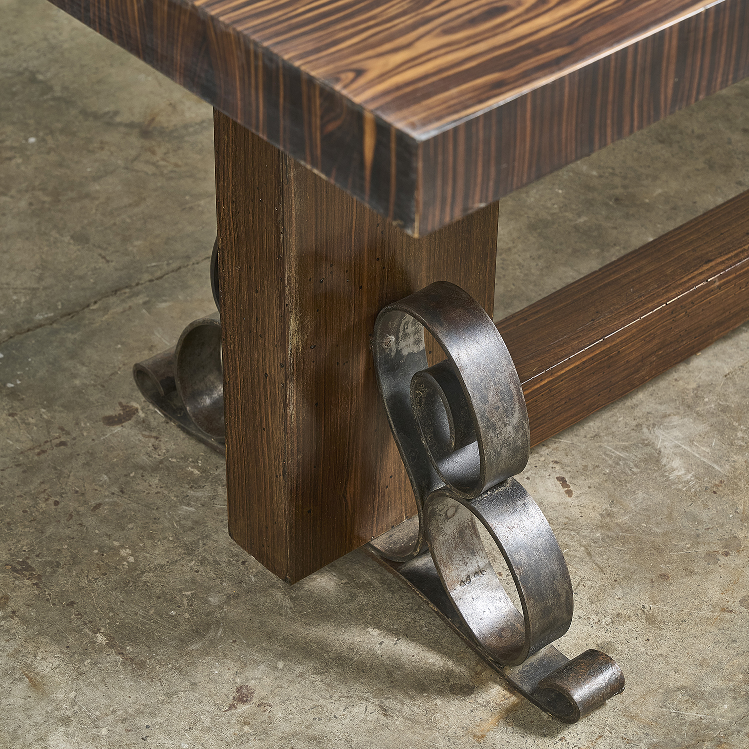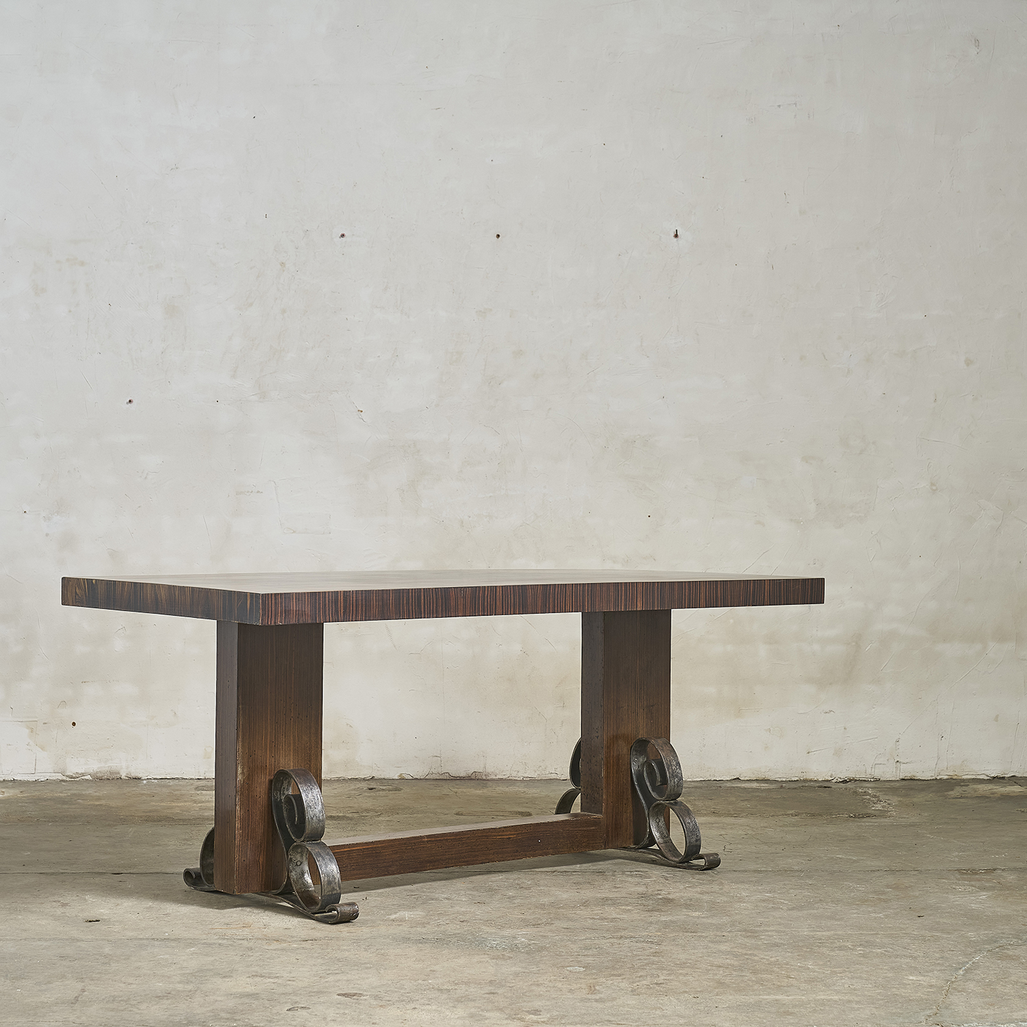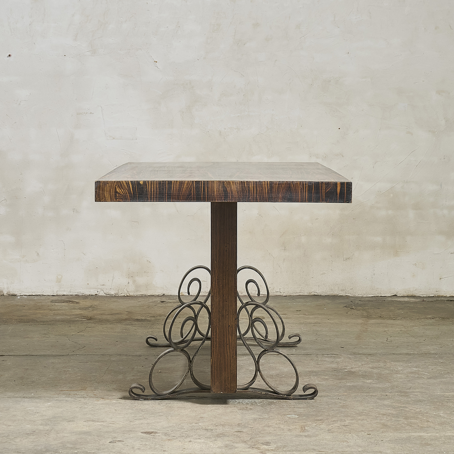 Art Deco dining table in Macassar ebony veneer, with a rosewood veneer and wrought iron base.