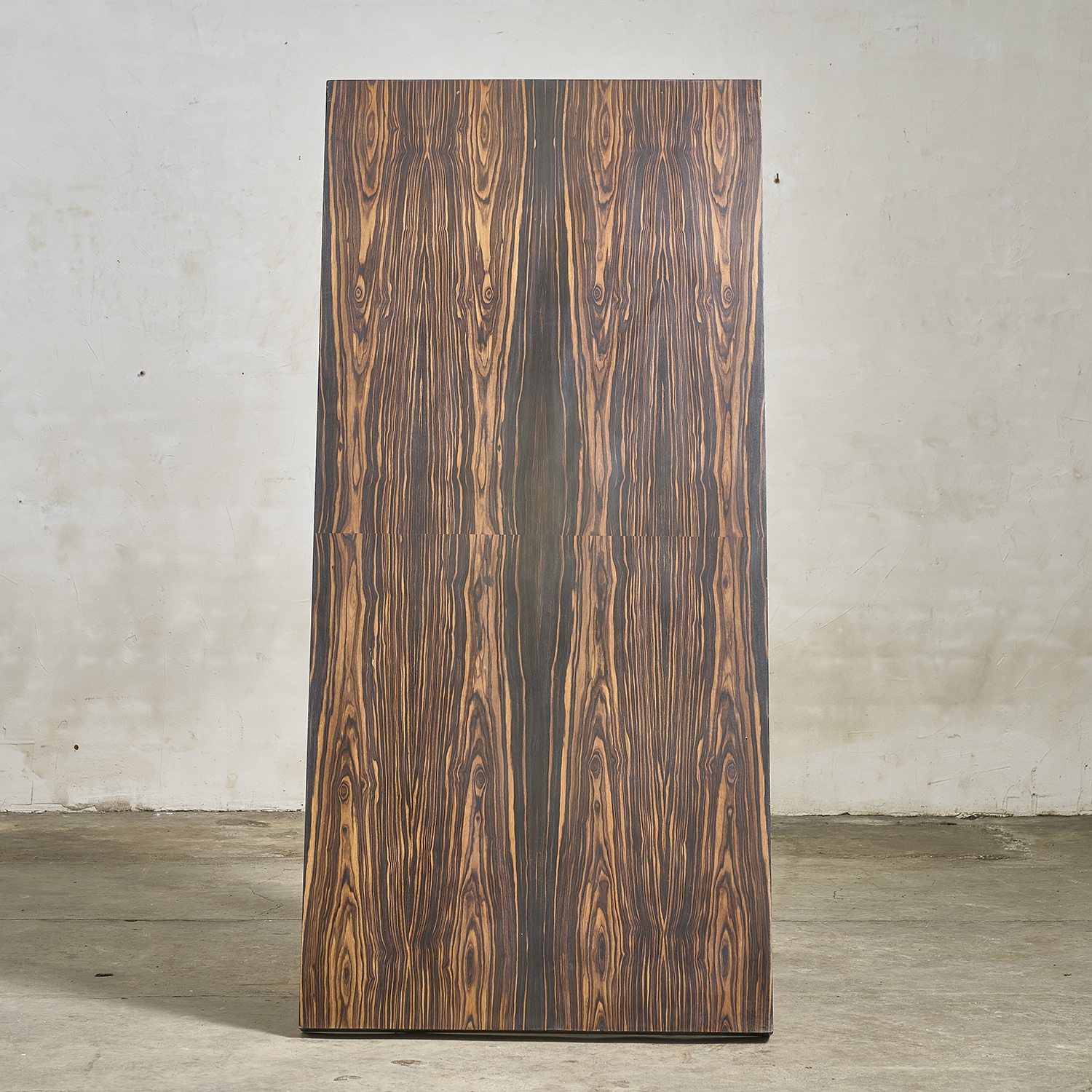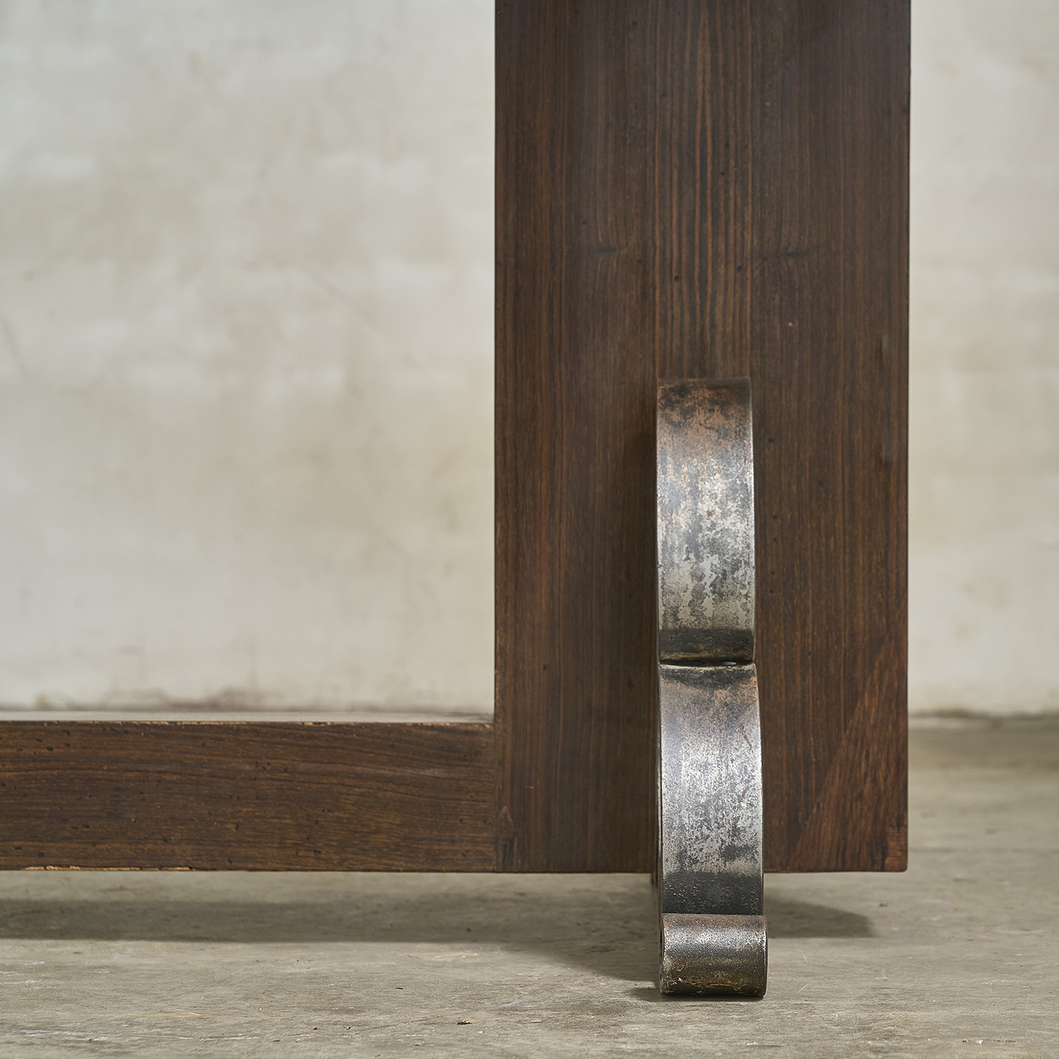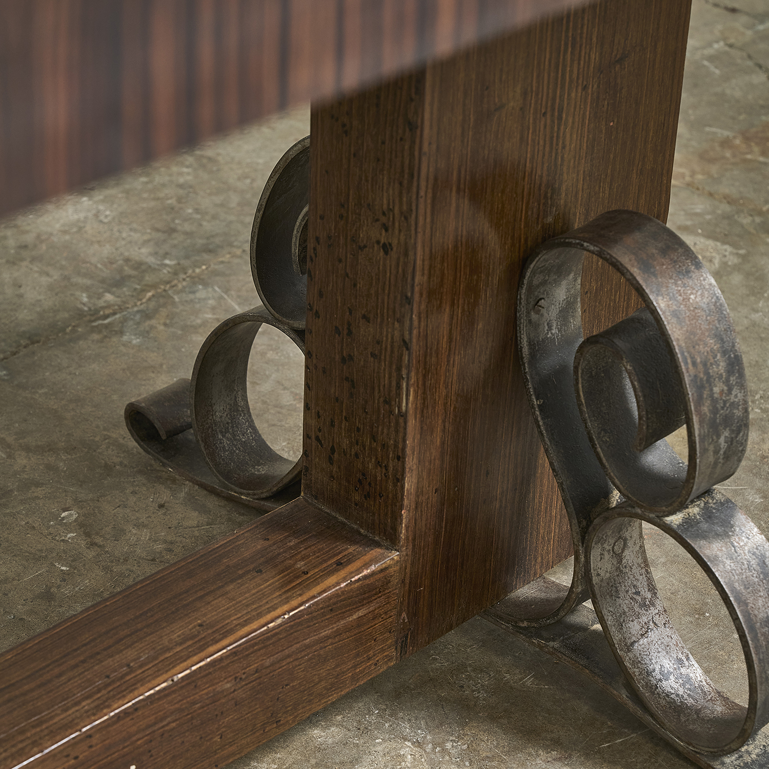 Art Deco dining table in Macassar ebony veneer, with a rosewood veneer and wrought iron base.