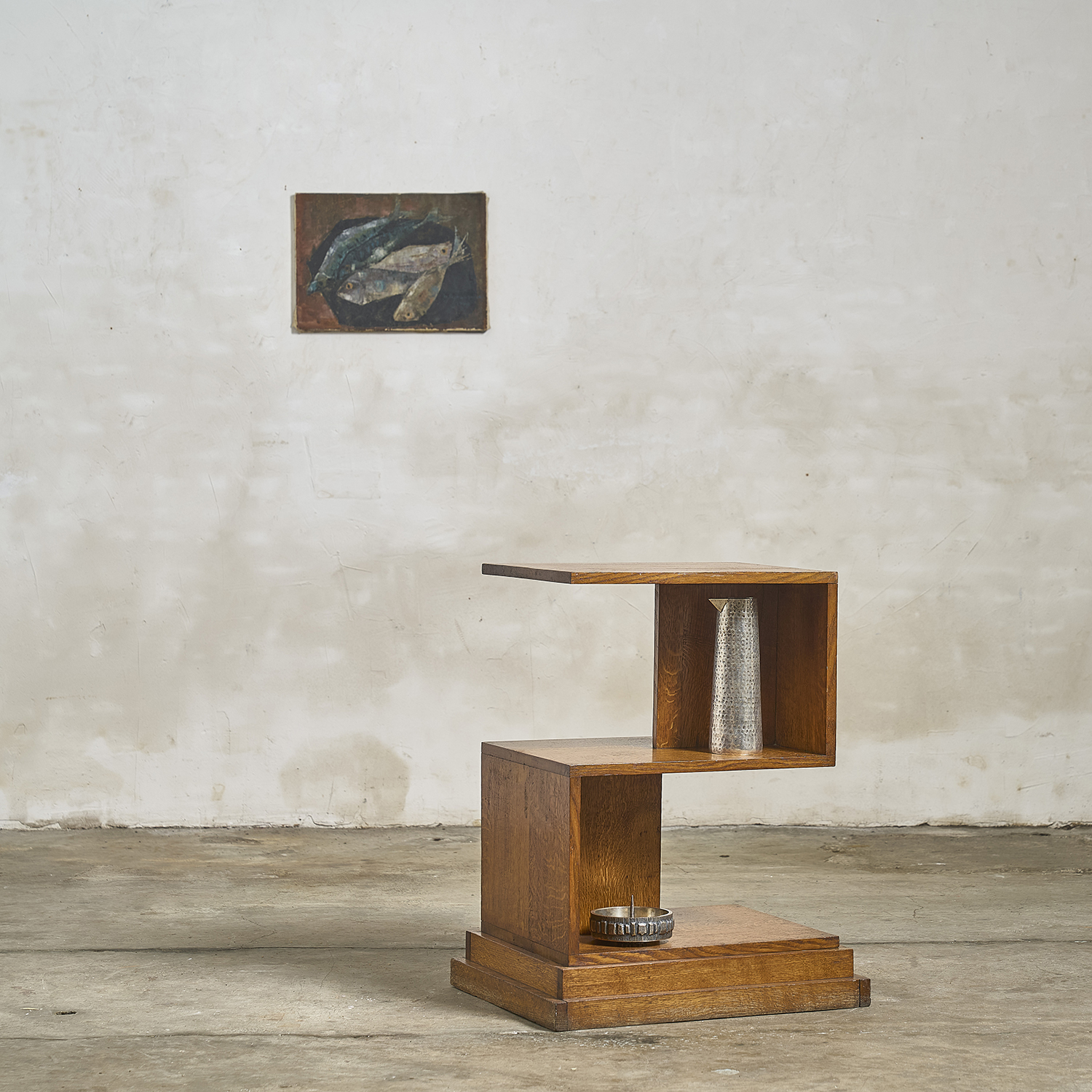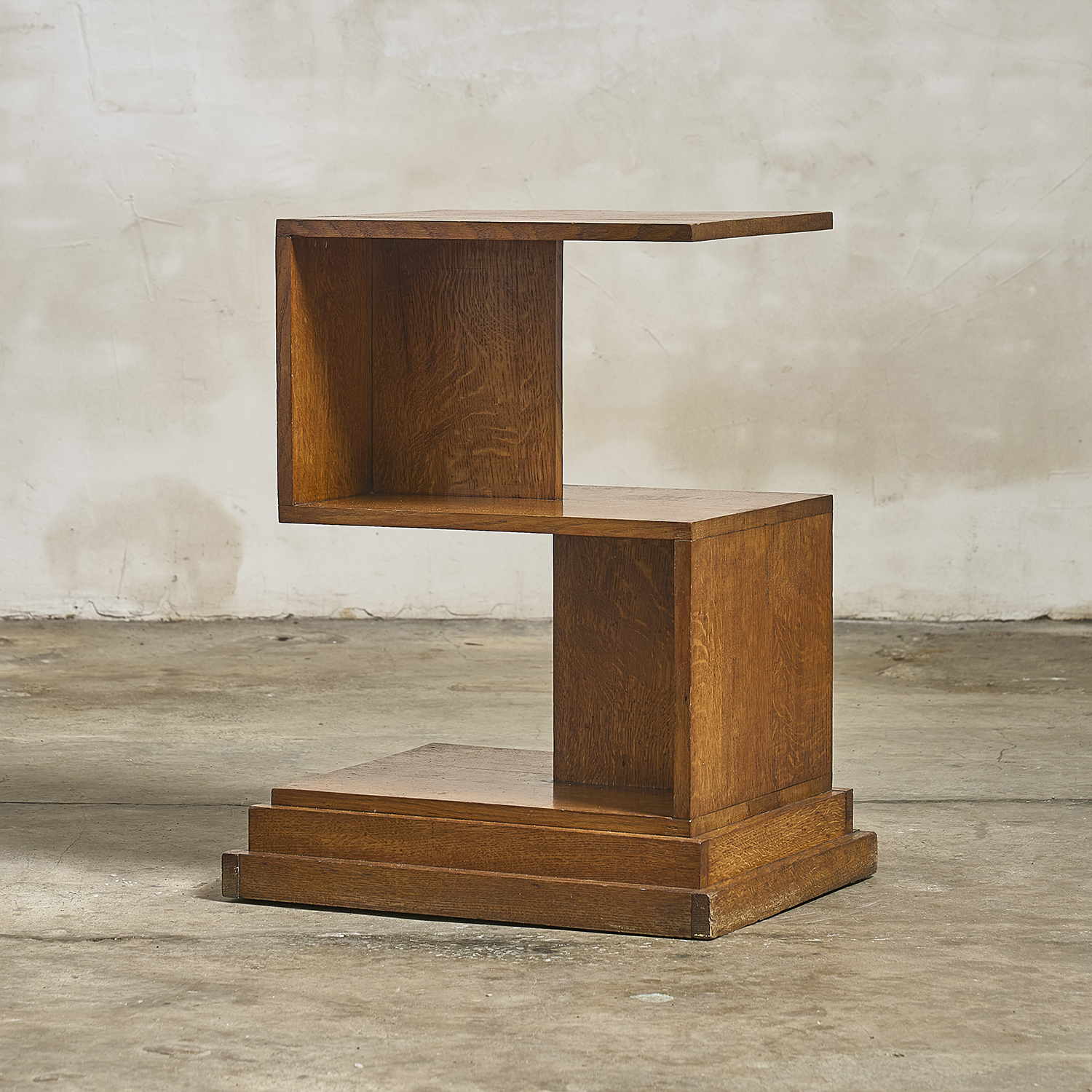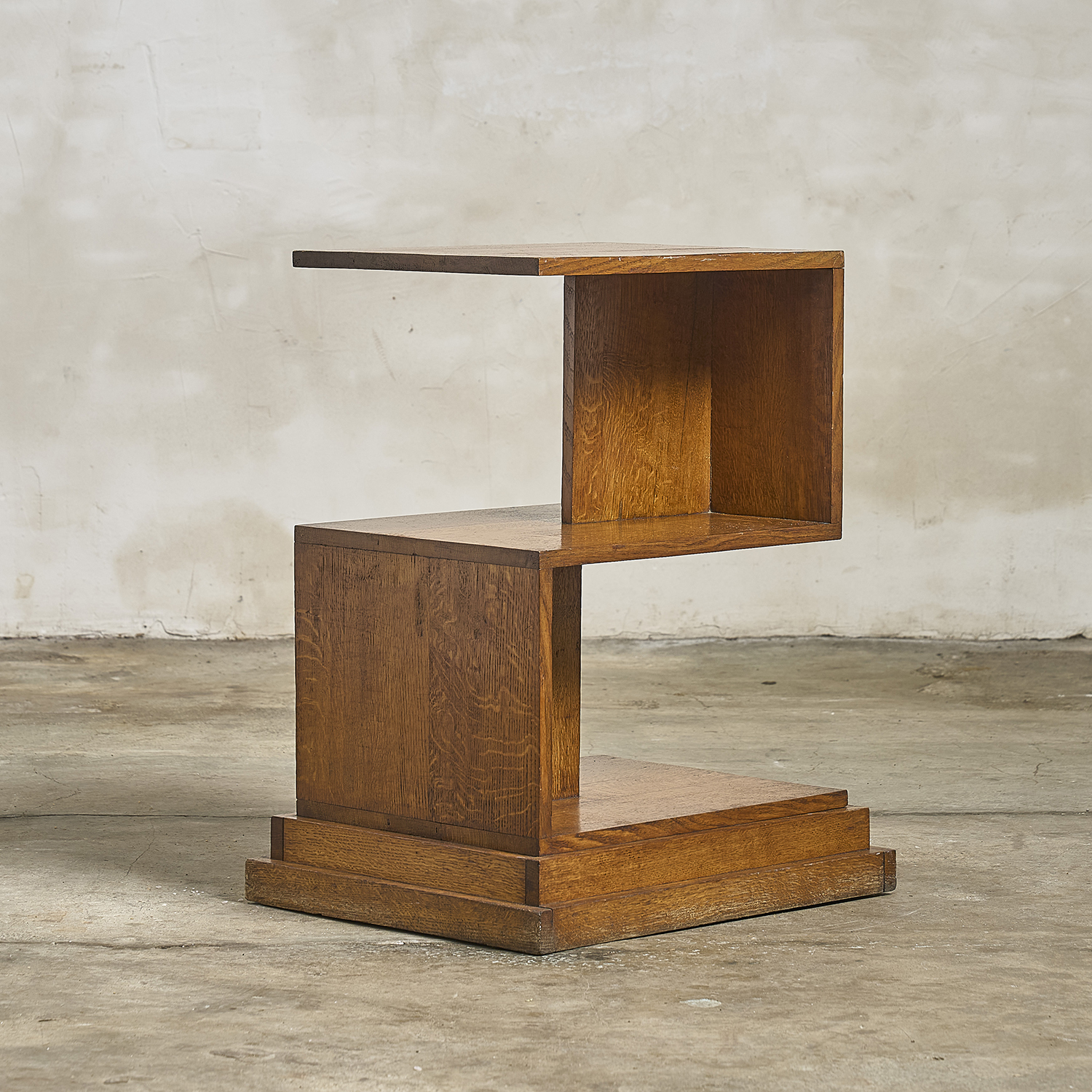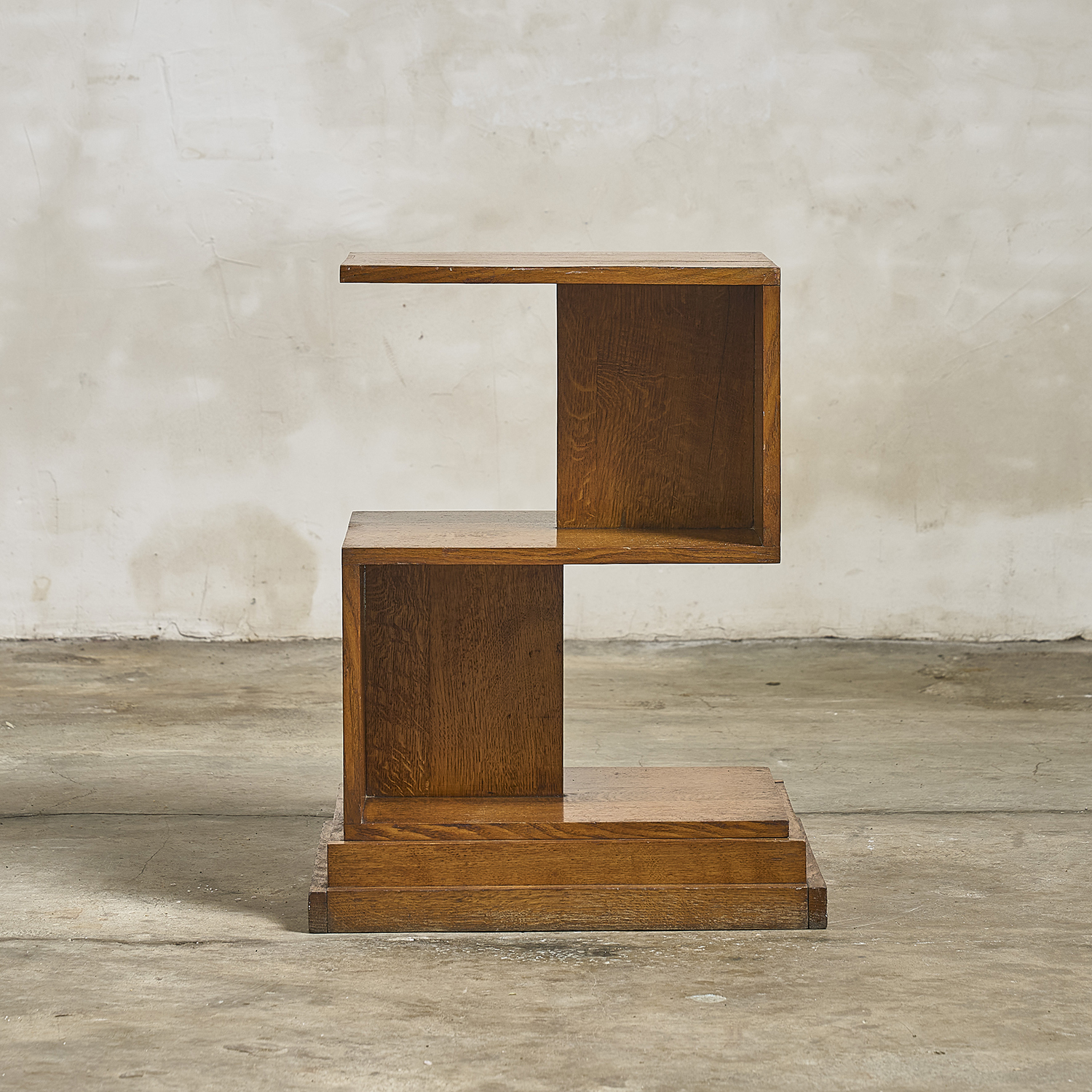 Art Deco style solid oak side table with an architectural design featuring shelves and ledges.