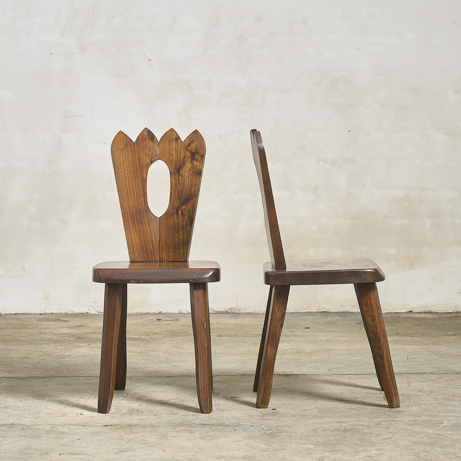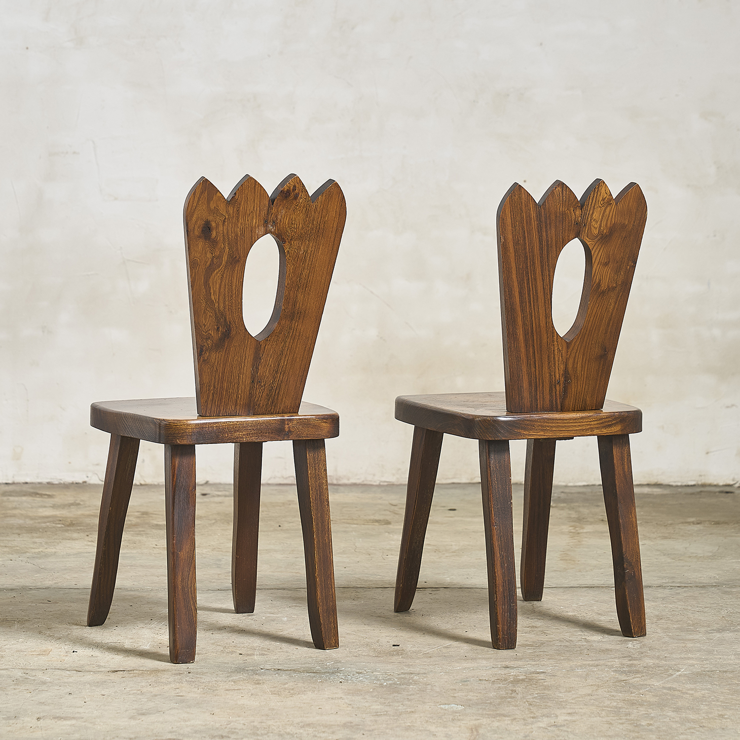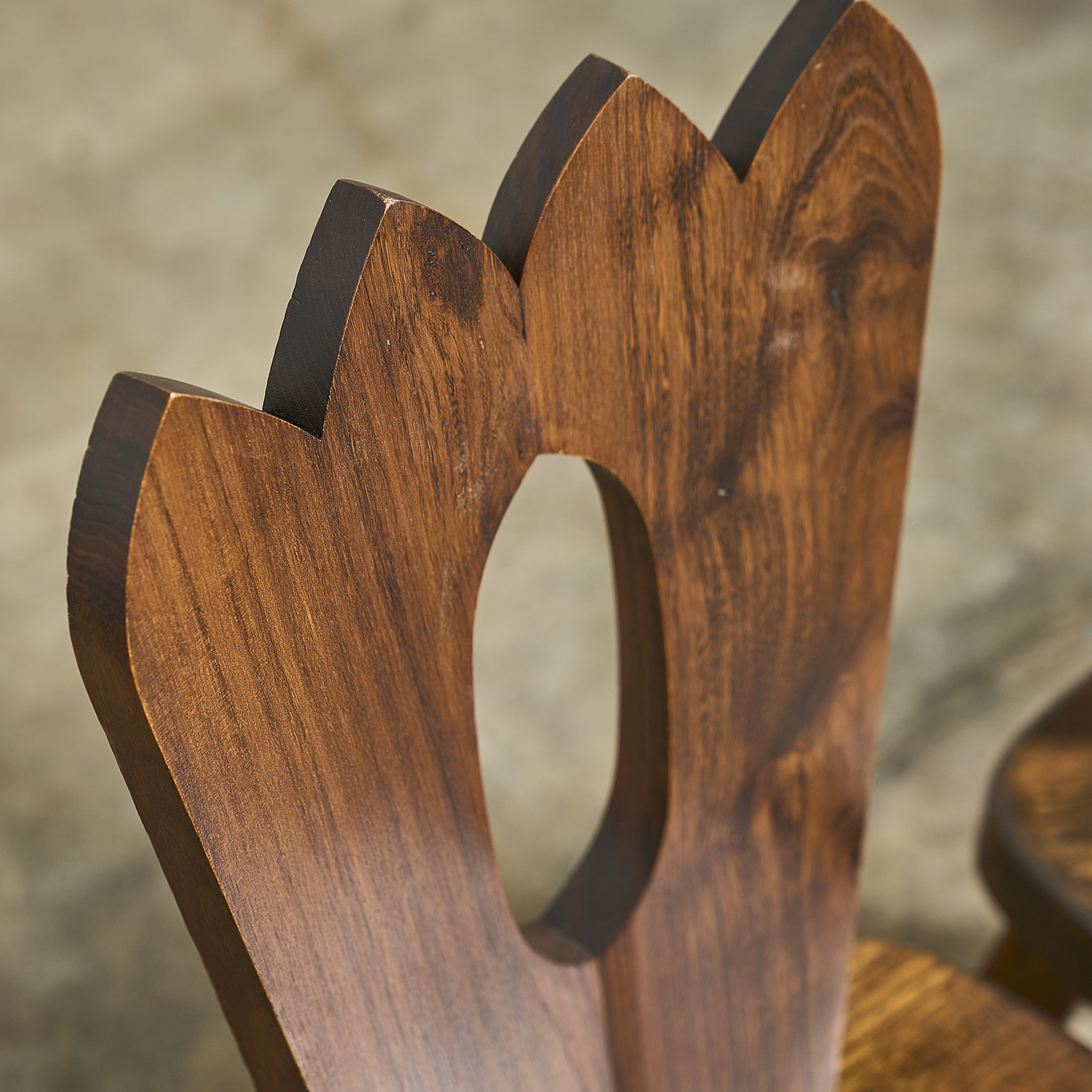 Olavi Hänninen, circa 1970. Pair of Brutalist chairs with solid elm frames, openwork backs, and crown-shaped cutouts.