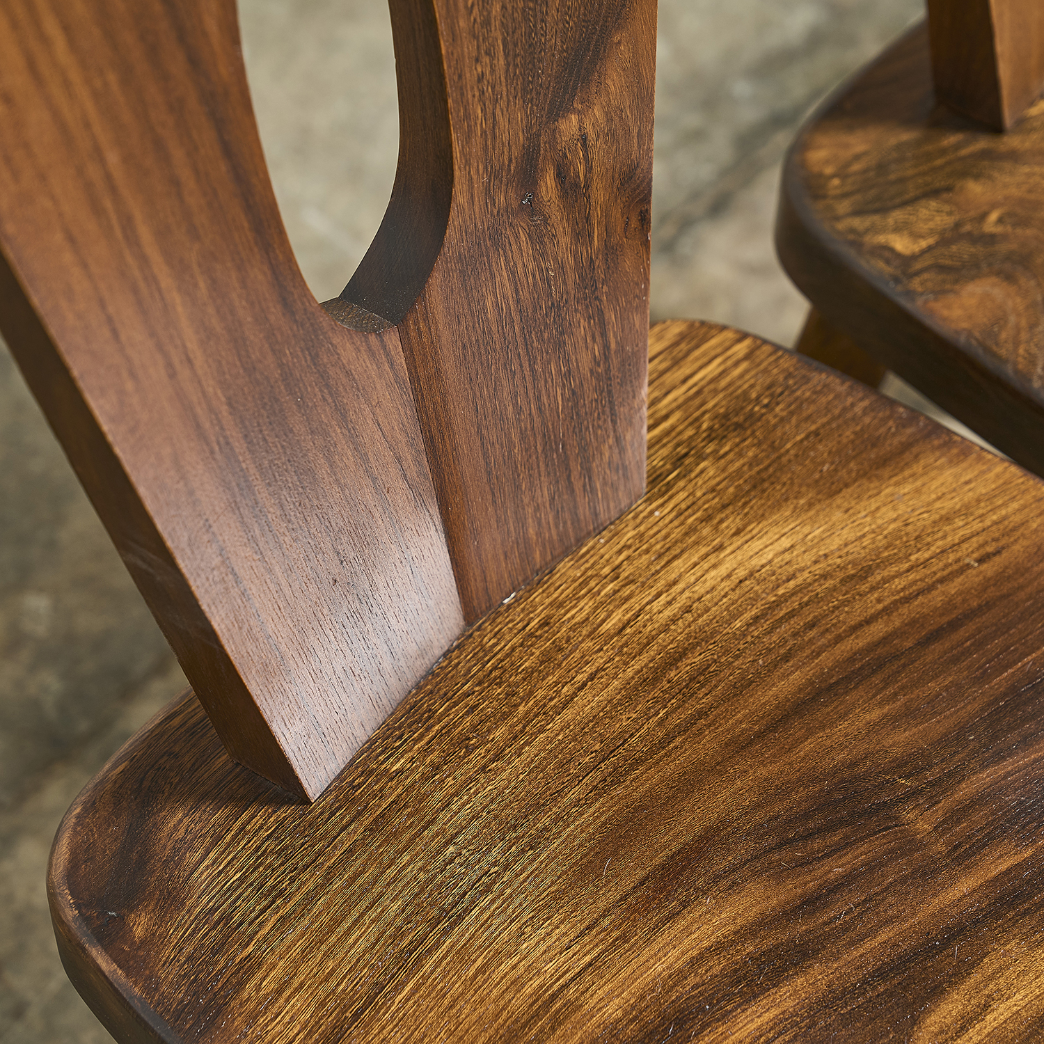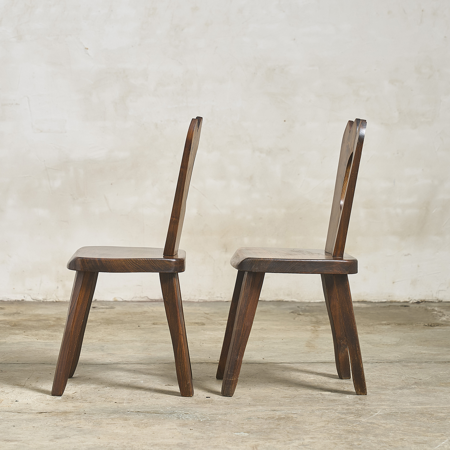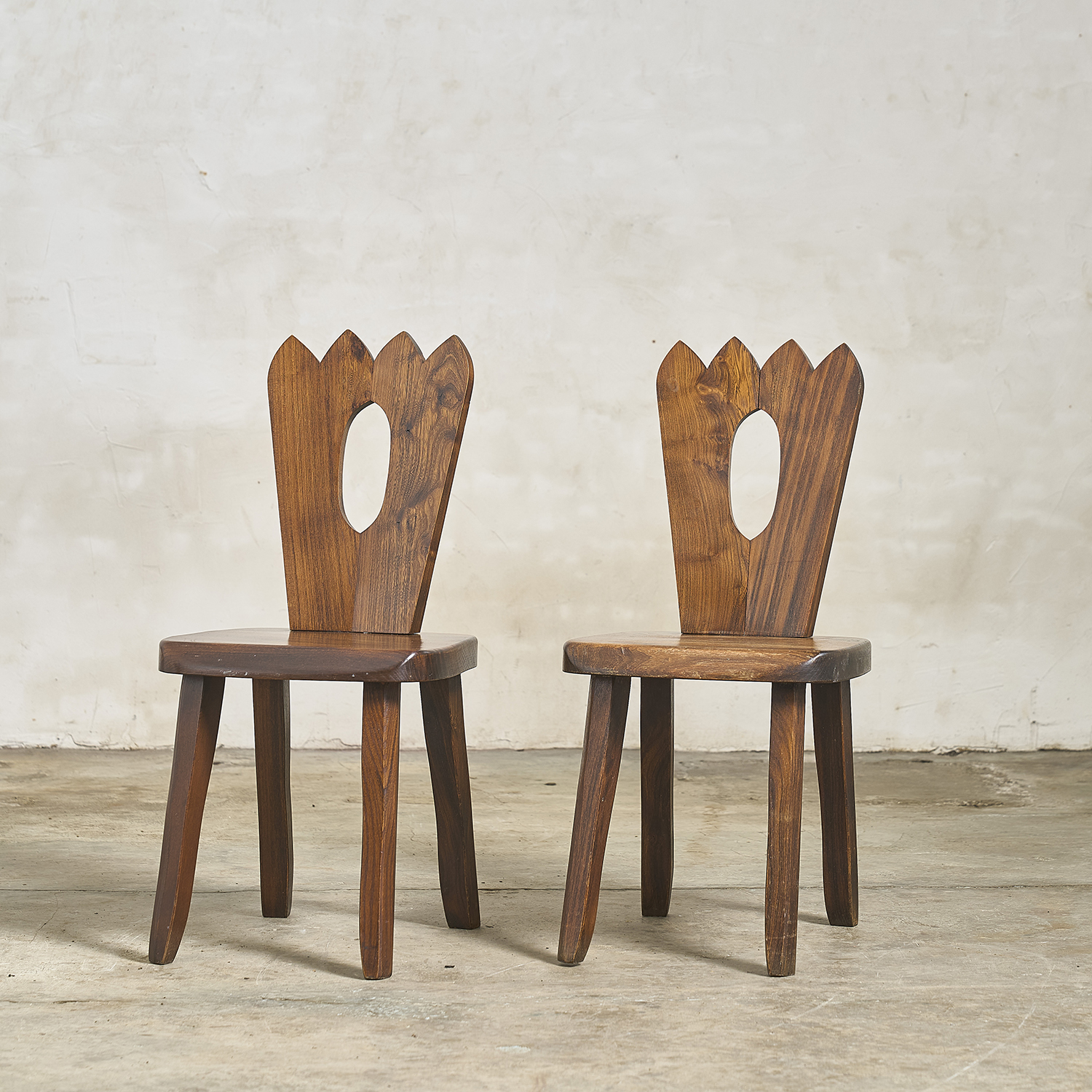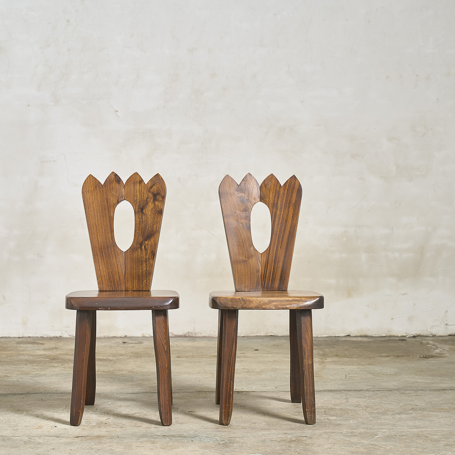 Olavi Hänninen, circa 1970. Pair of Brutalist chairs with solid elm frames, openwork backs, and crown-shaped cutouts.