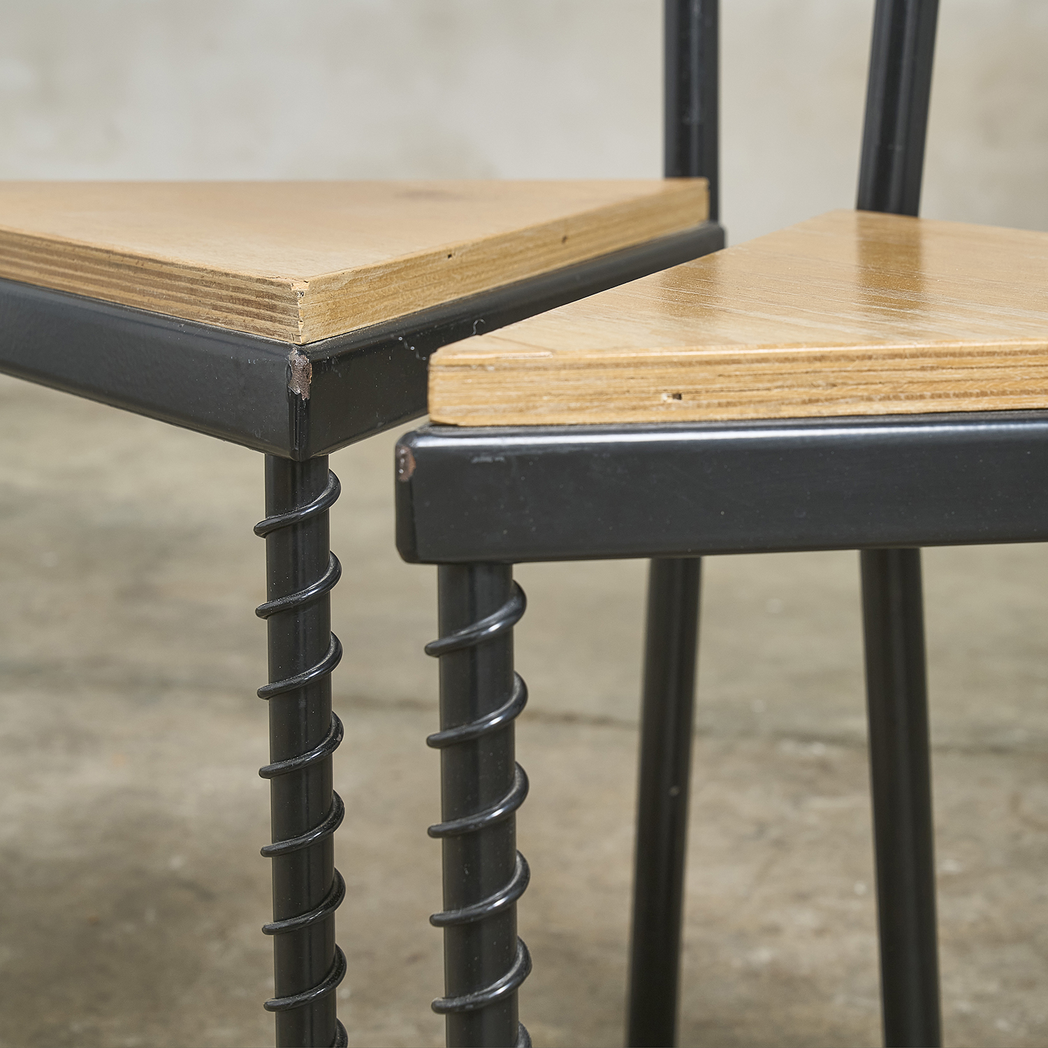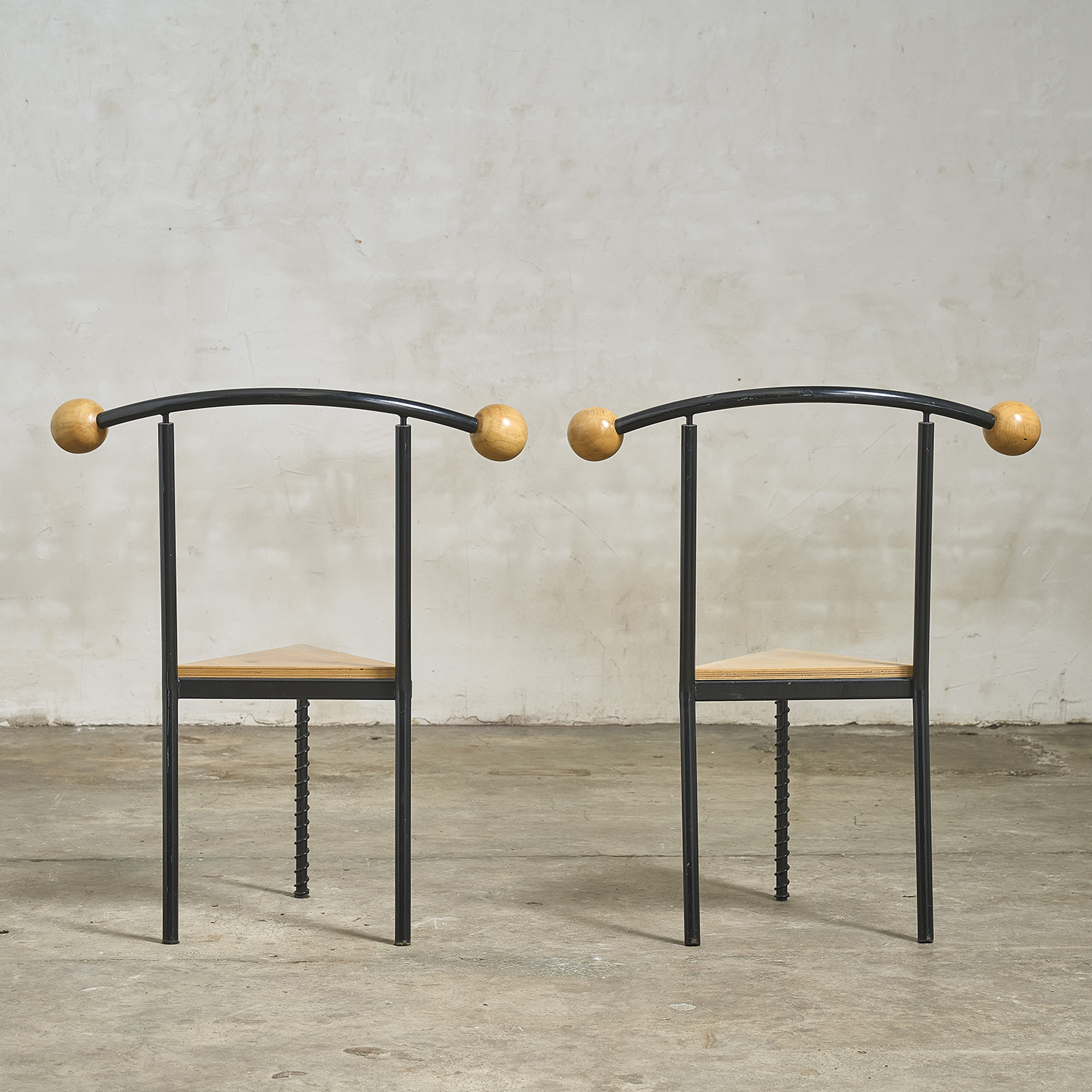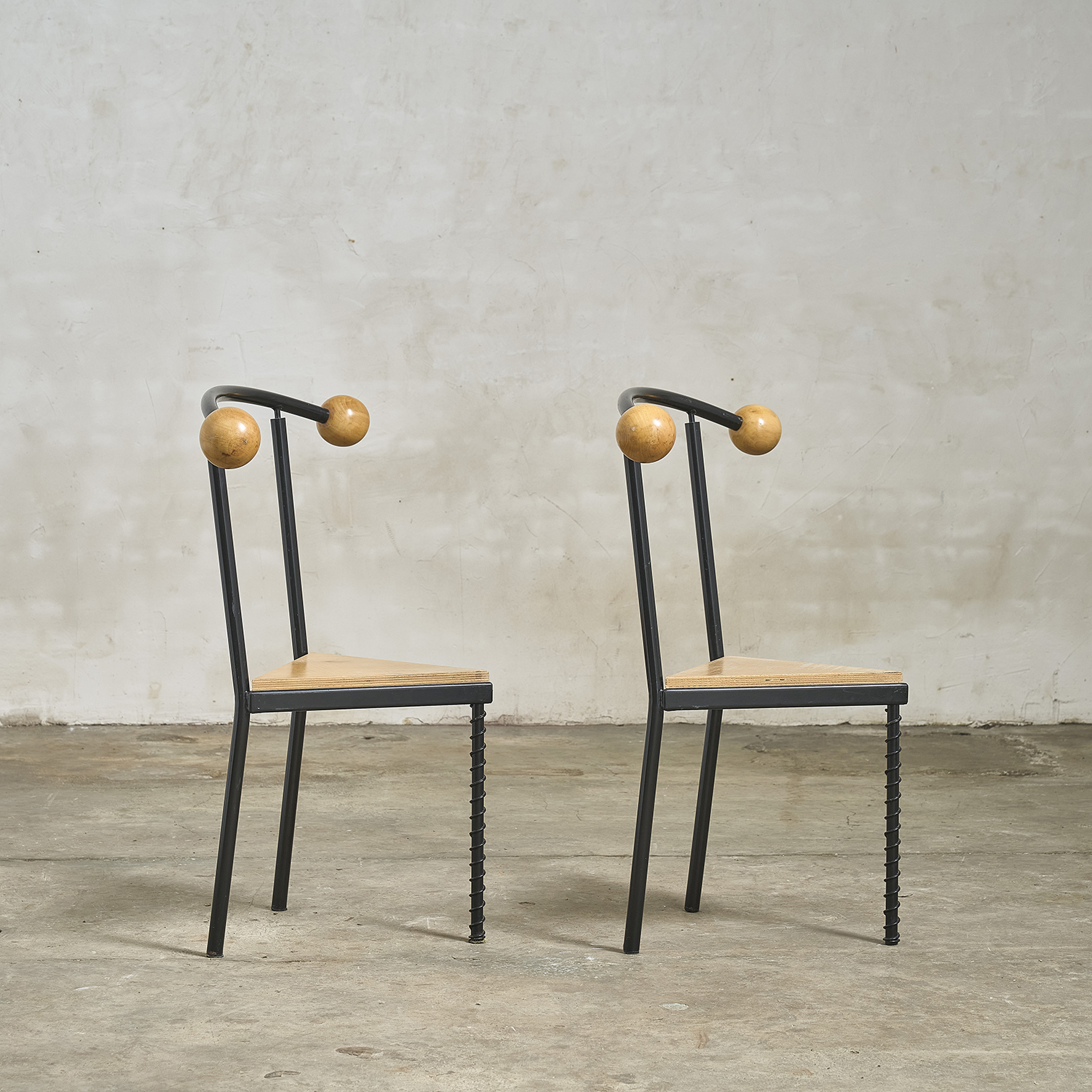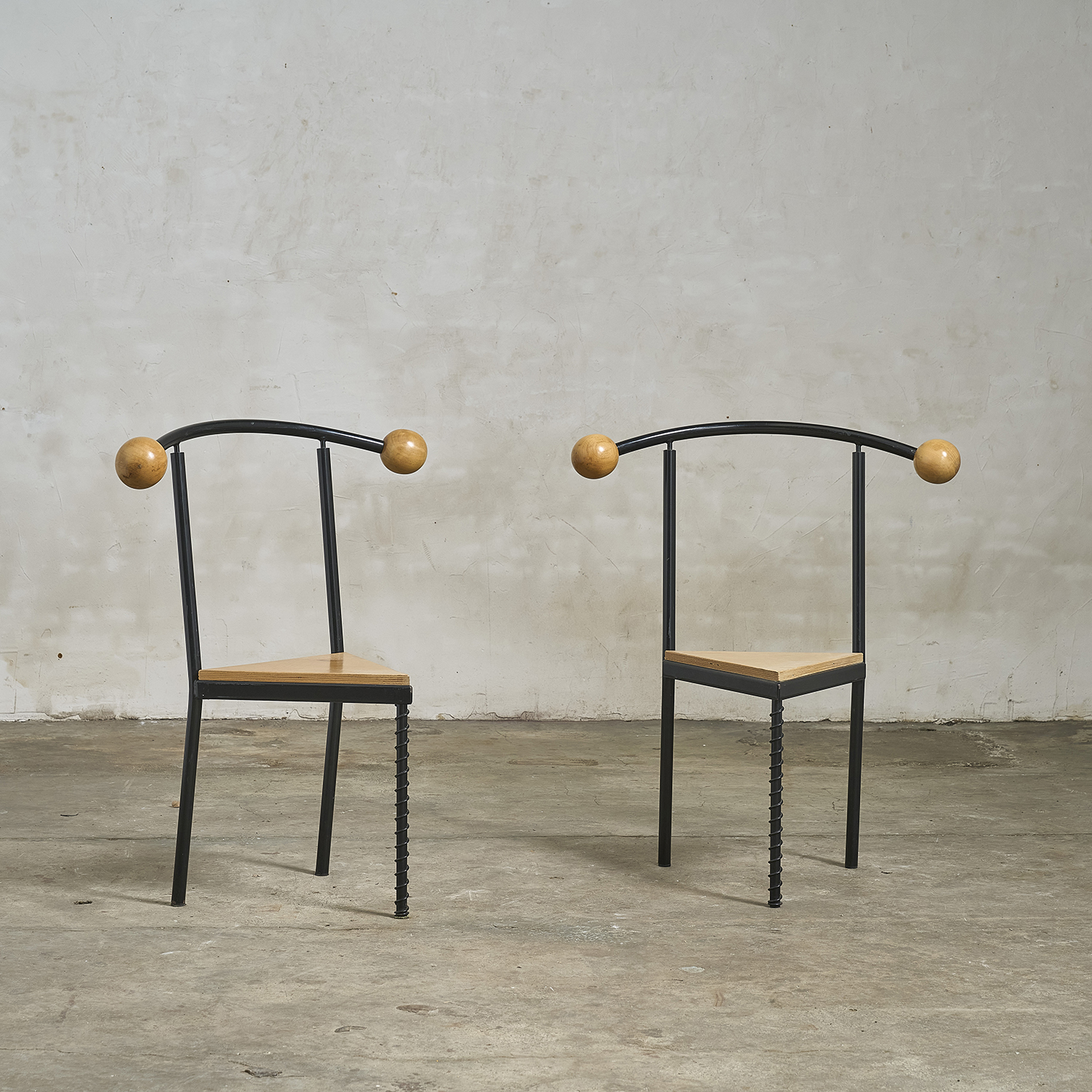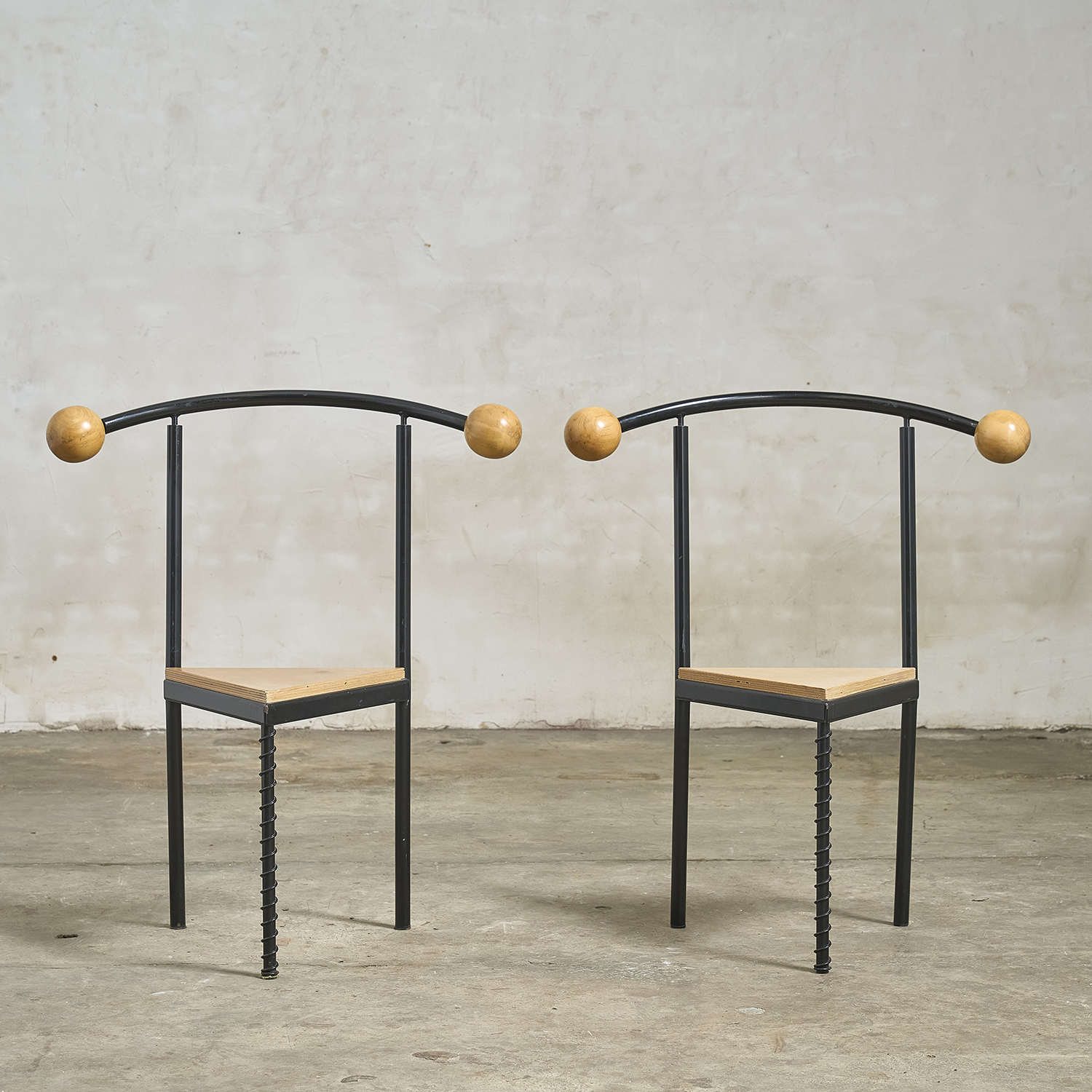 In the style of Philippe Starck, a pair of chairs with a postmodern design reminiscent of the 1980s.