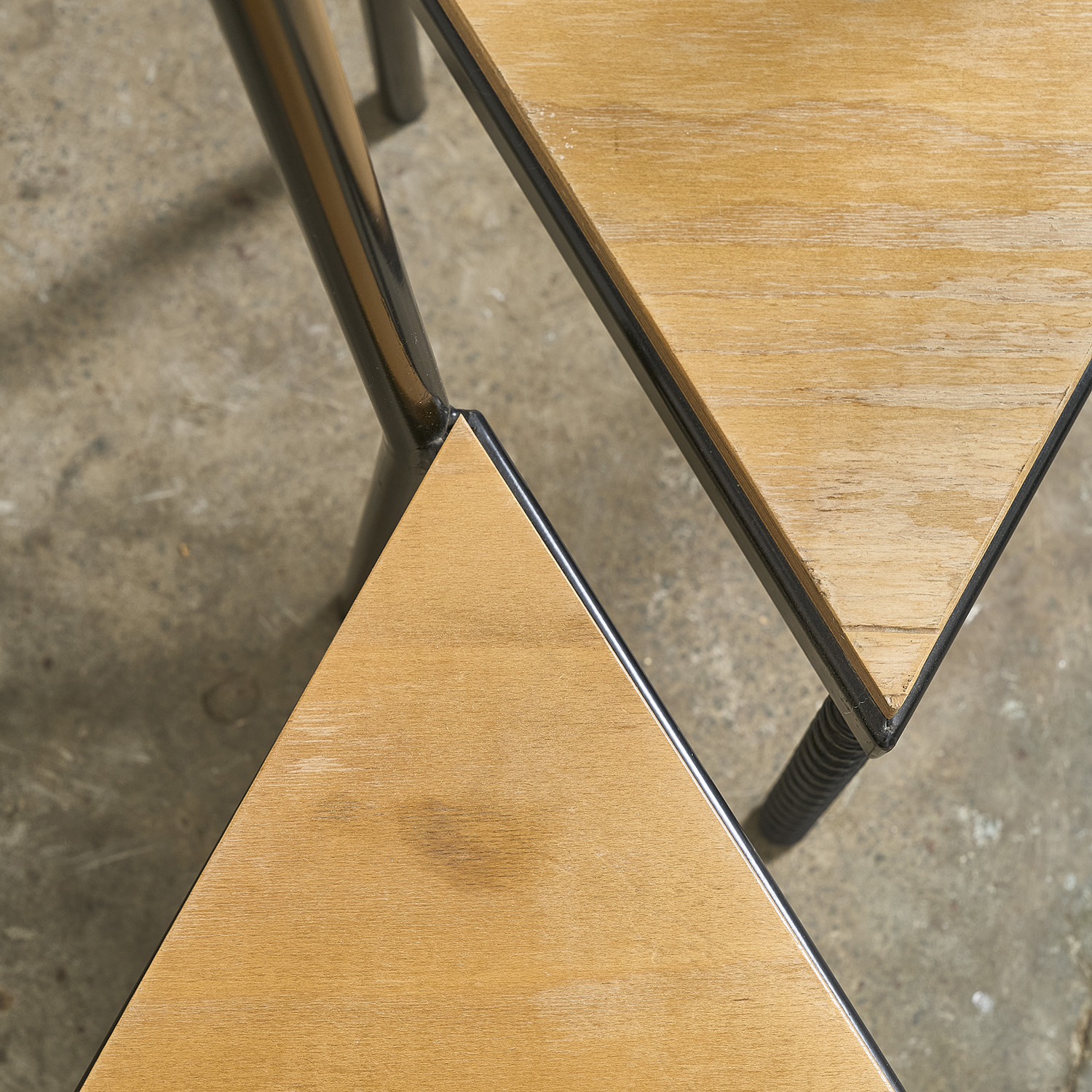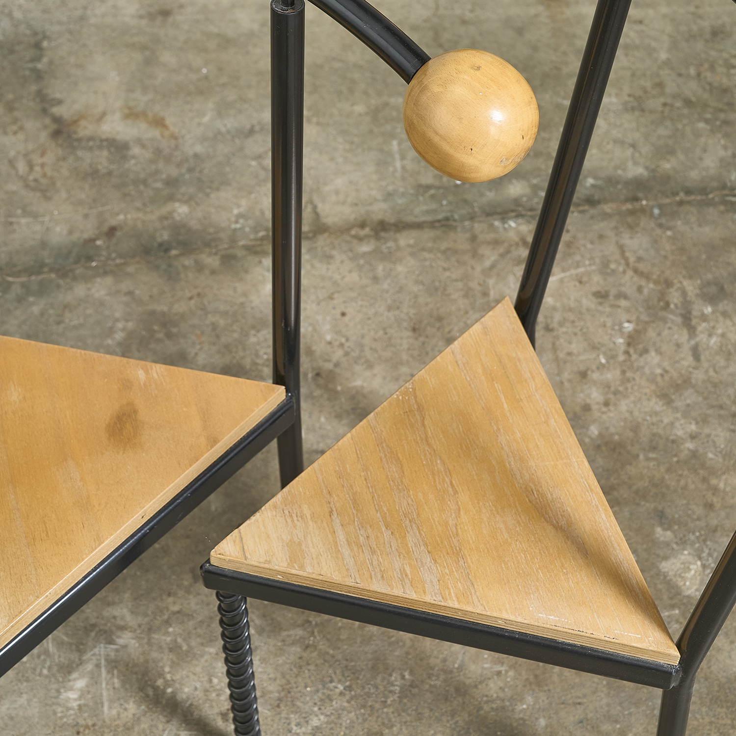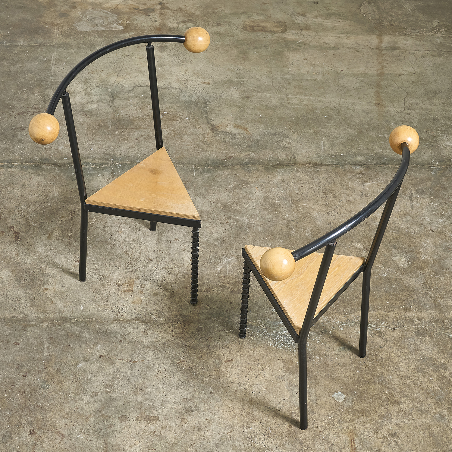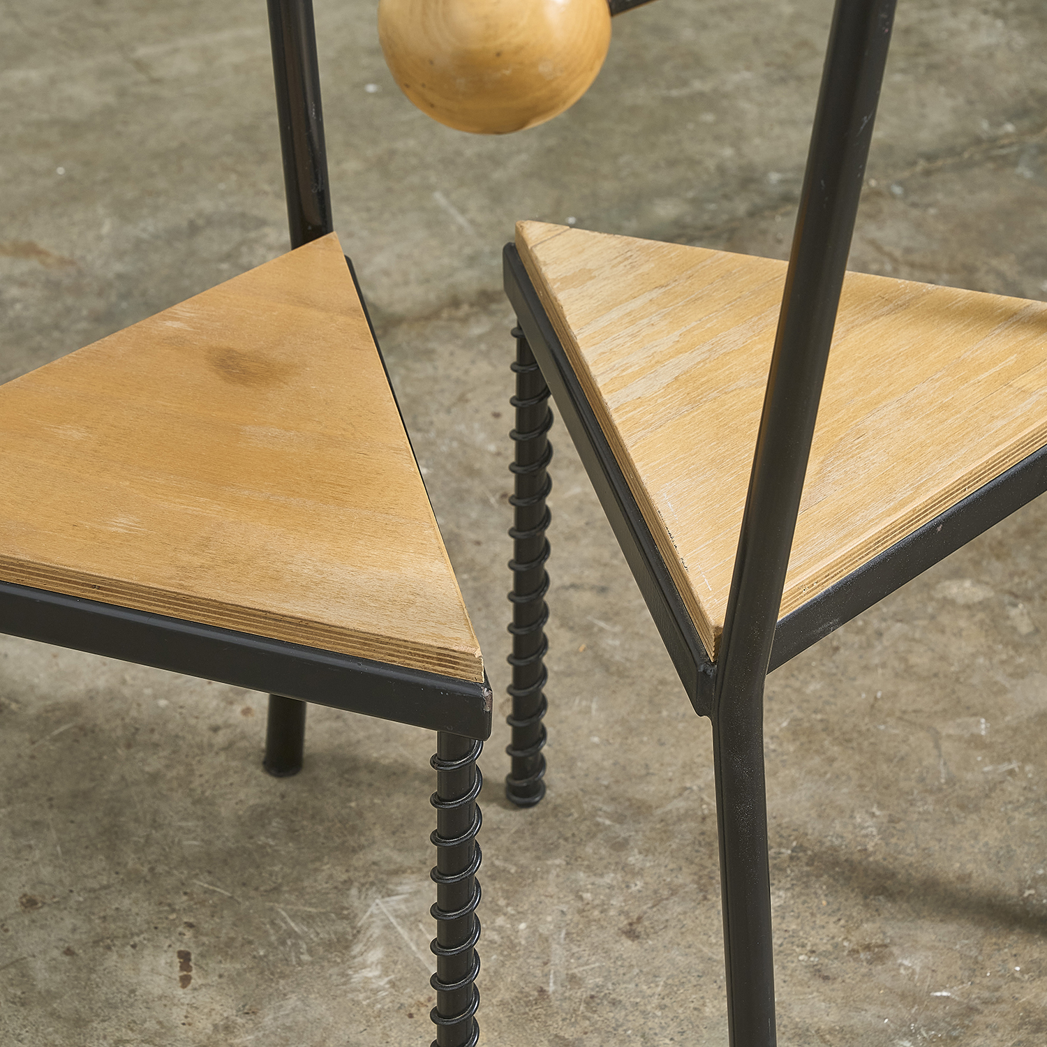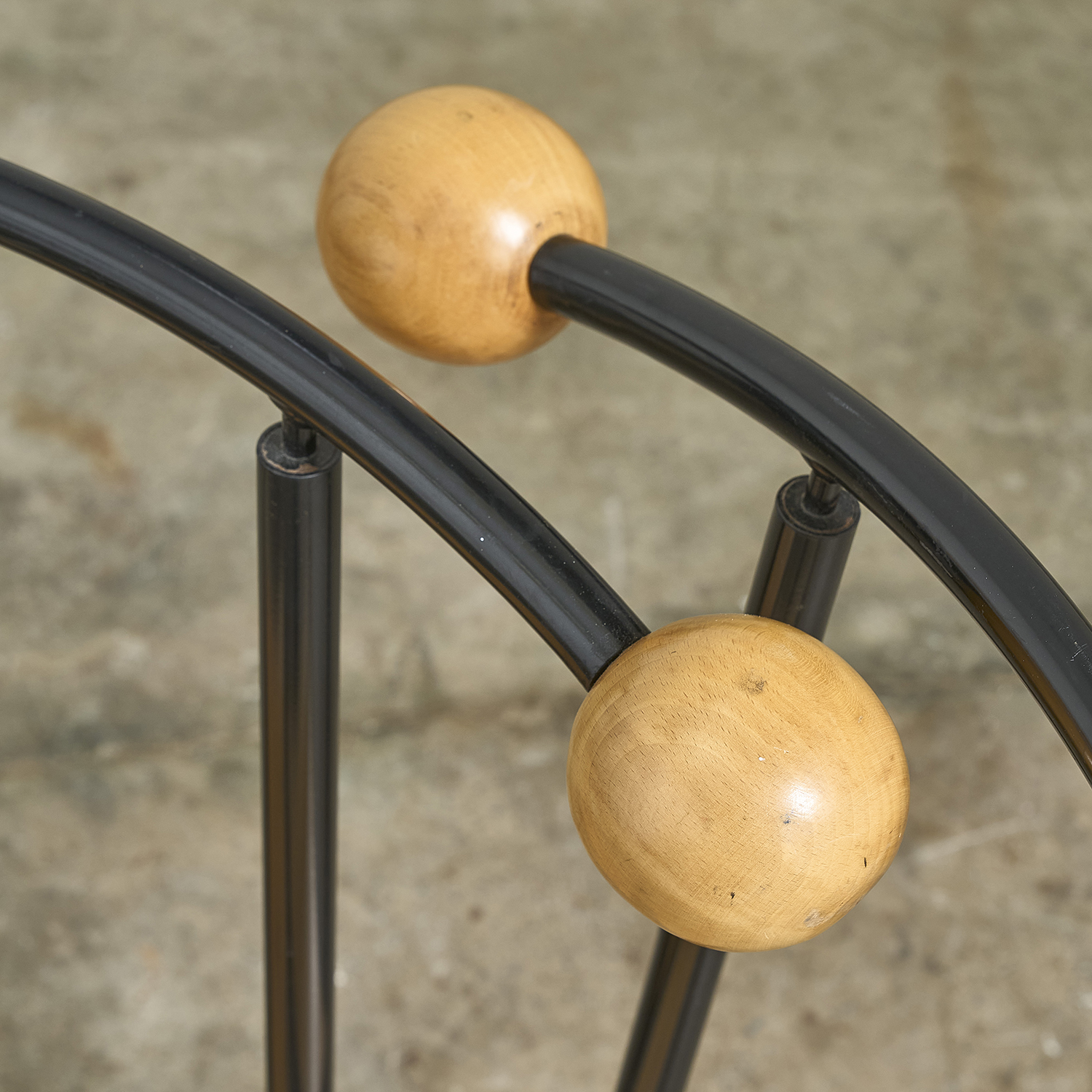 Lacquered metal frame, triangular wooden seat, and wide backrest adorned with two large wooden balls.