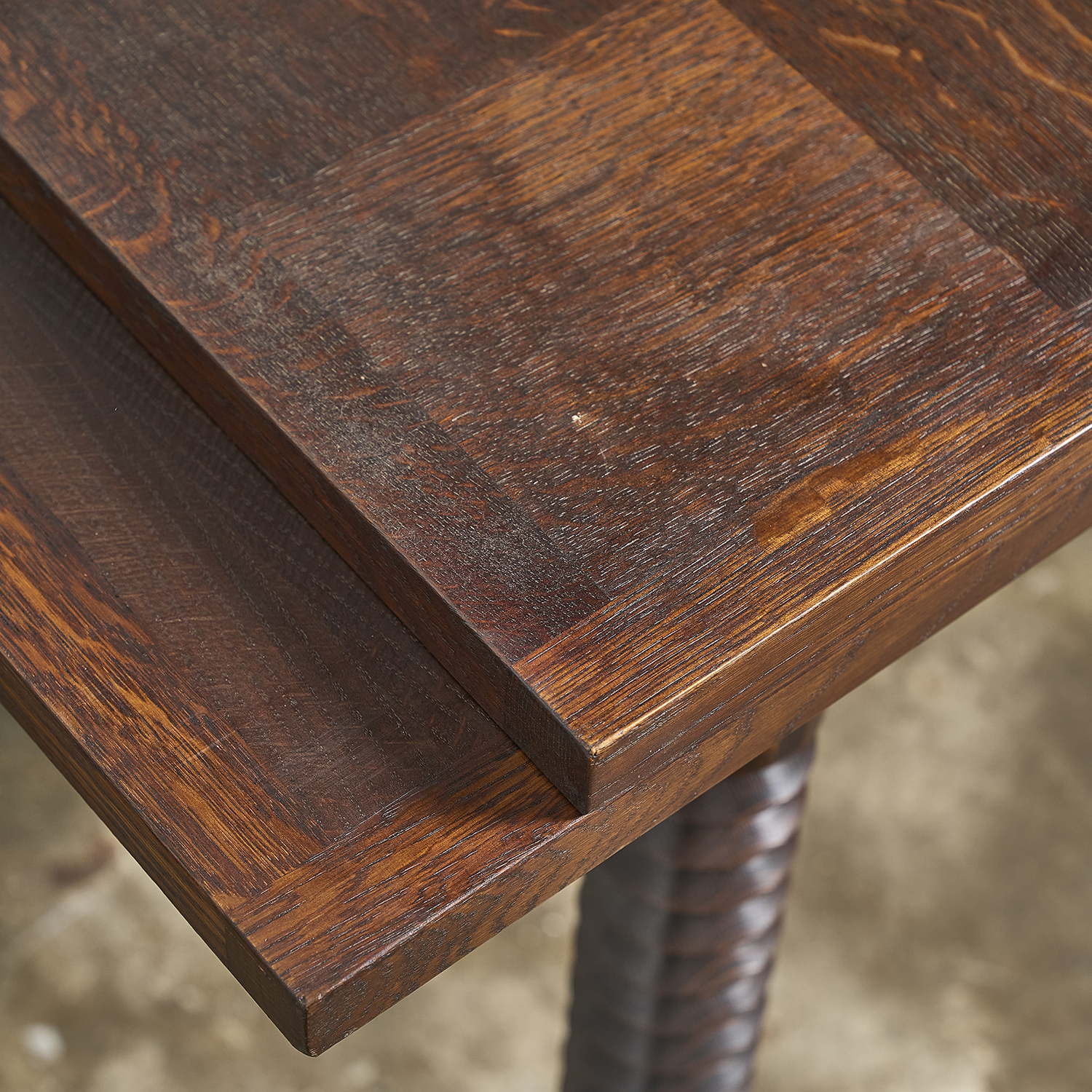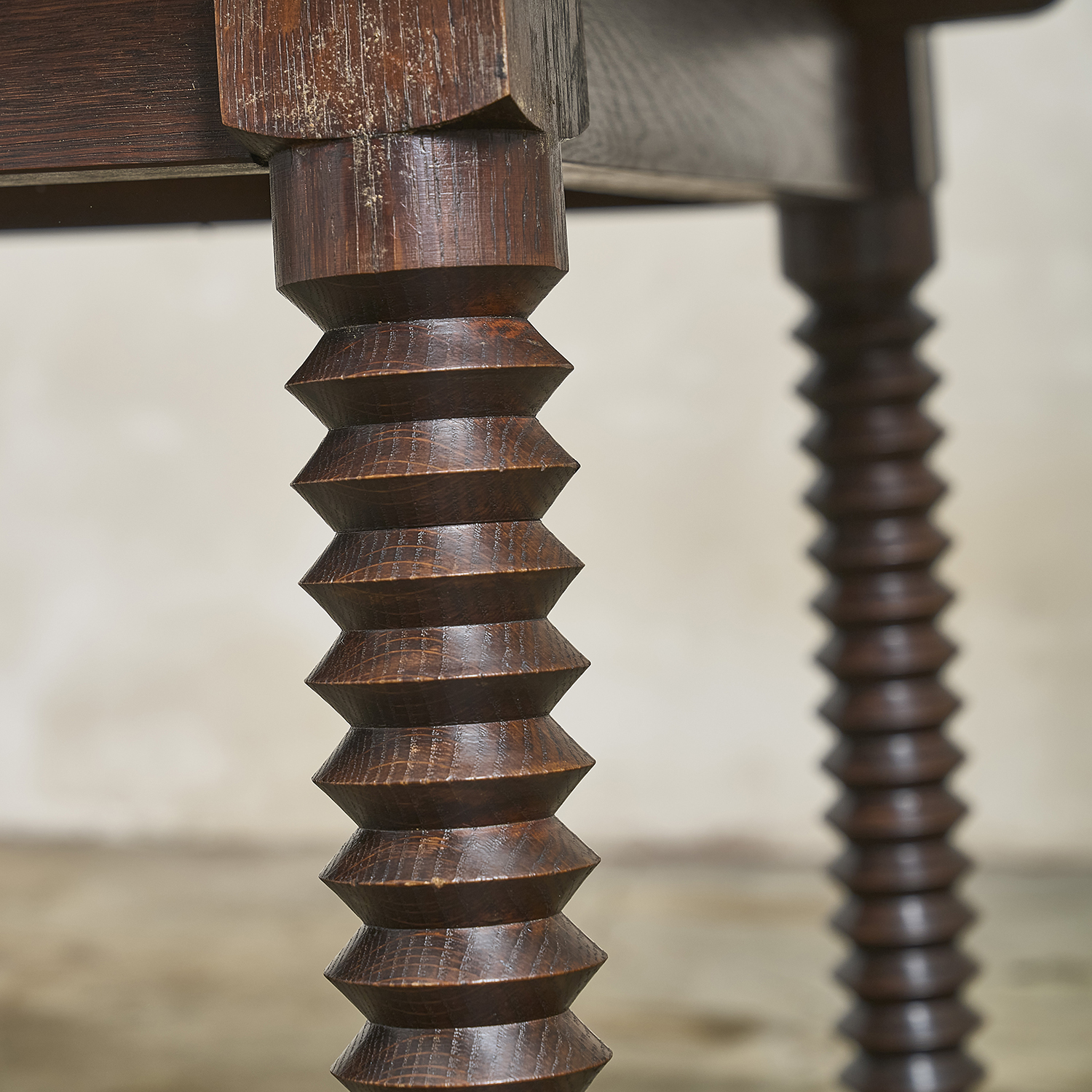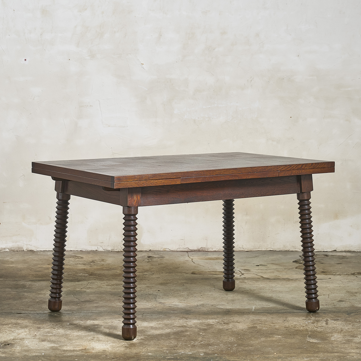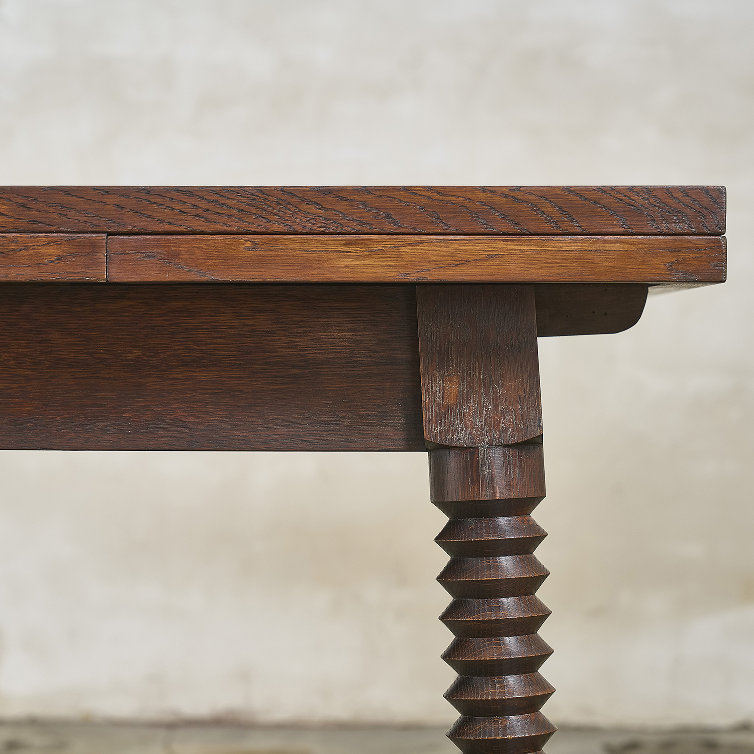Stained oak dining table with a rectangular top resting on four carved, angled legs. France, circa 1940/50.