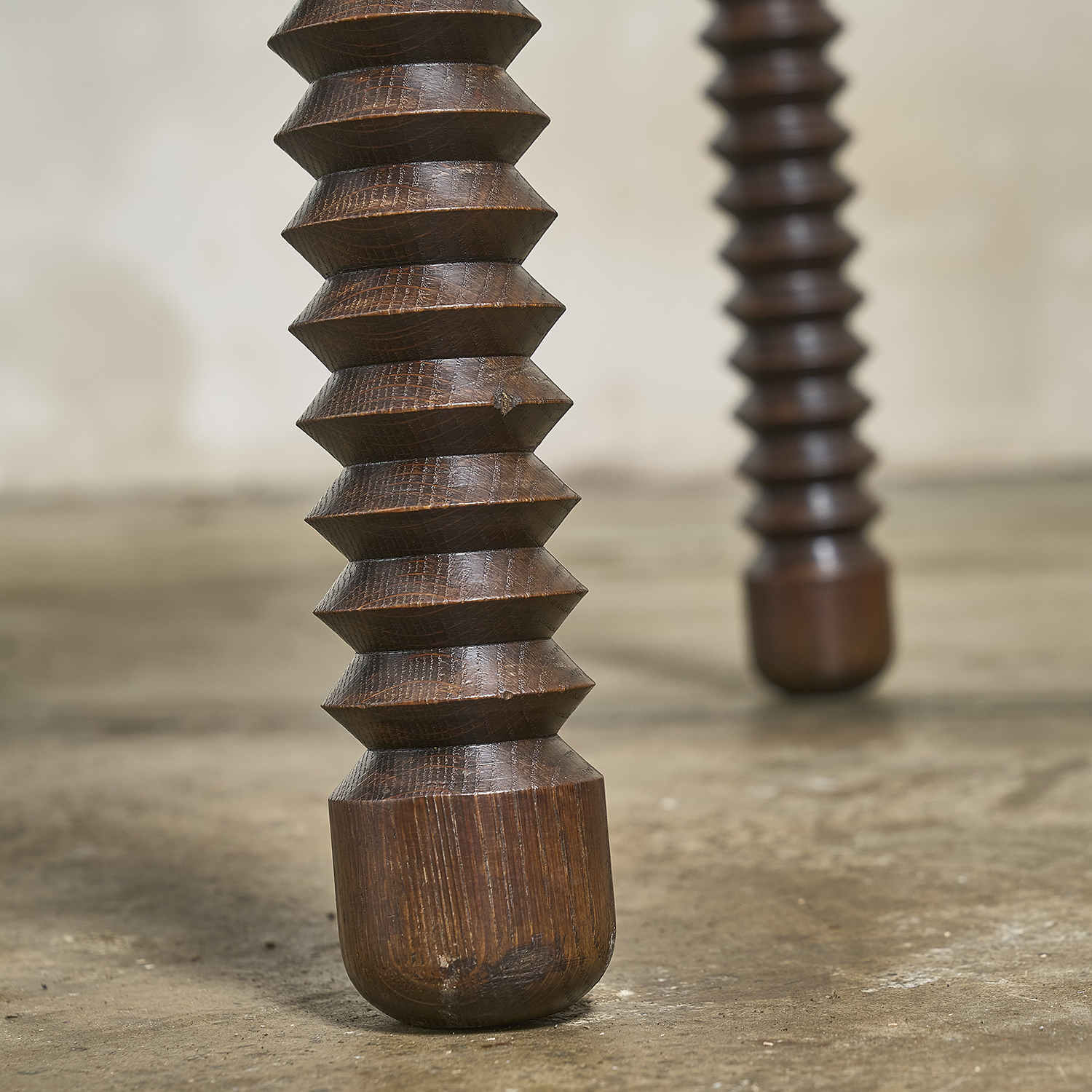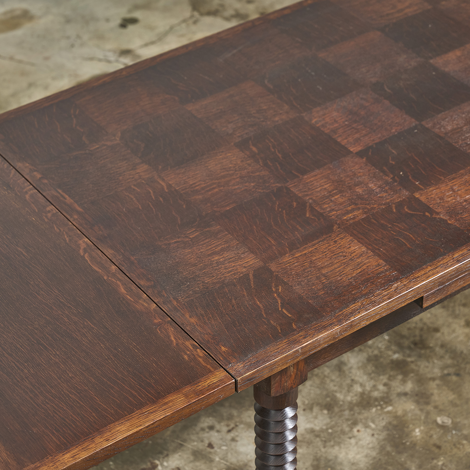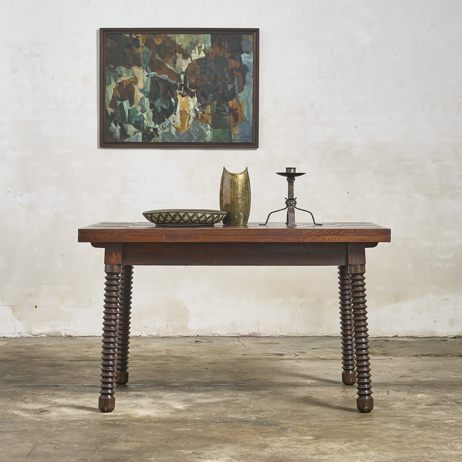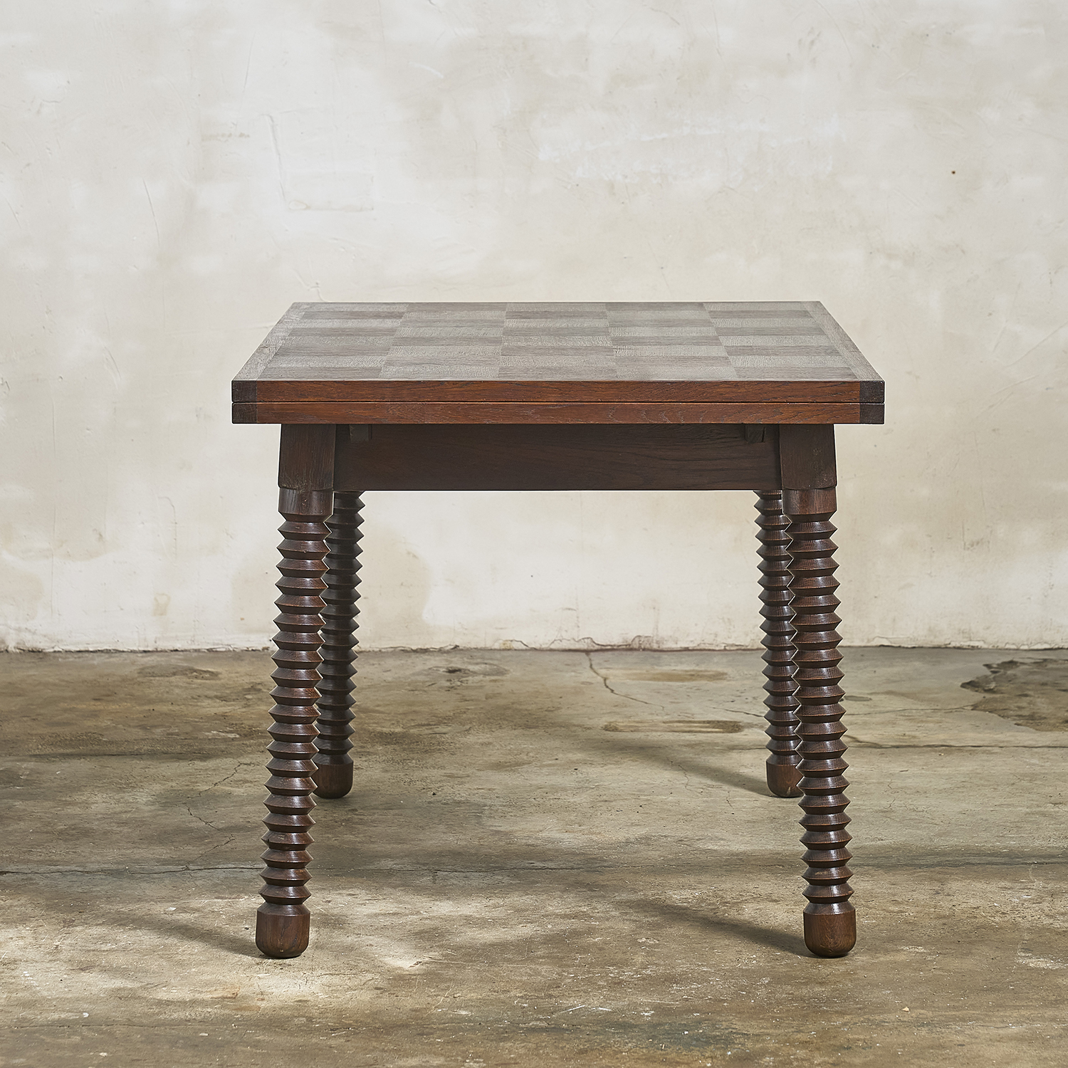 Stained oak dining table with a rectangular top resting on four carved, angled legs. France, circa 1940/50.