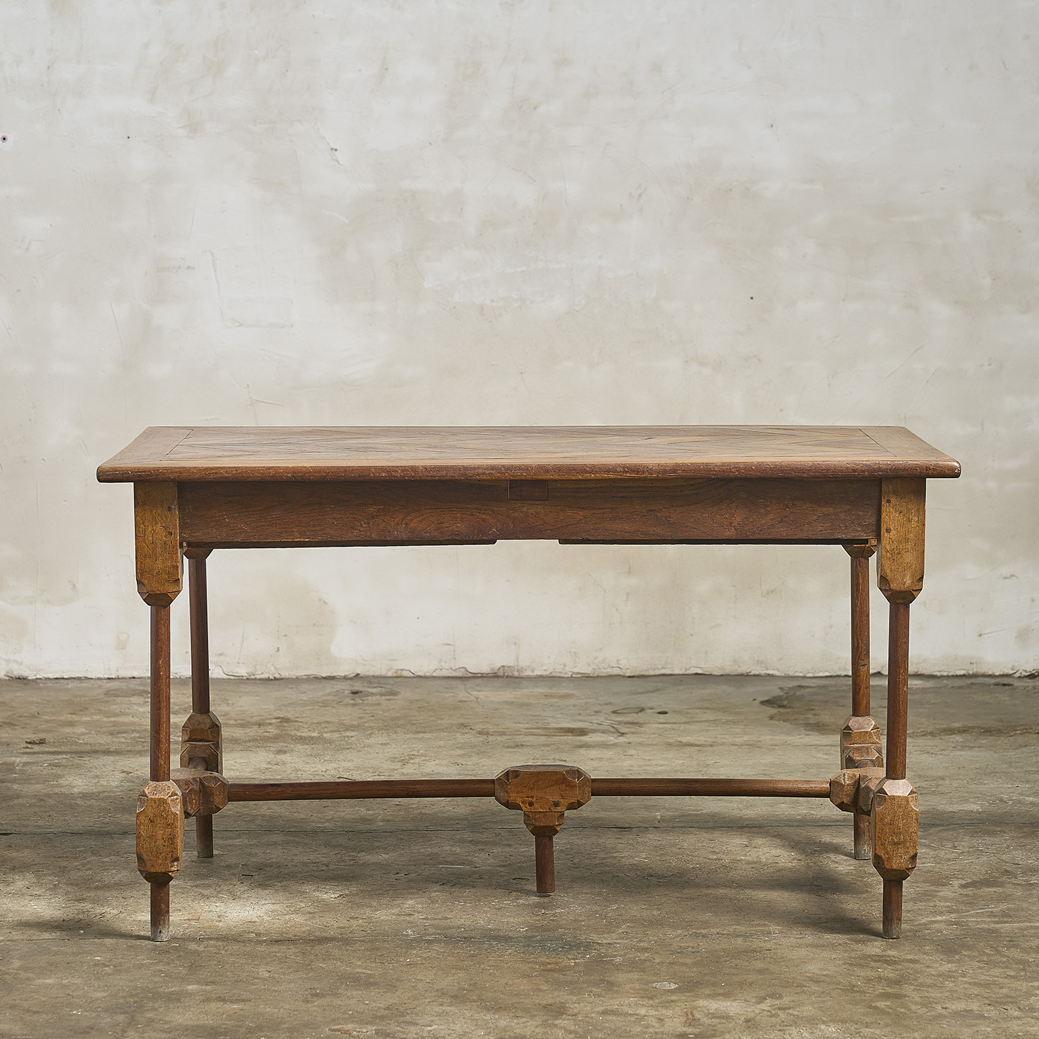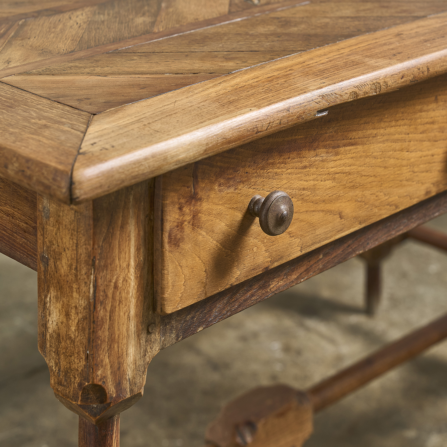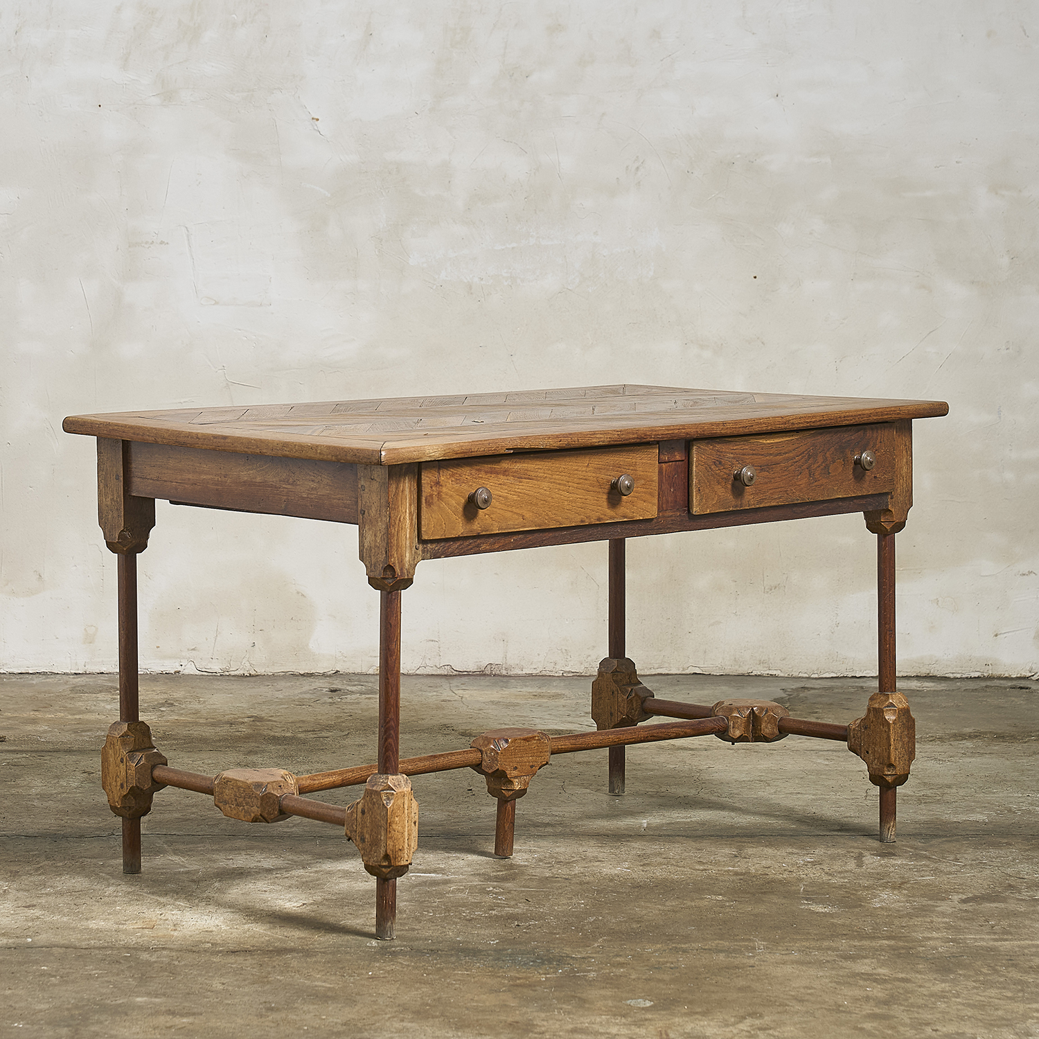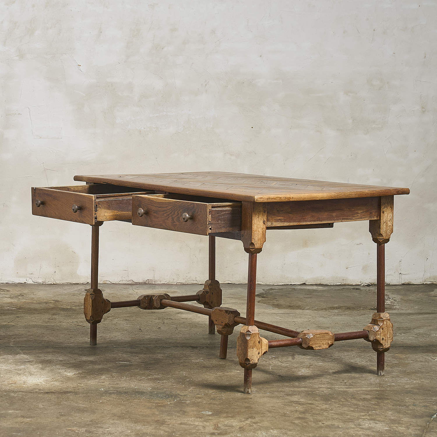 An unusual wooden desk with two drawers in the frieze. The rectangular herringbone top rests on four cylindrical feet joined by a stretcher.