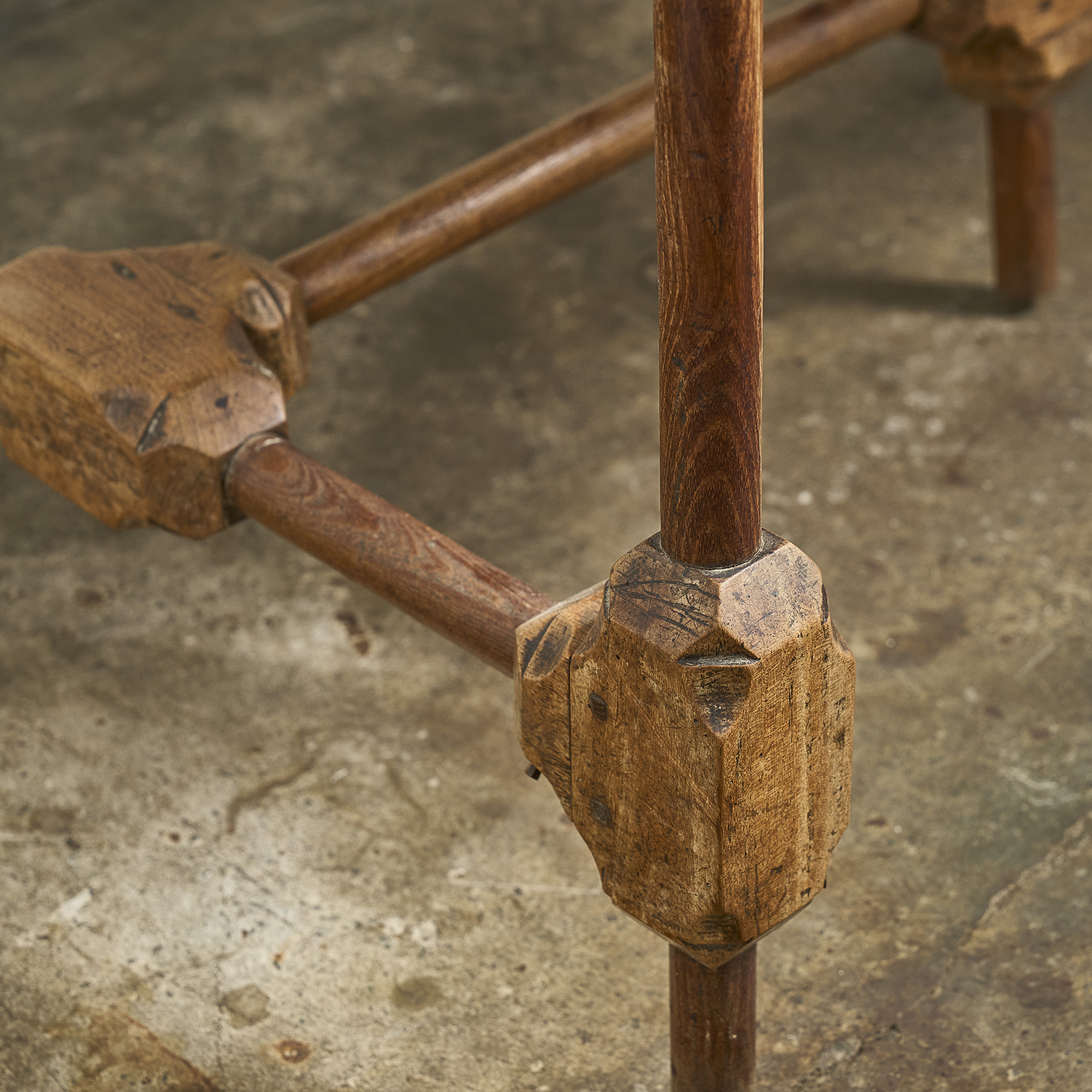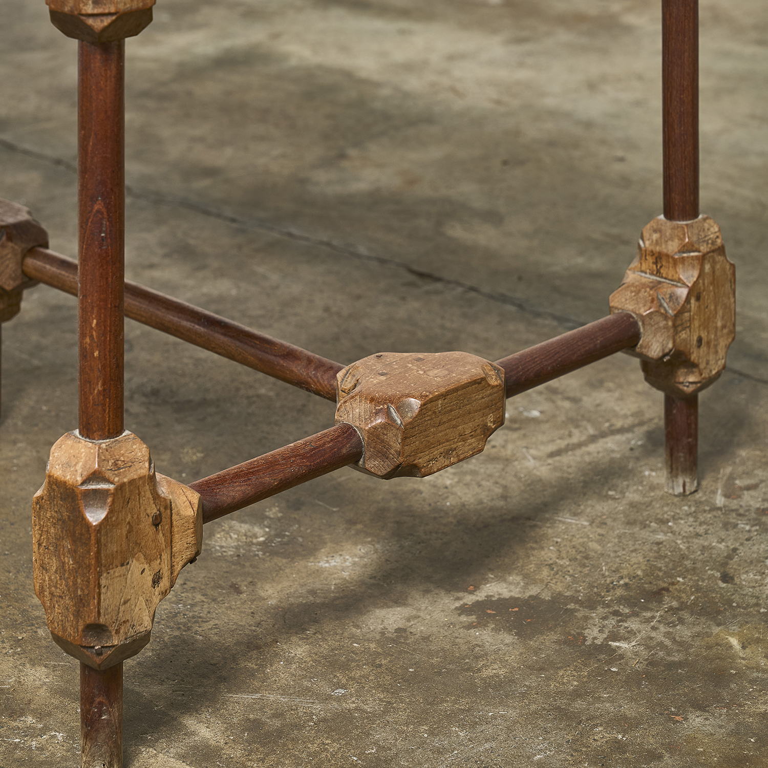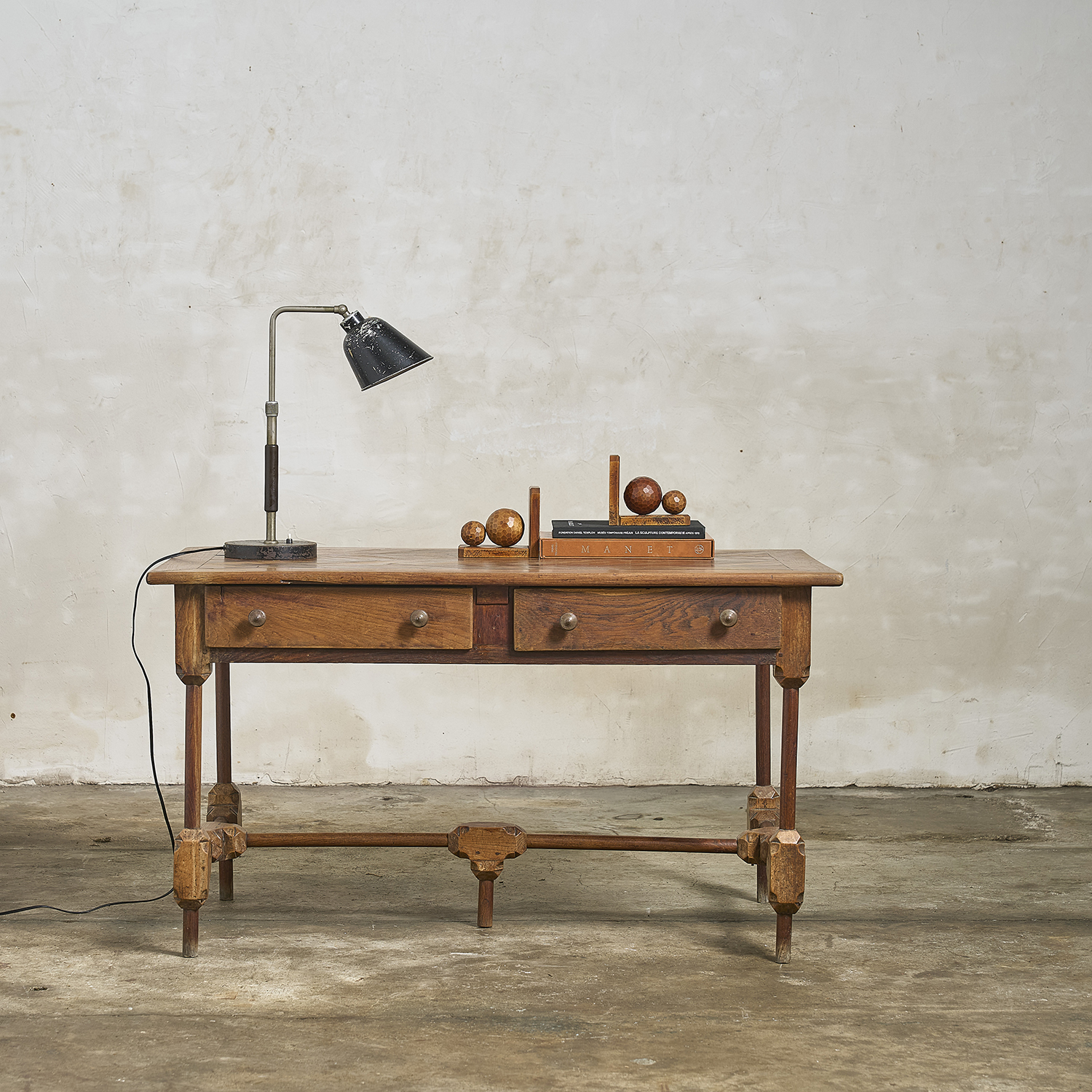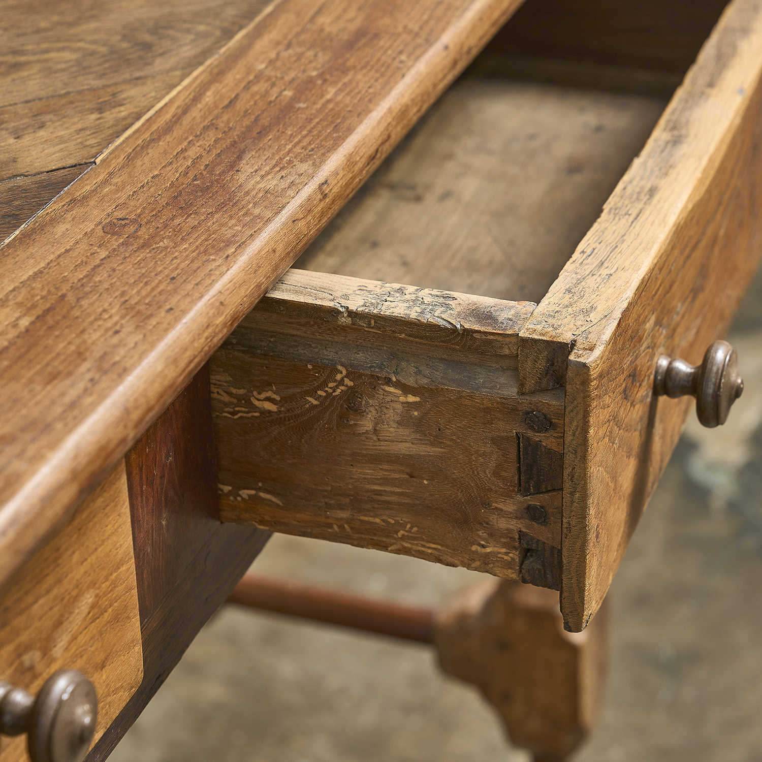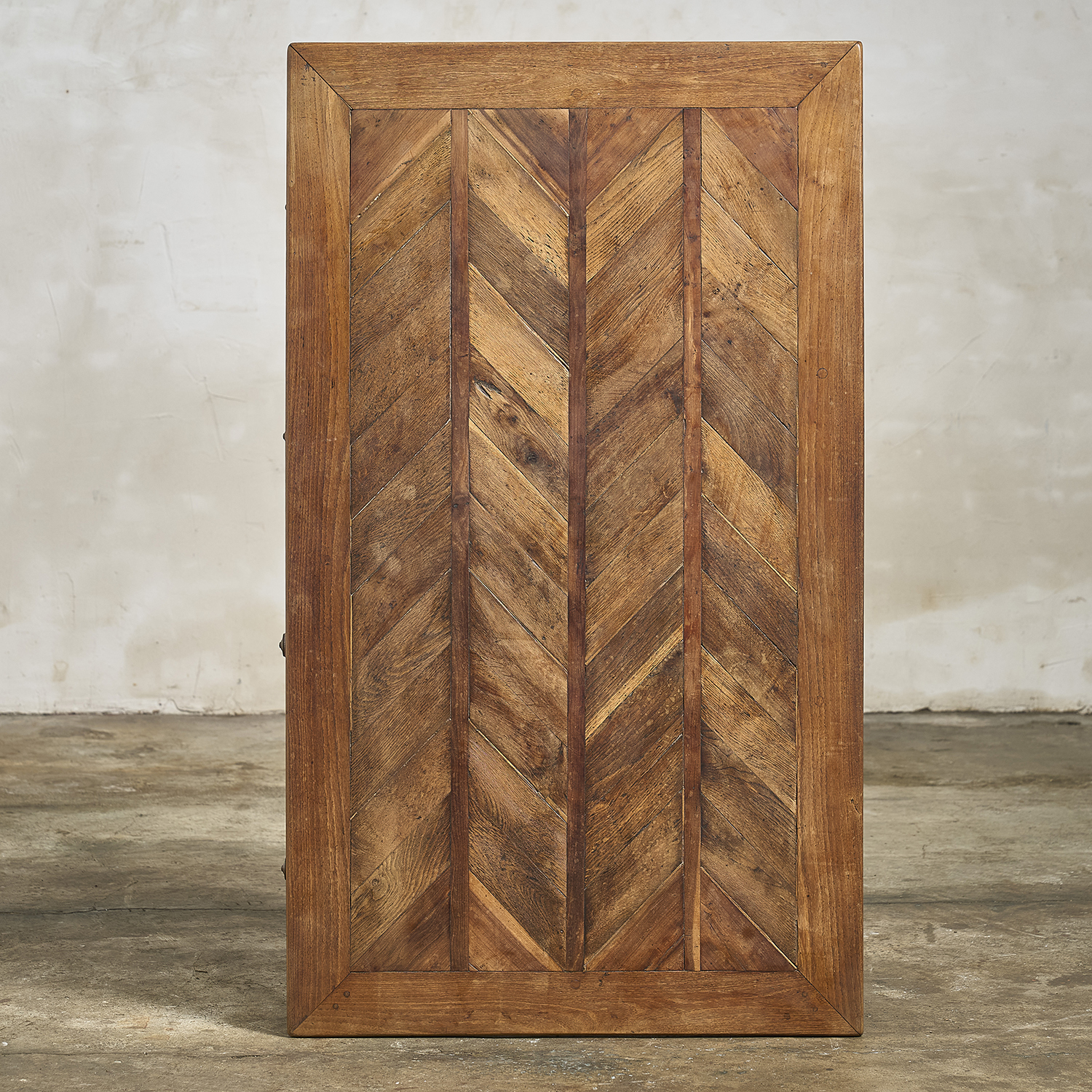 An unusual wooden desk with two drawers in the frieze. The rectangular herringbone top rests on four cylindrical feet joined by a stretcher.