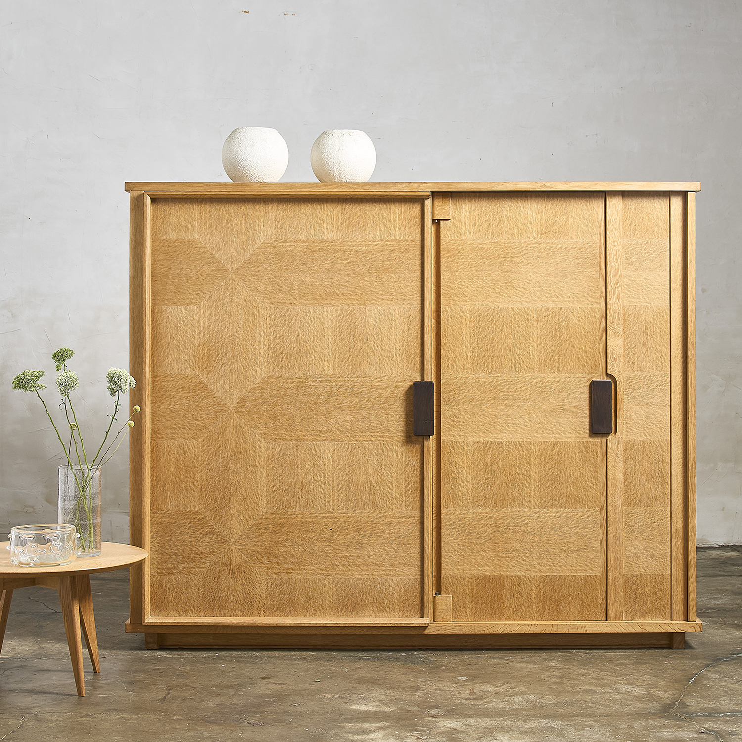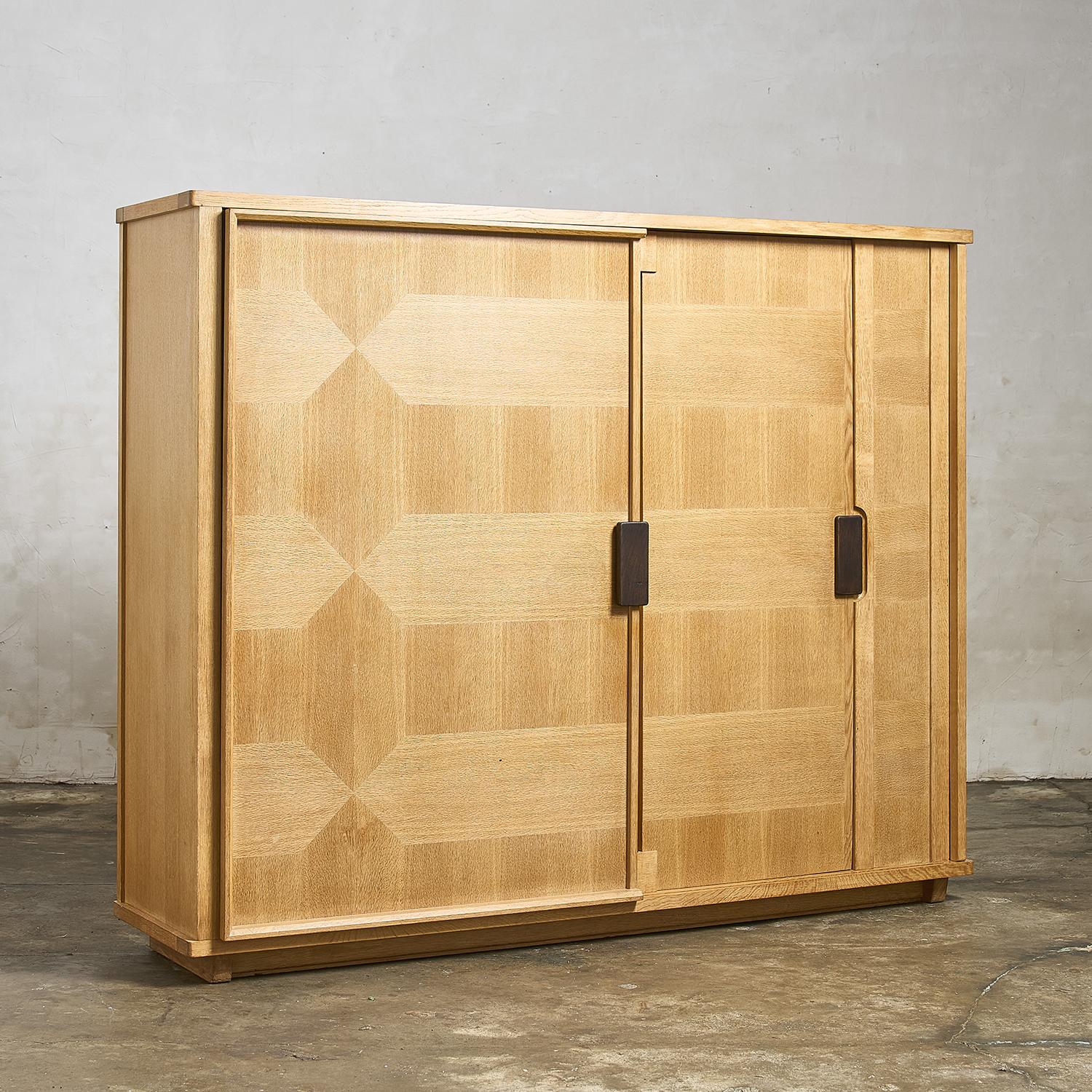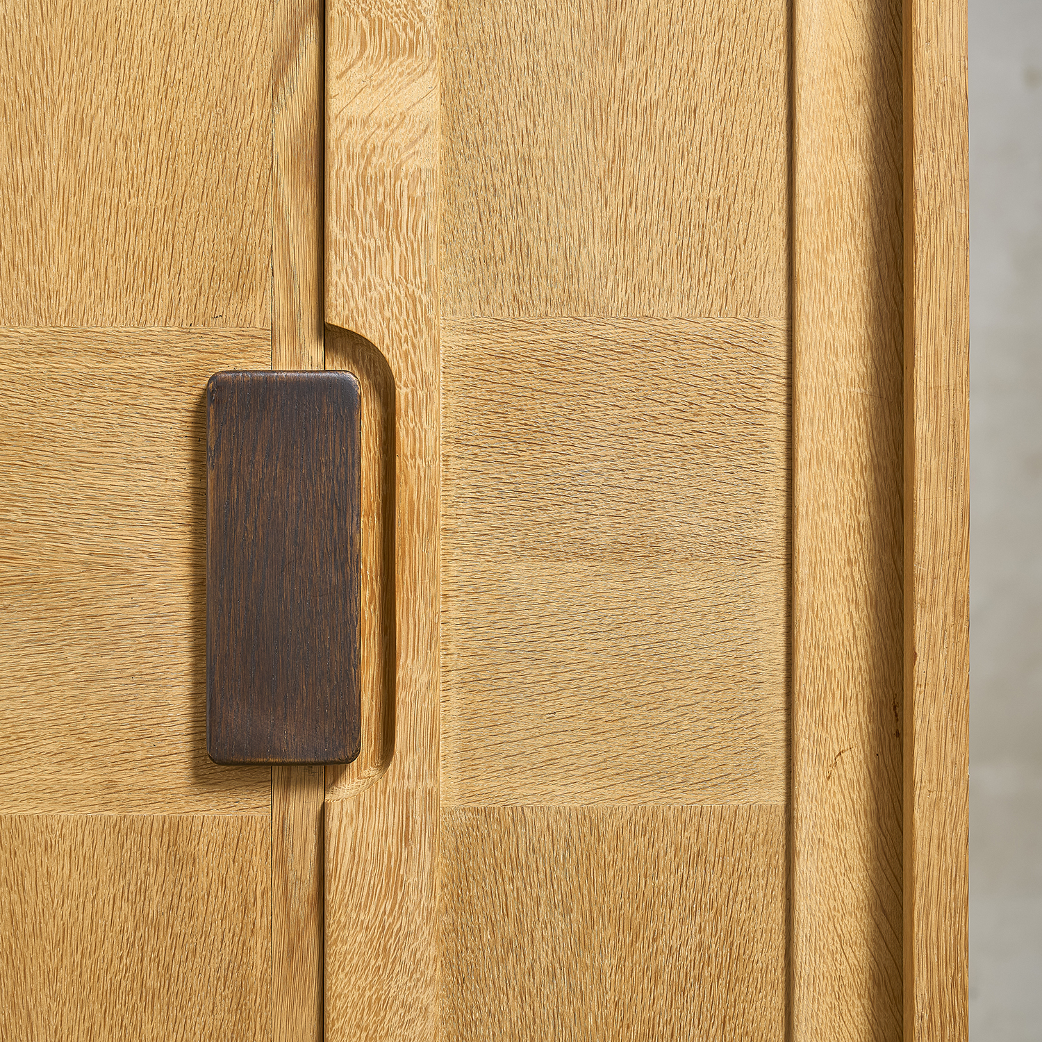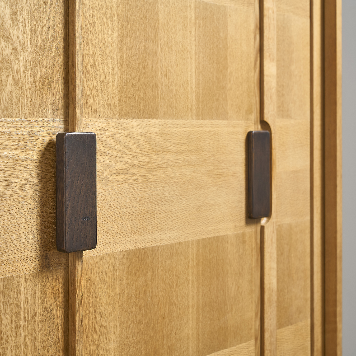 Guillerme and Chambron – Editions Votre Maison, circa 1960. Large wardrobe in light oak with two front doors featuring stained wood handles and a hinged side door. H. 175 cm W. 214 cm D. 55 cm