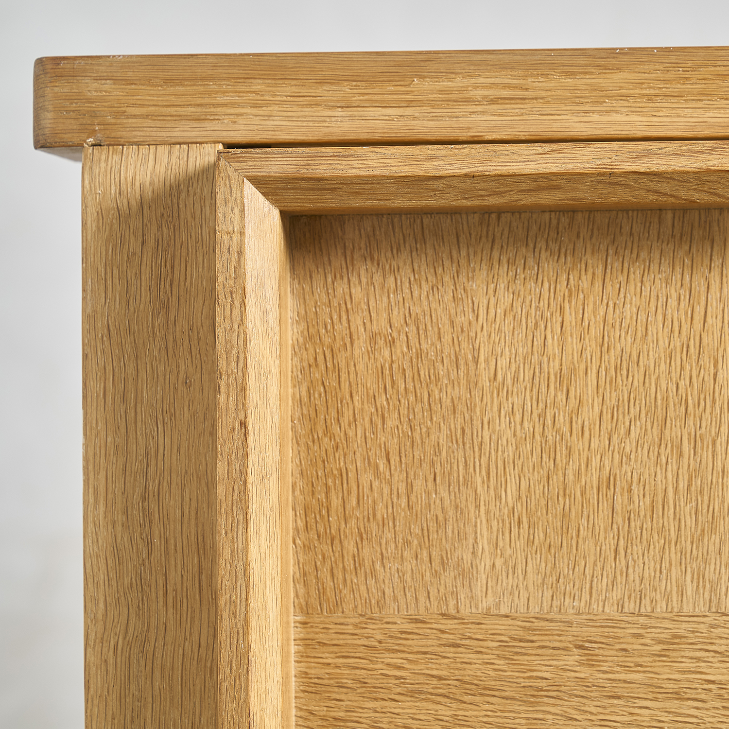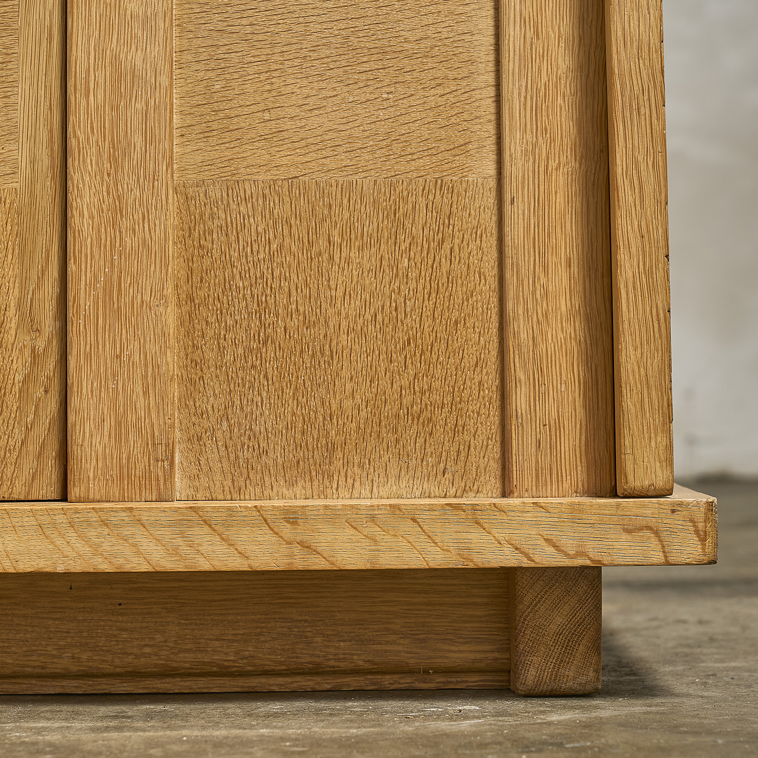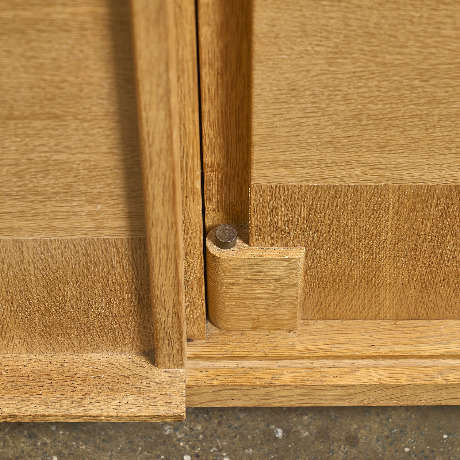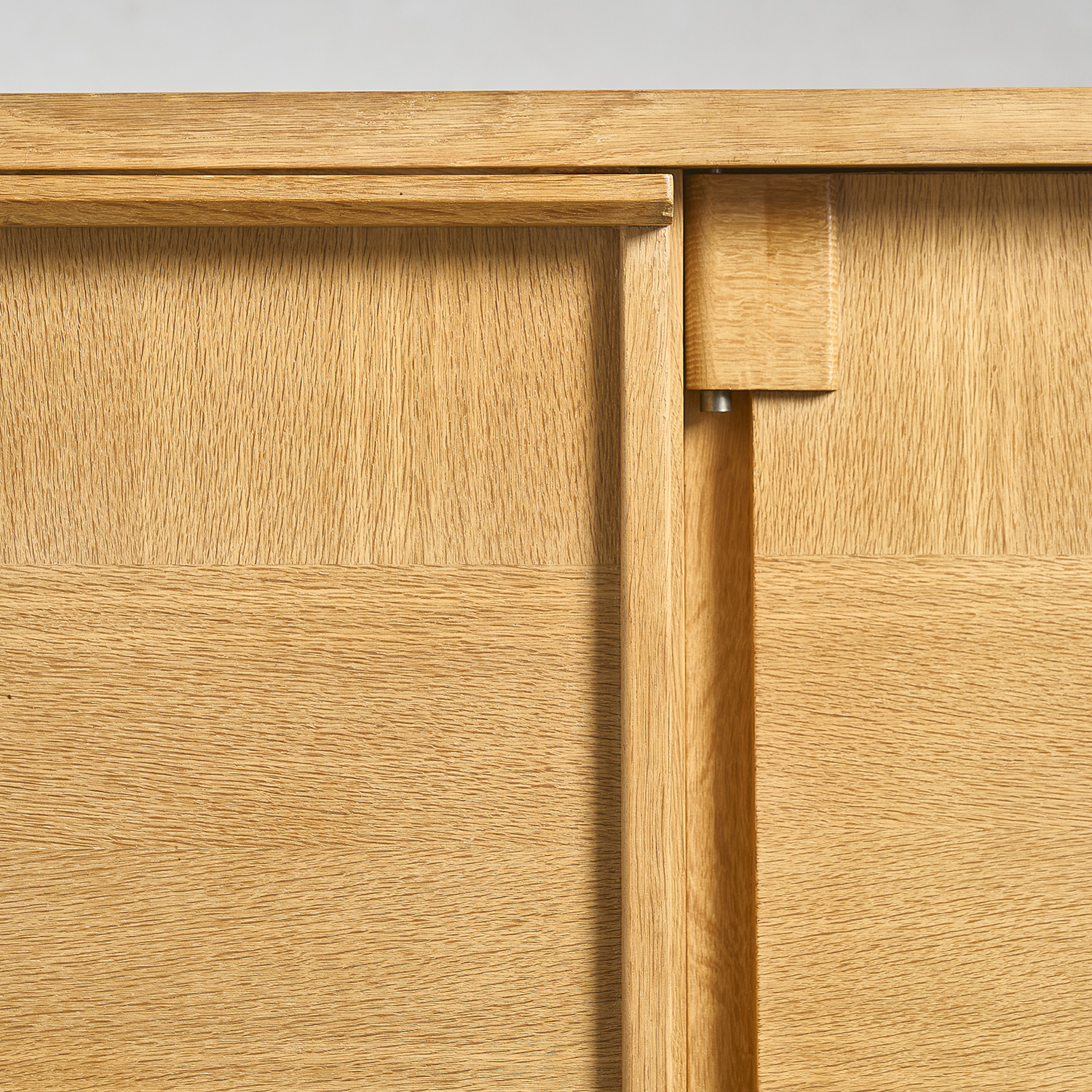 Guillerme and Chambron – Editions Votre Maison, circa 1960. Large wardrobe in light oak with two front doors featuring stained wood handles and a hinged side door. H. 175 cm W. 214 cm D. 55 cm