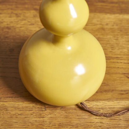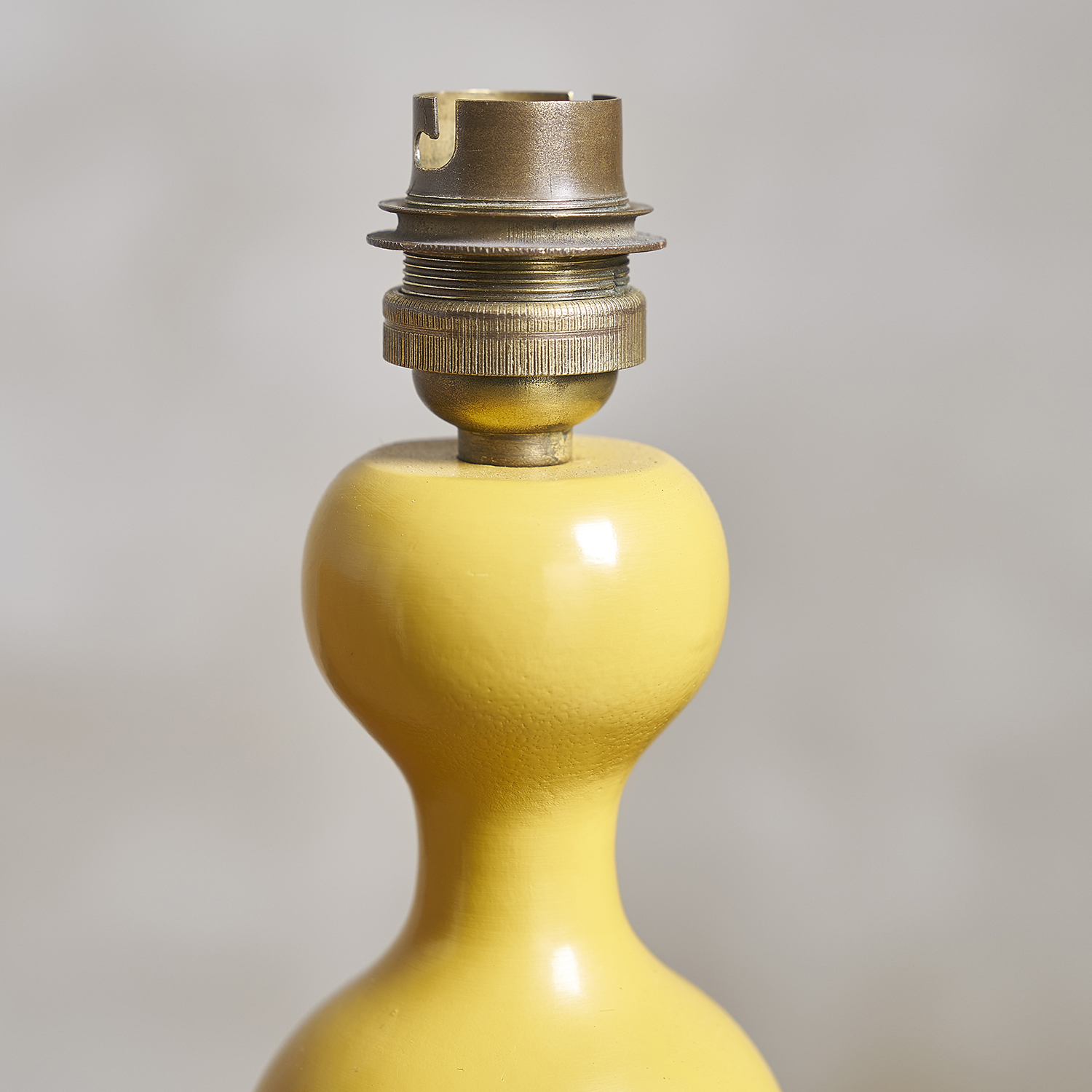 Lamp bases in mustard yellow lacquered wood. B22 socket (bayonet). Handcrafted hemp rope lampshade. Total height: 59 cm Foot: H. 31 cm D. 13 cm Cable length: 205 cm Lampshade: H. 30 D. 31 cm