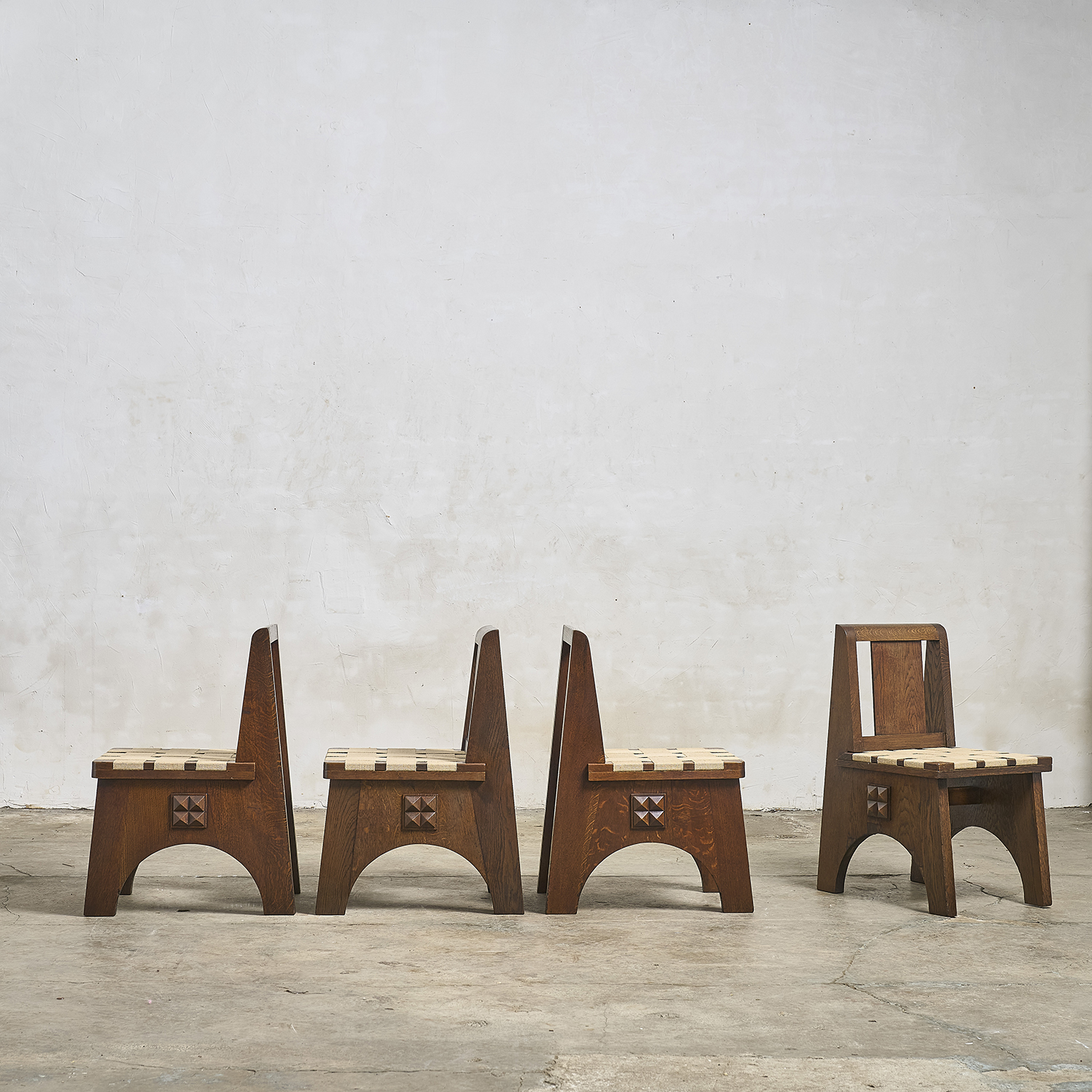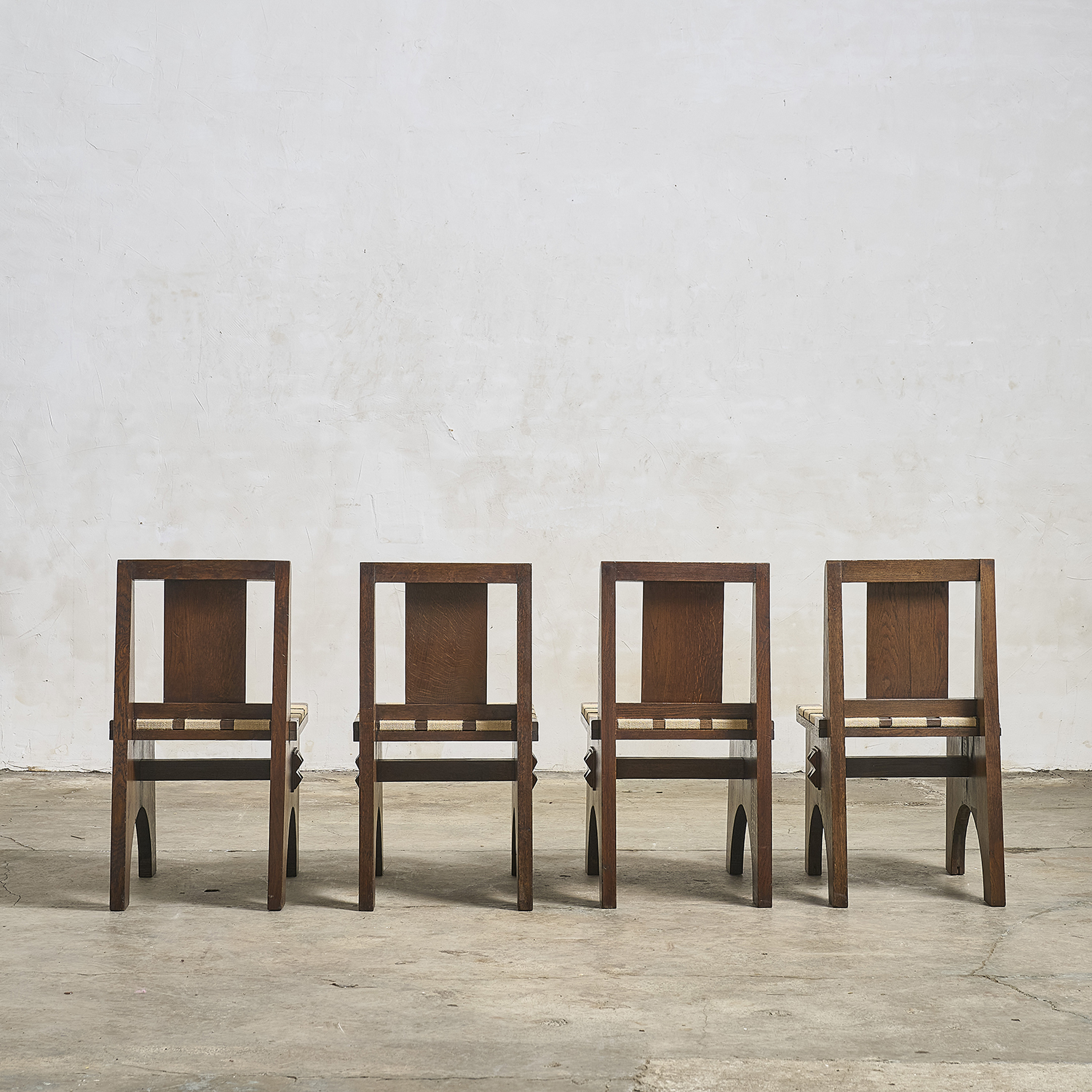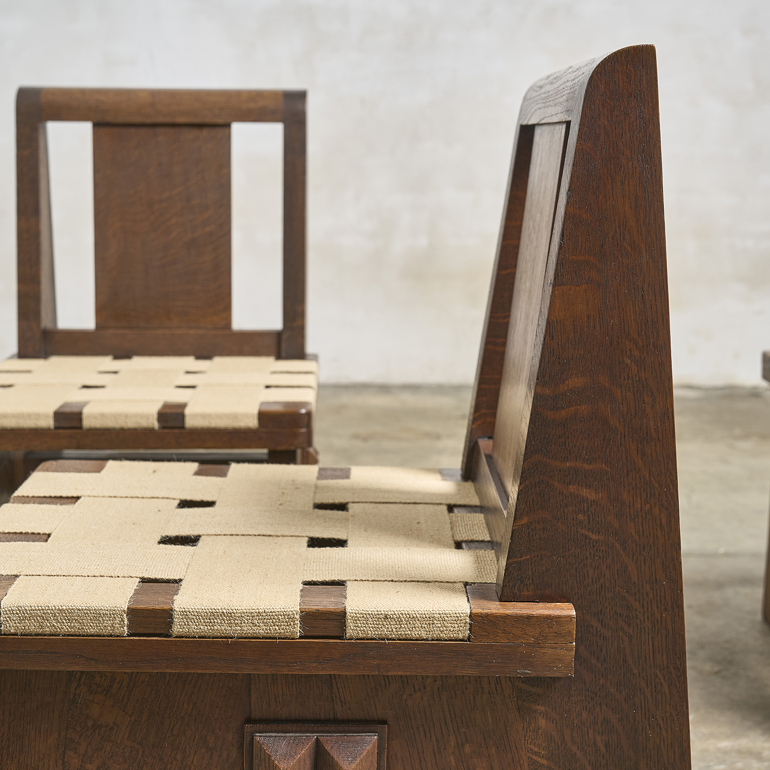 Dans le goût de Charles Dudouyt, suite de 4 chaises en chêne teinté à décor en relief de pointe de diamant de chaque côté.