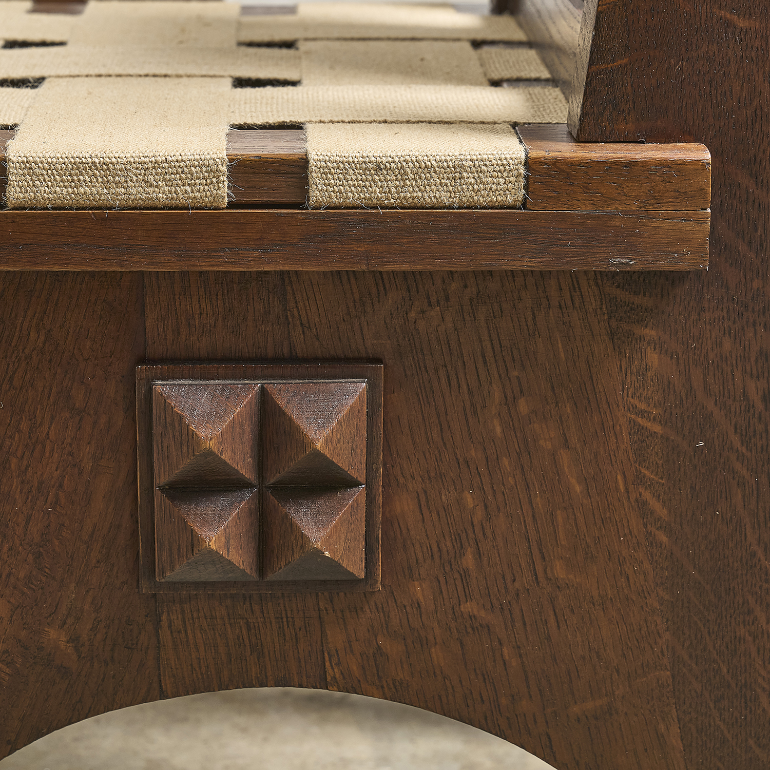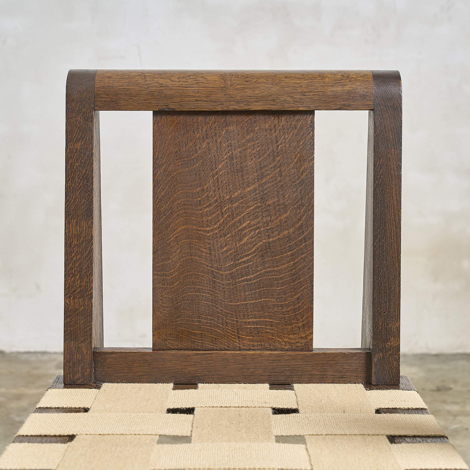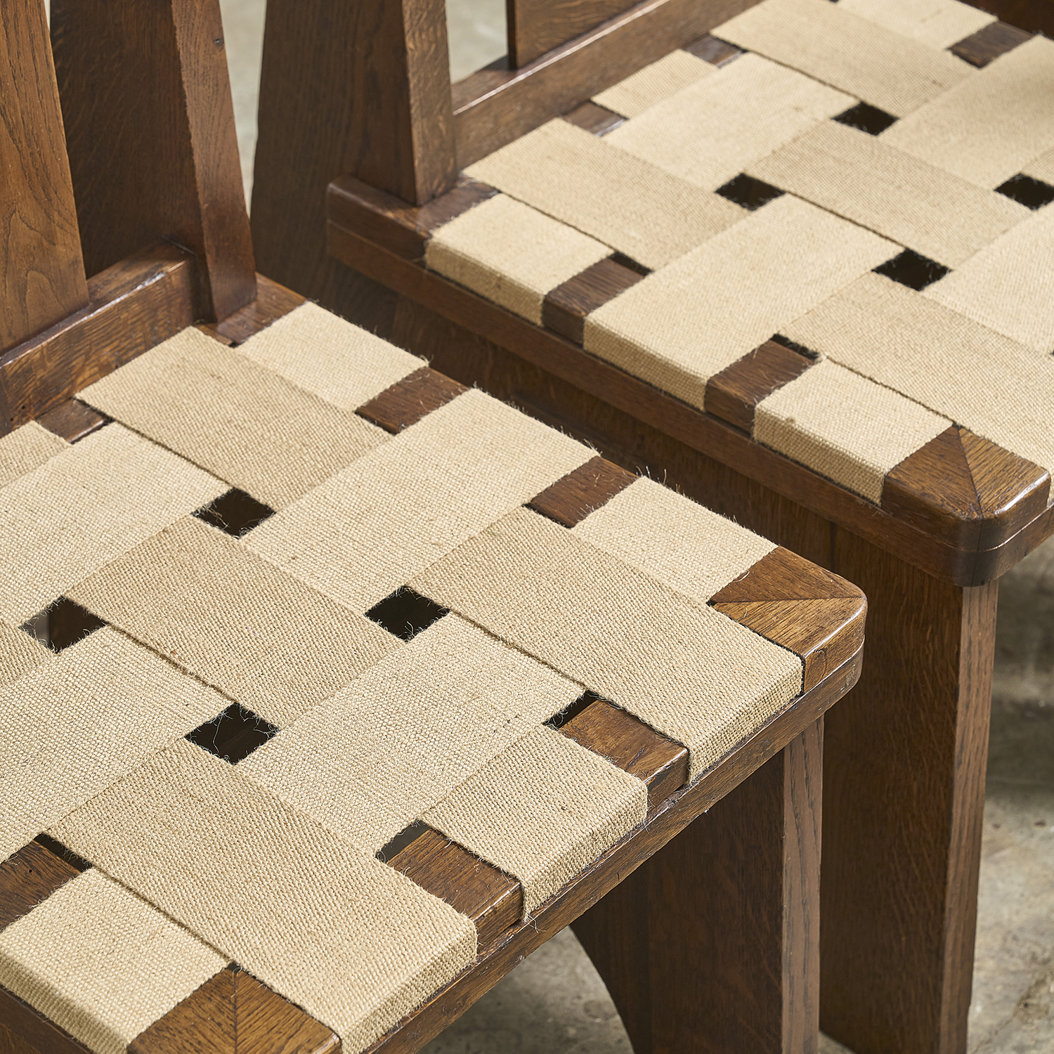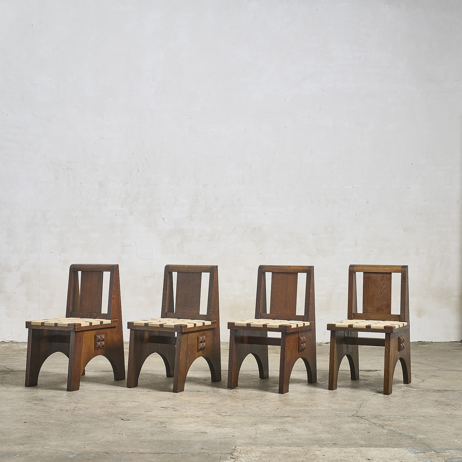 Dans le goût de Charles Dudouyt, suite de 4 chaises en chêne teinté à décor en relief de pointe de diamant de chaque côté.