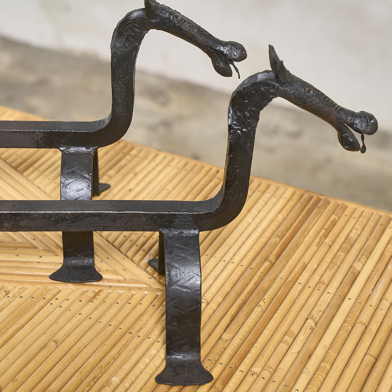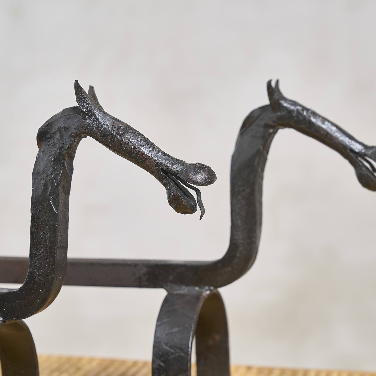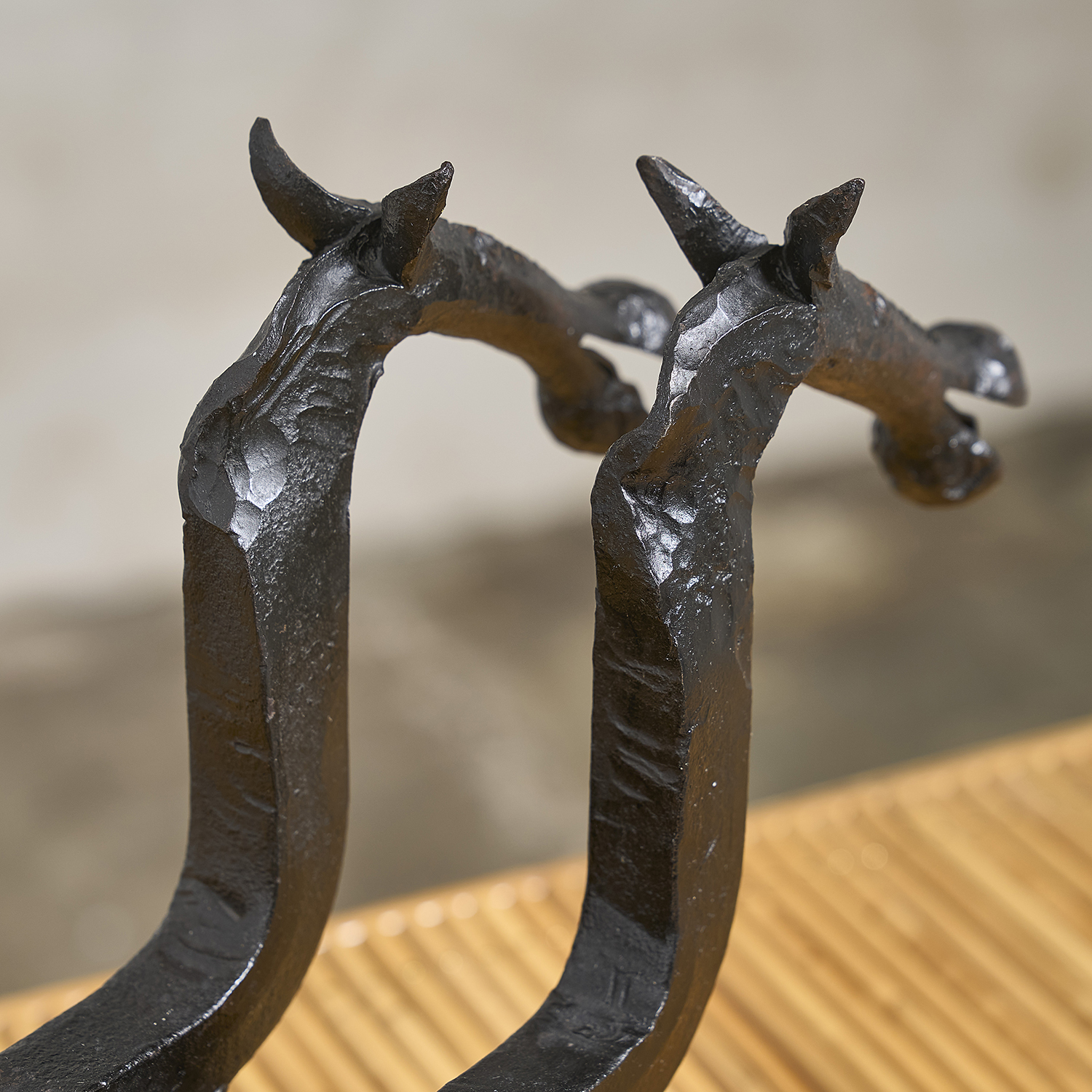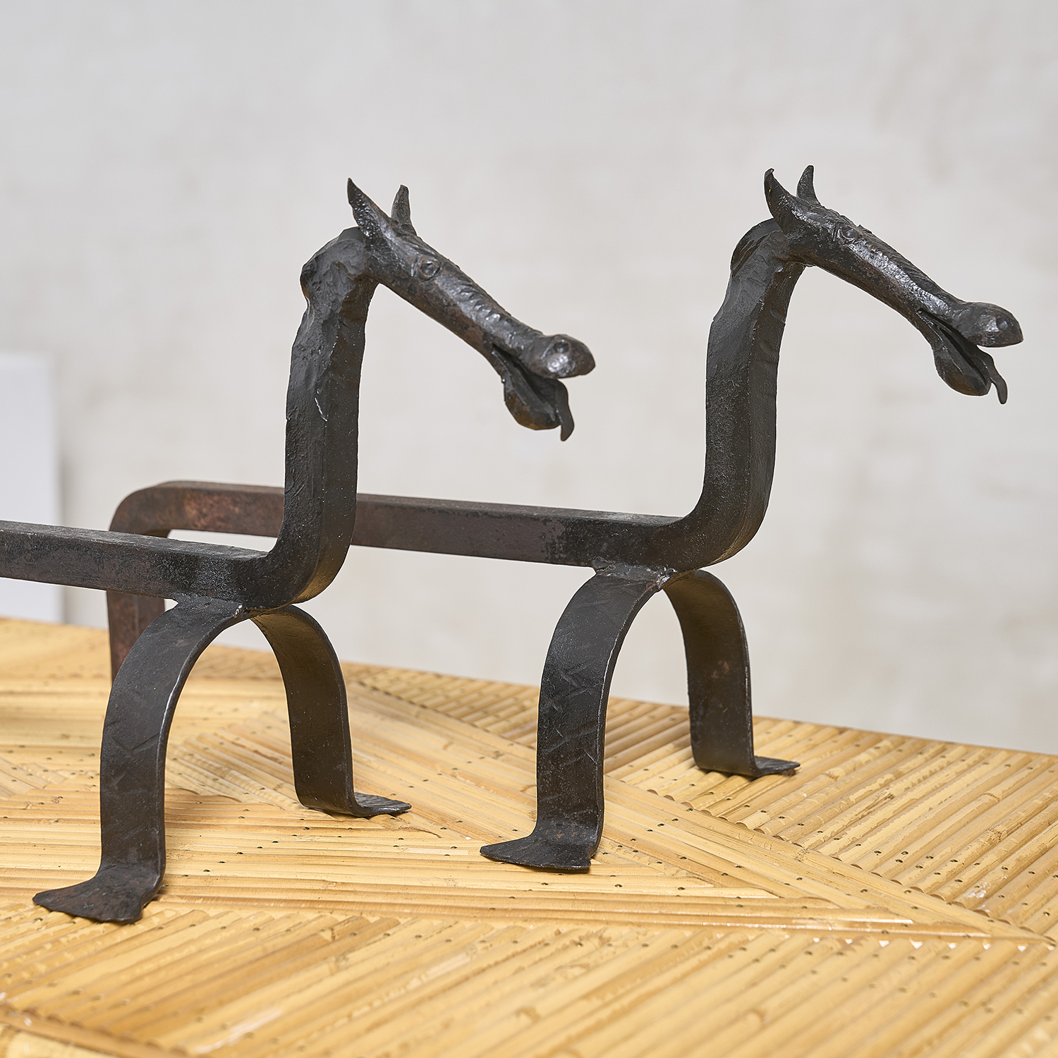 Paire de chenets en fer forgé figurant des chevaux stylisés, vers 1960.