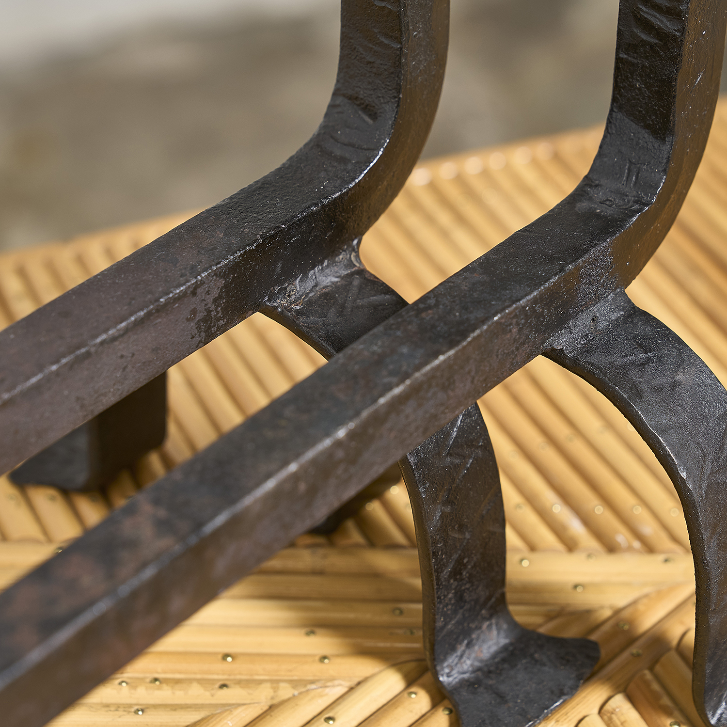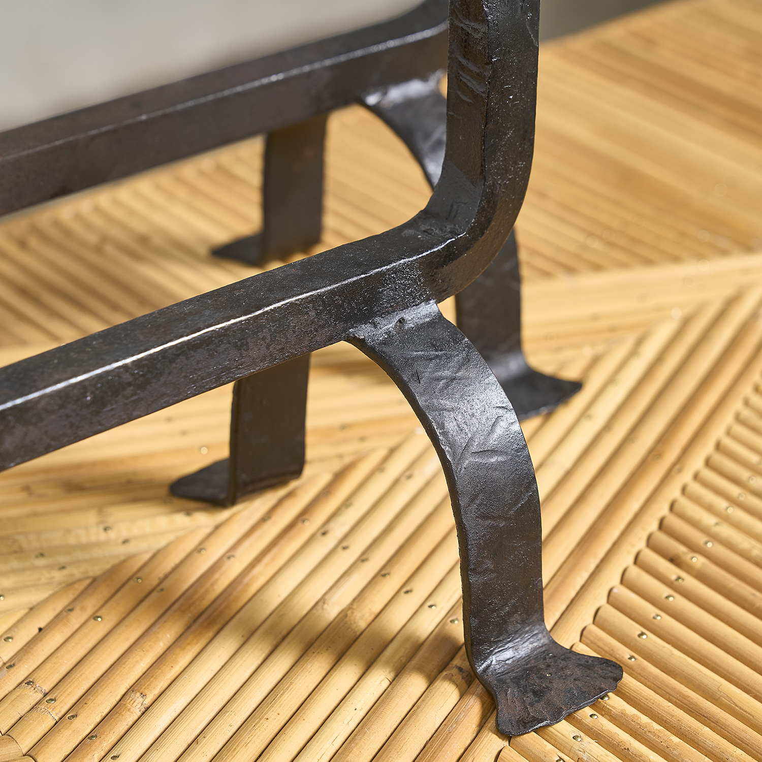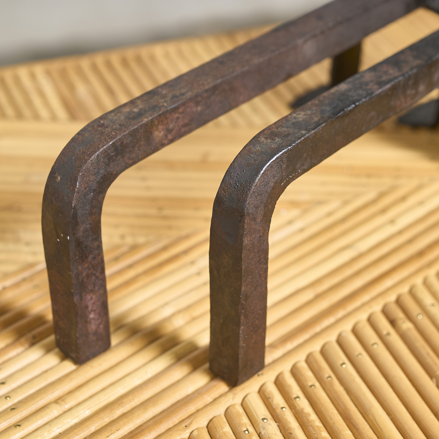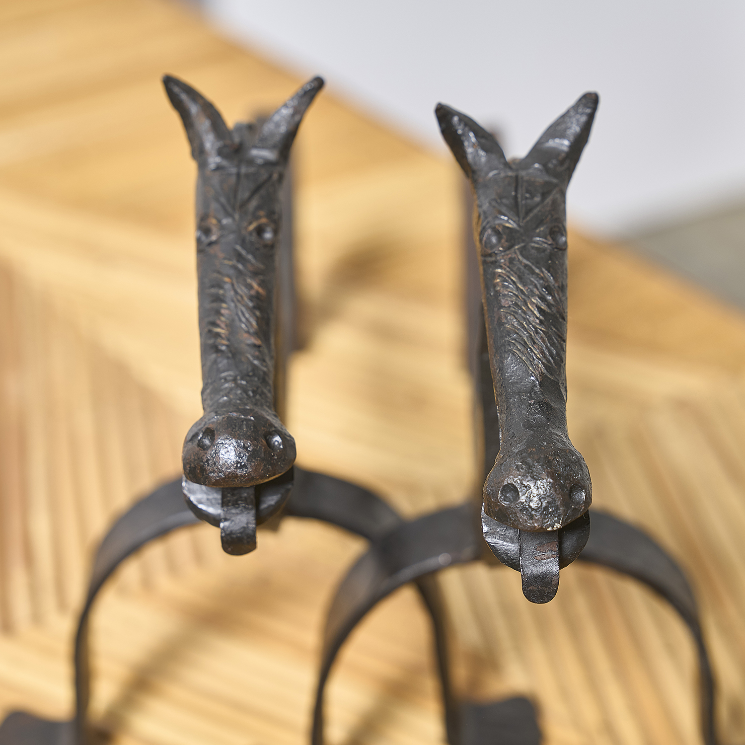 Paire de chenets en fer forgé figurant des chevaux stylisés, vers 1960.