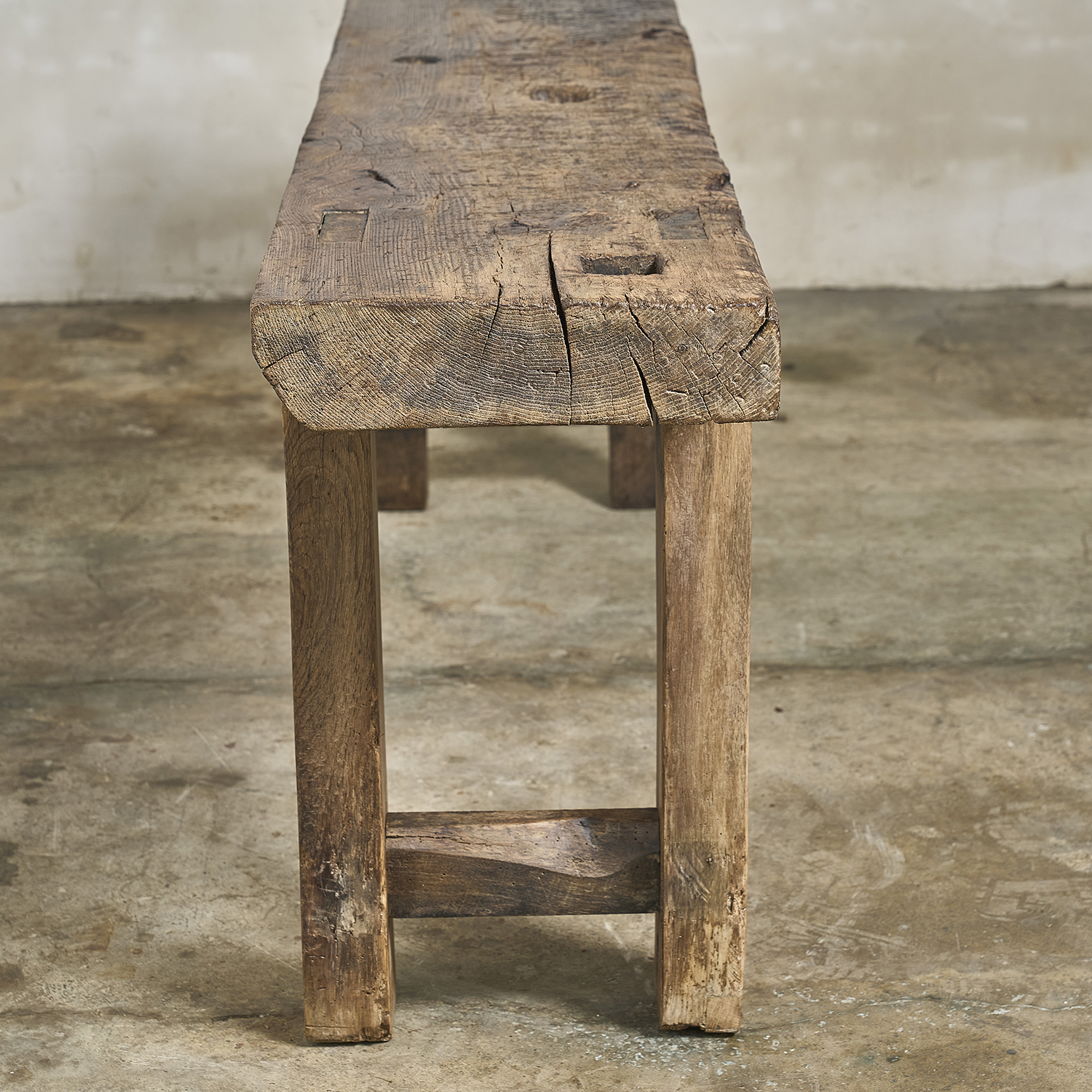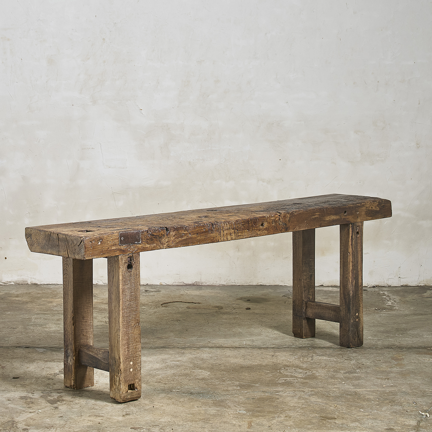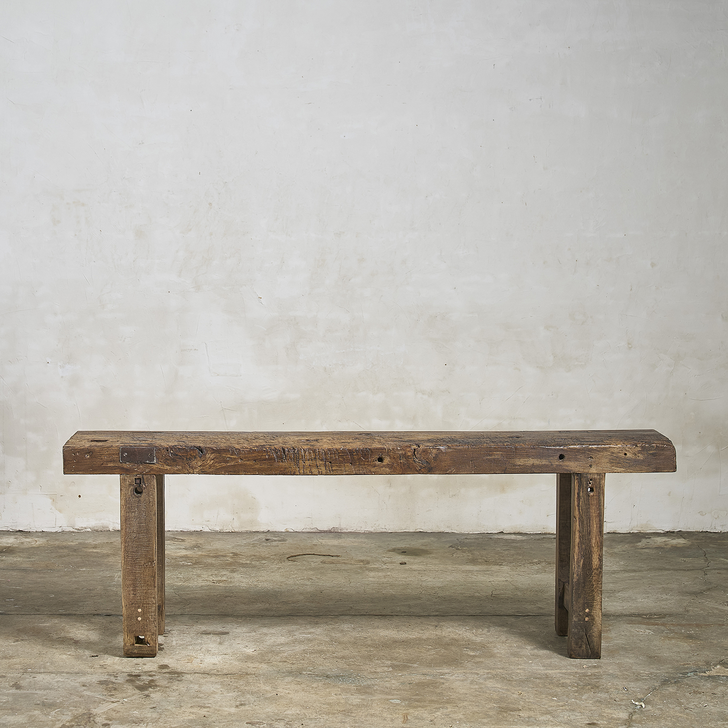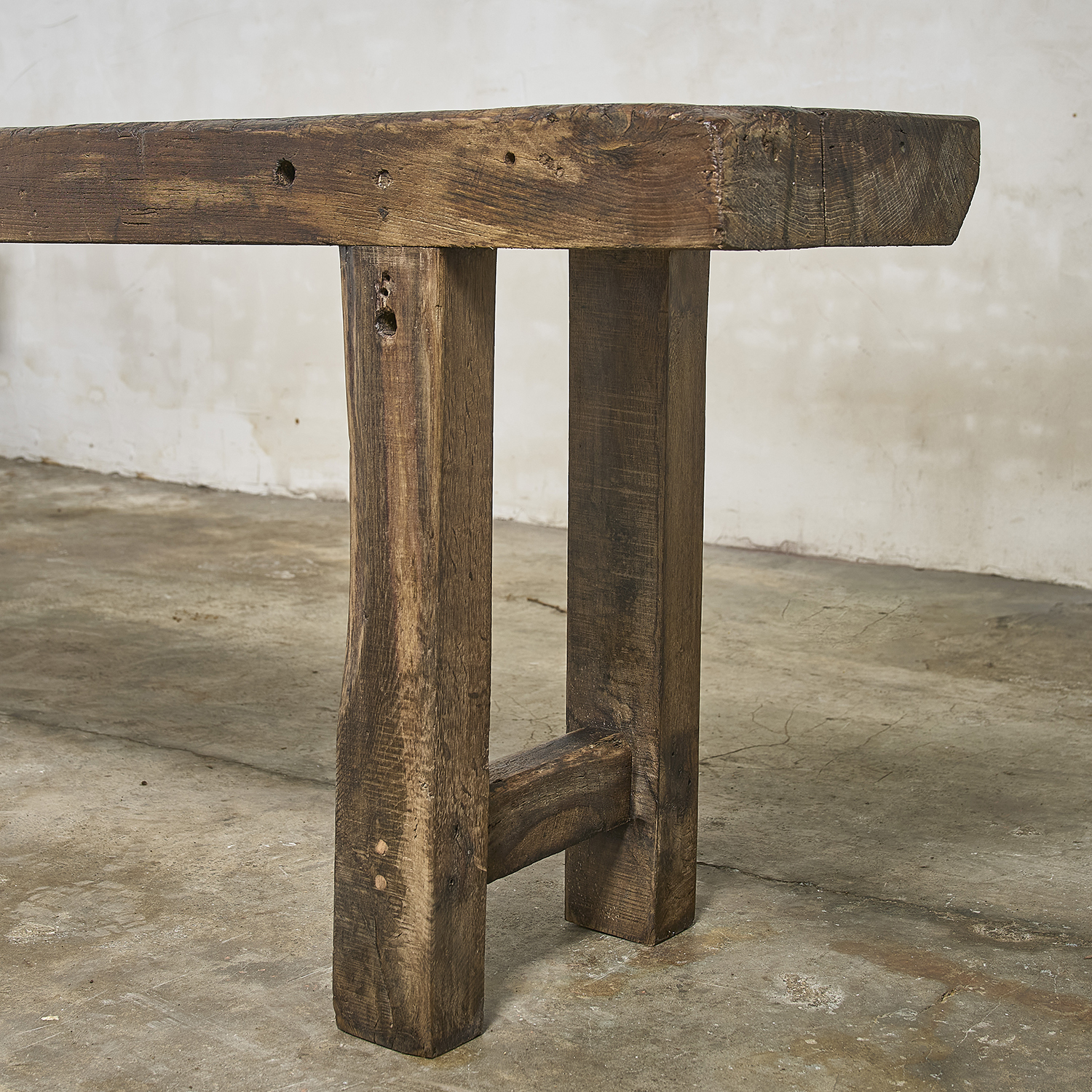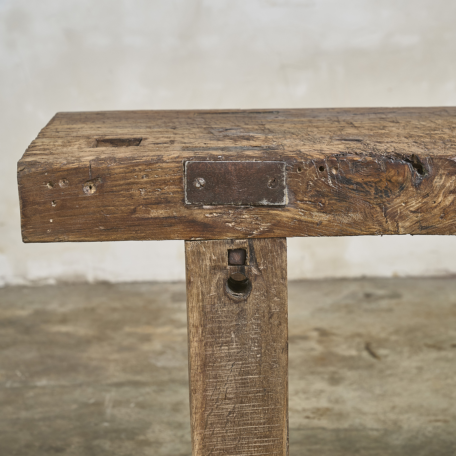 Console primitive au plateau épais patiné par le travail et le temps.