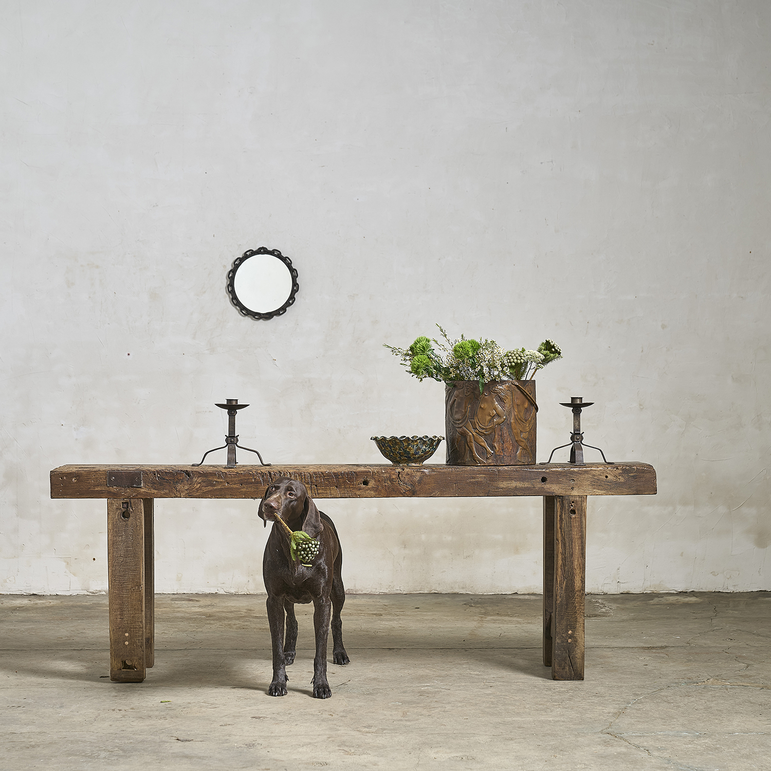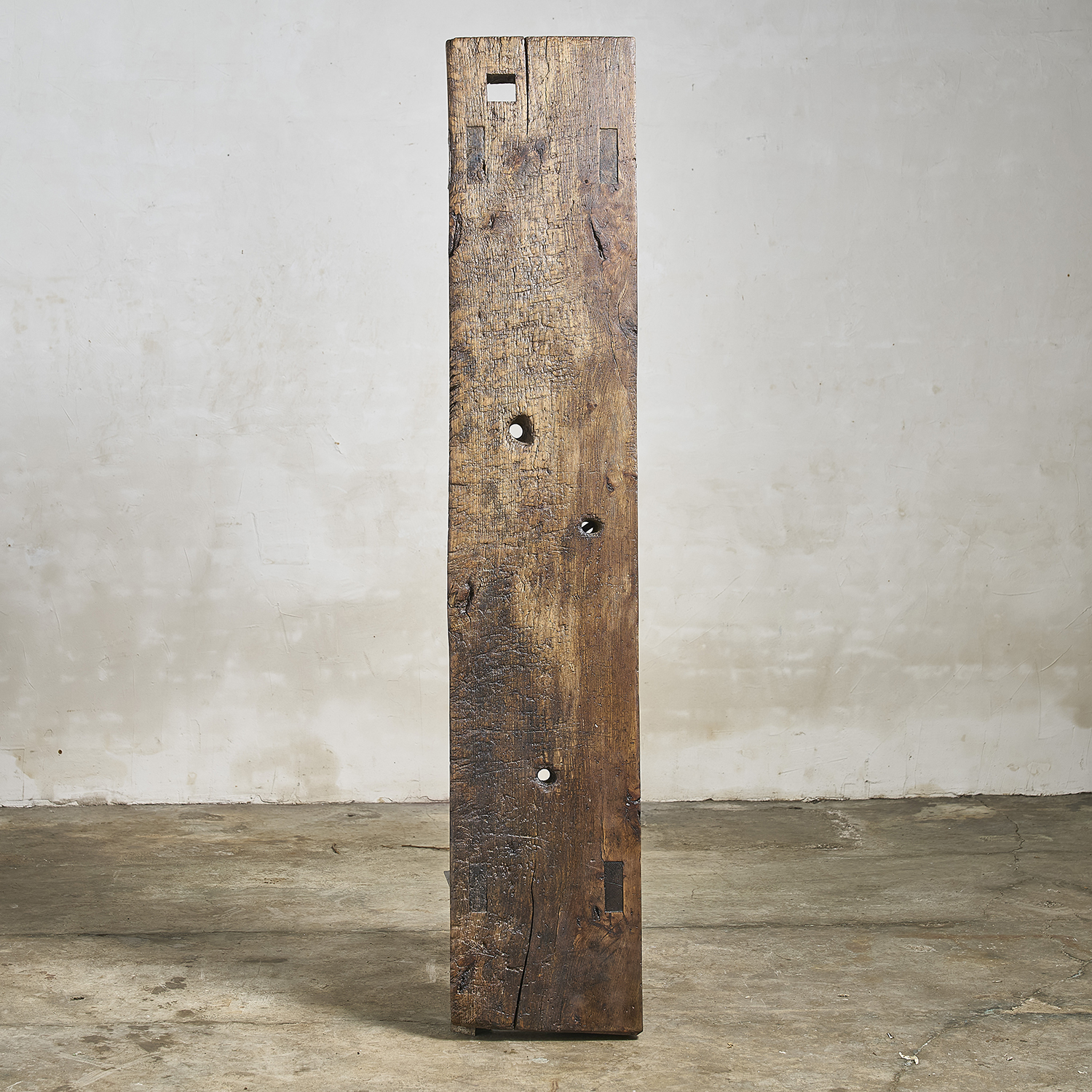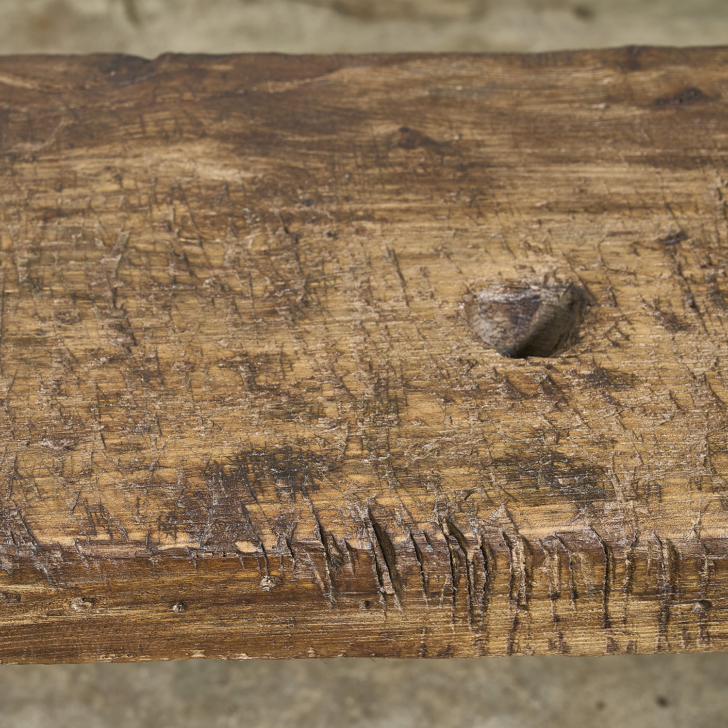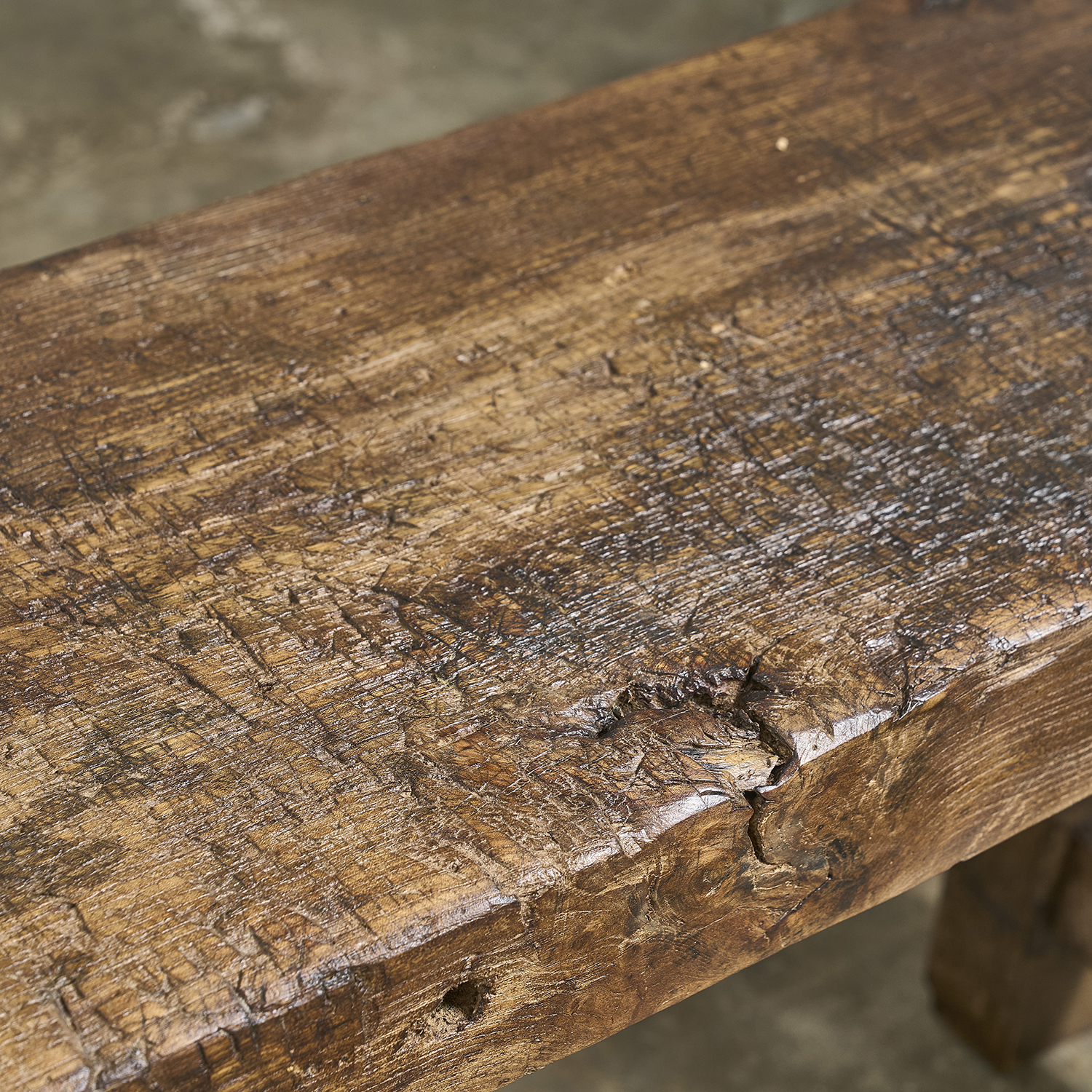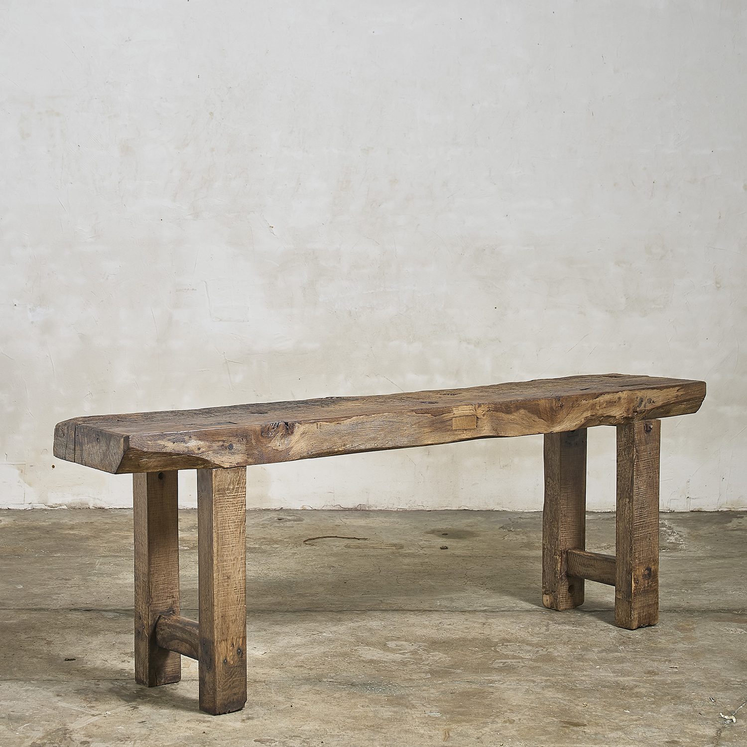 Console primitive au plateau épais patiné par le travail et le temps.