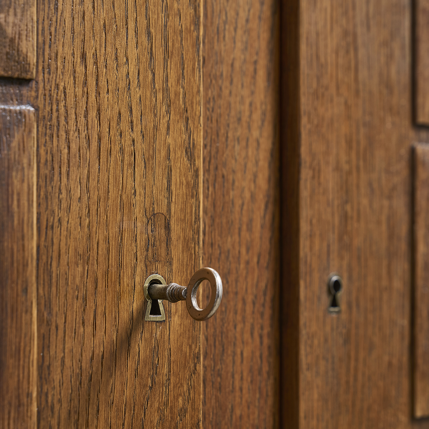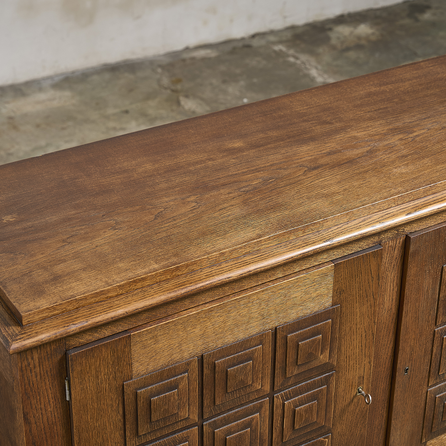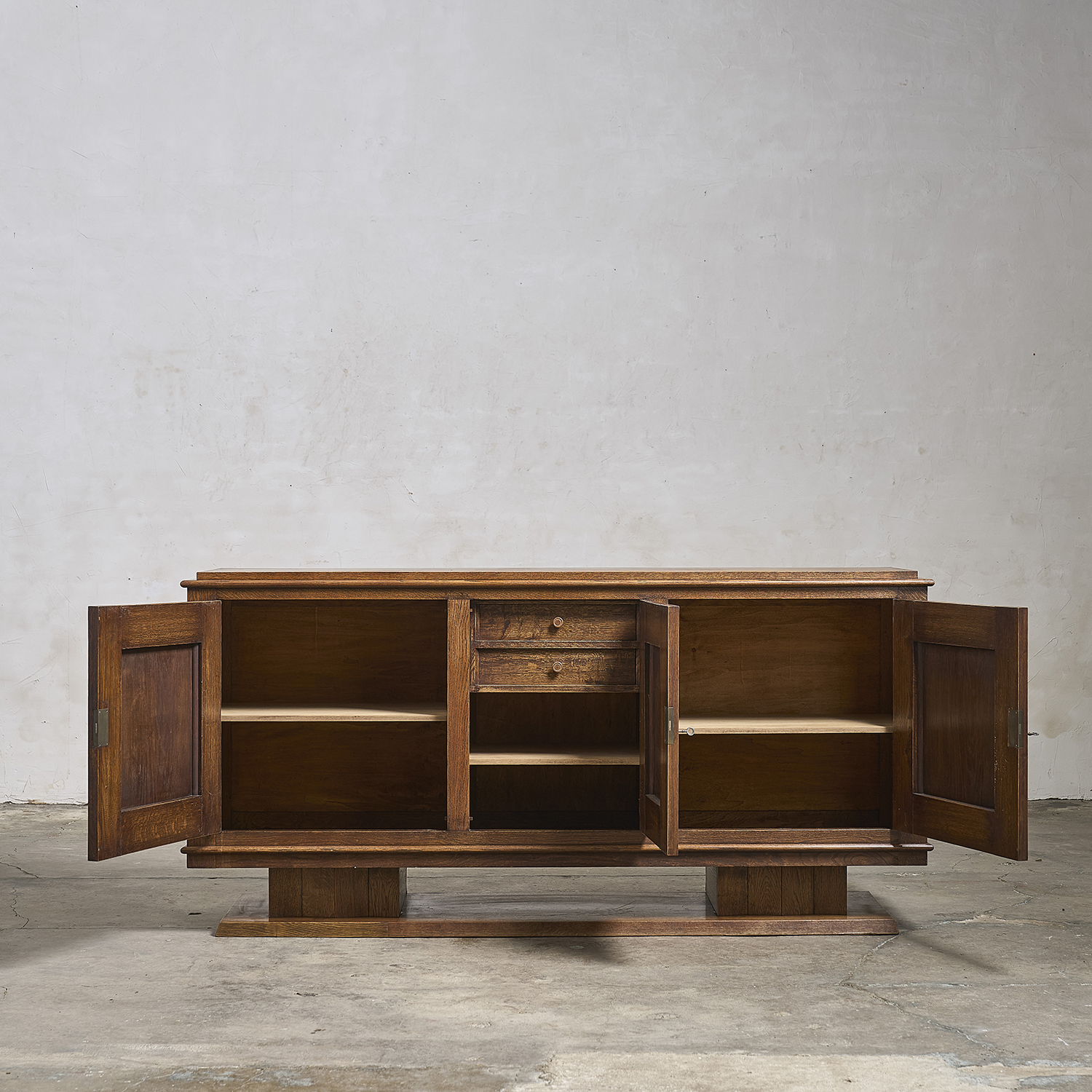 Buffet en chêne ouvrant par 3 portes garnies en leur centre de panneaux sculptés, France vers 1945.