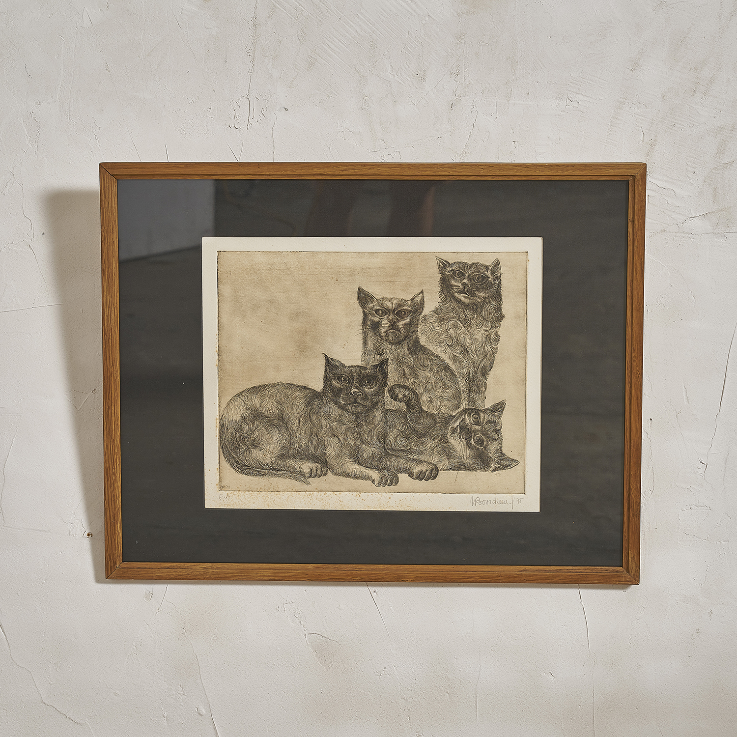 4 chats. 1975. Eau-forte et pointe sèche. 40 x 33 cm. Gravure signée et numérotée au crayon, quelques rousseurs, montée sous passe-partout.