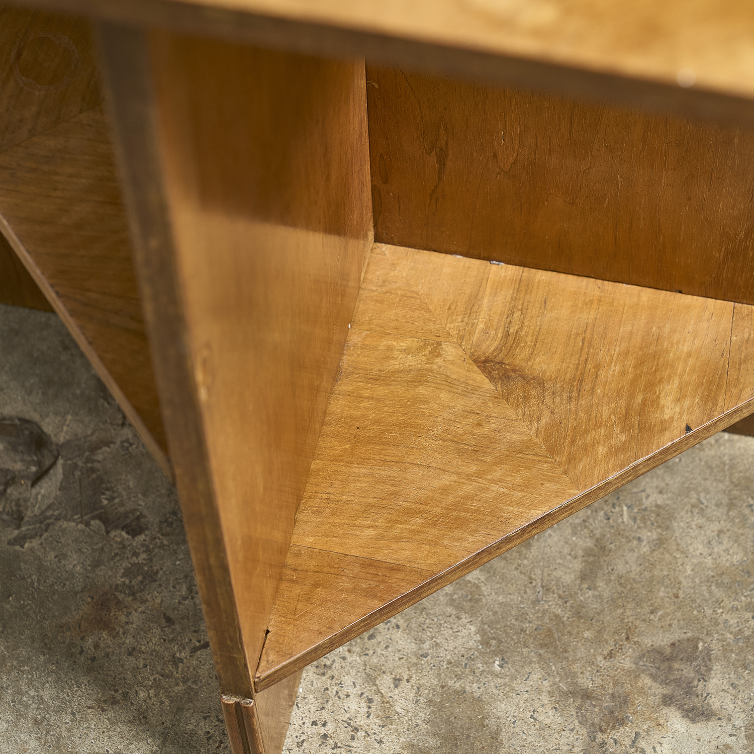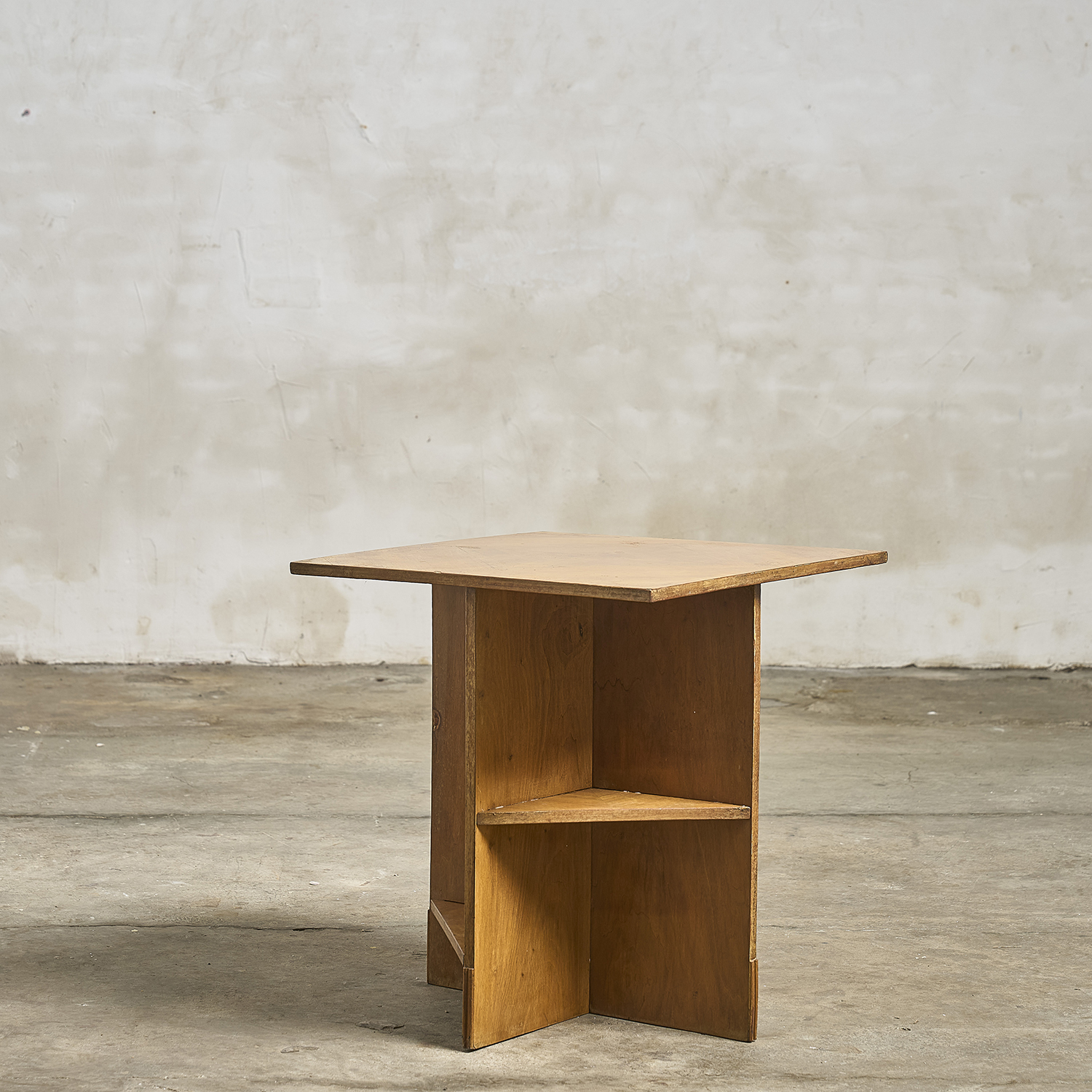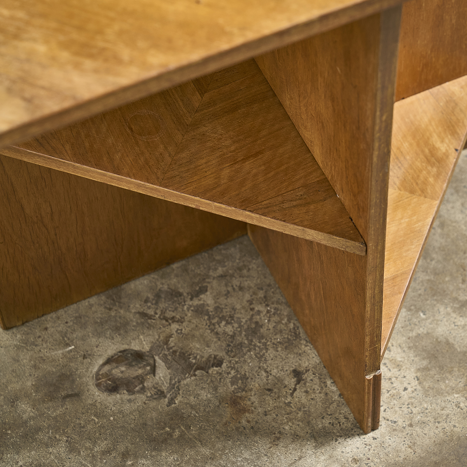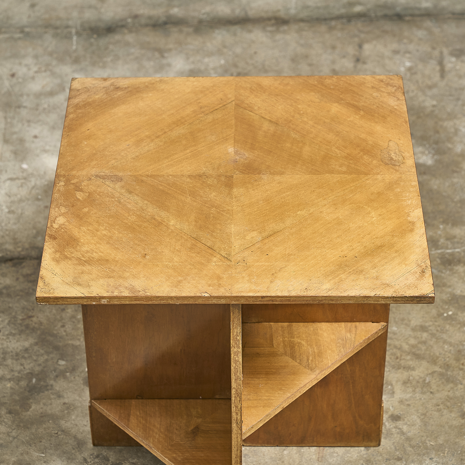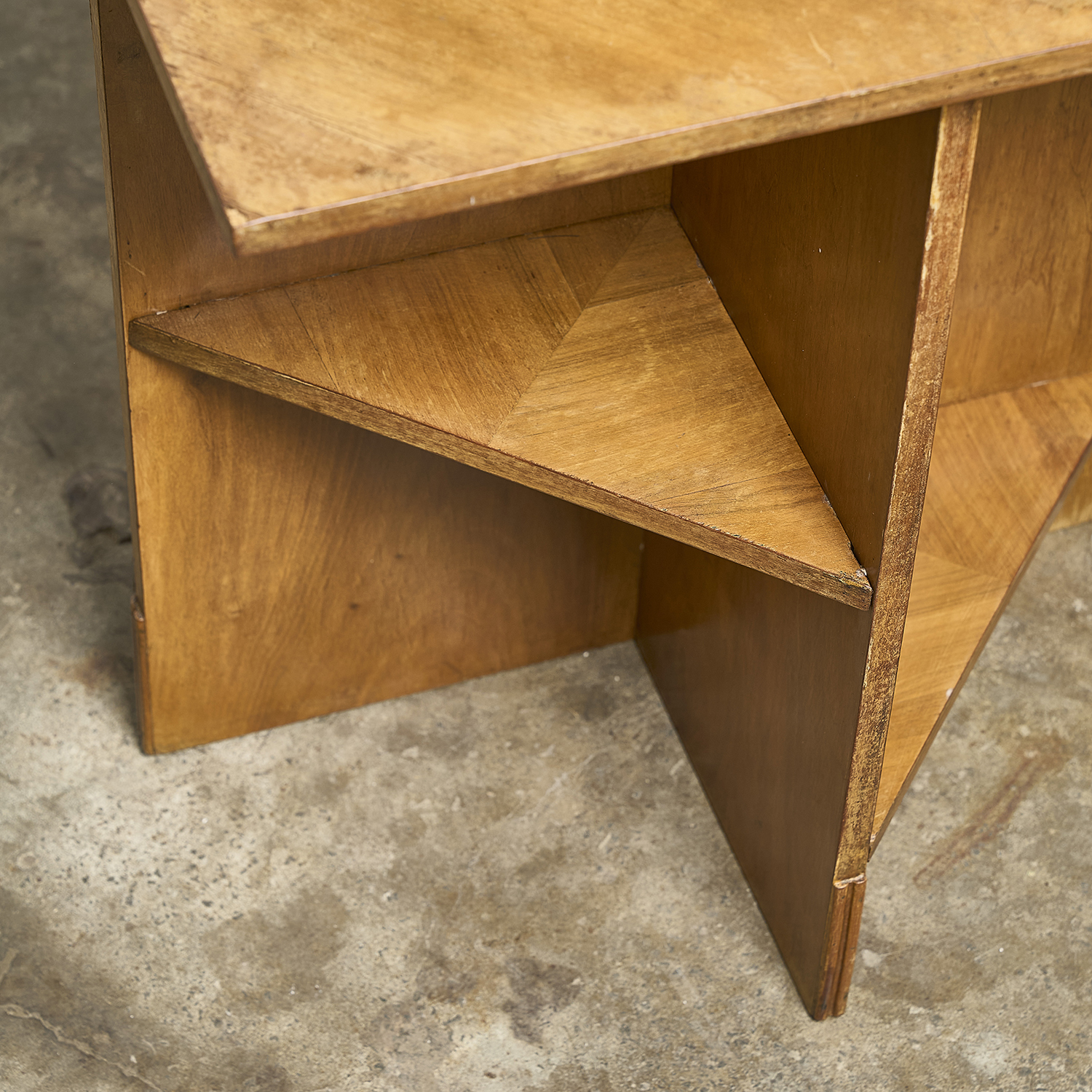 Guéridon art déco en placage de noyer à plateau carré reposant sur un piètement plein en croix découvrant des étagères asymétriques.