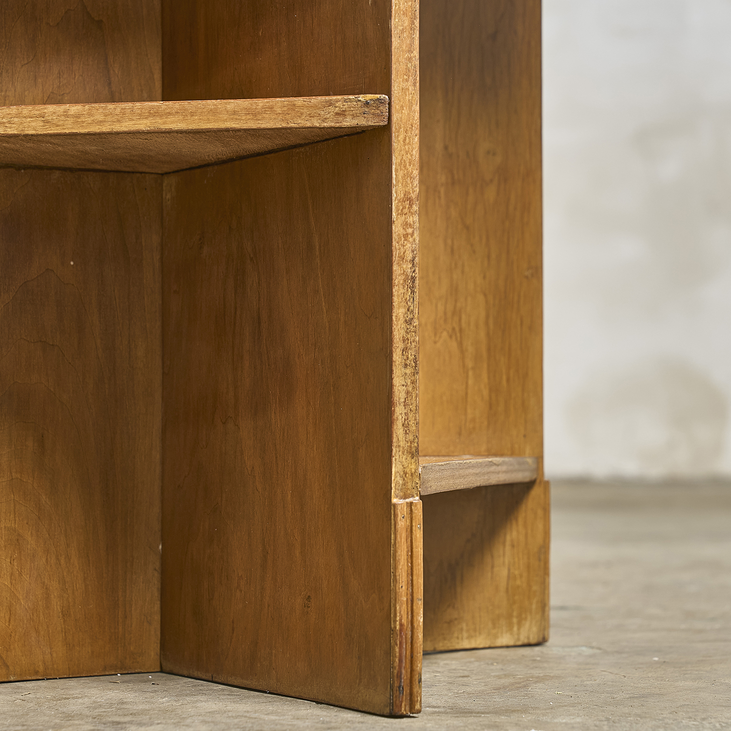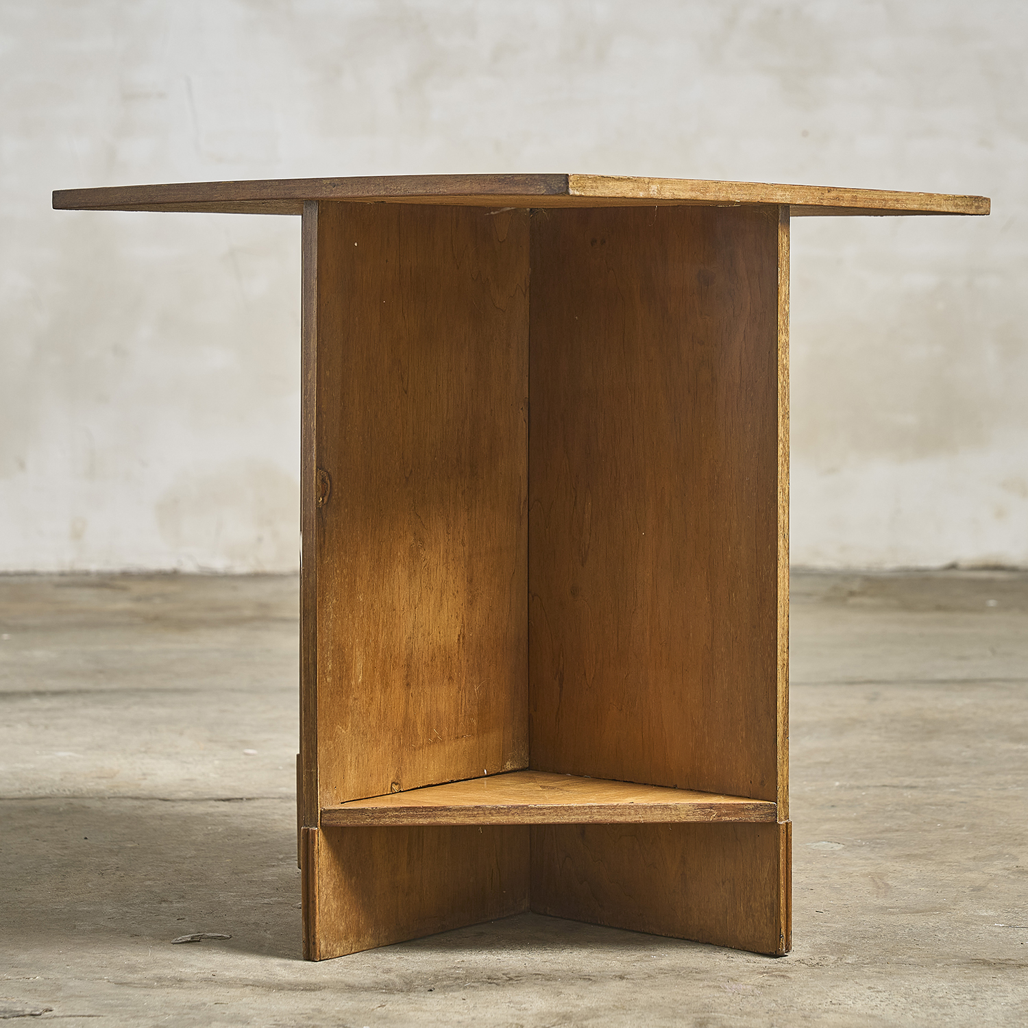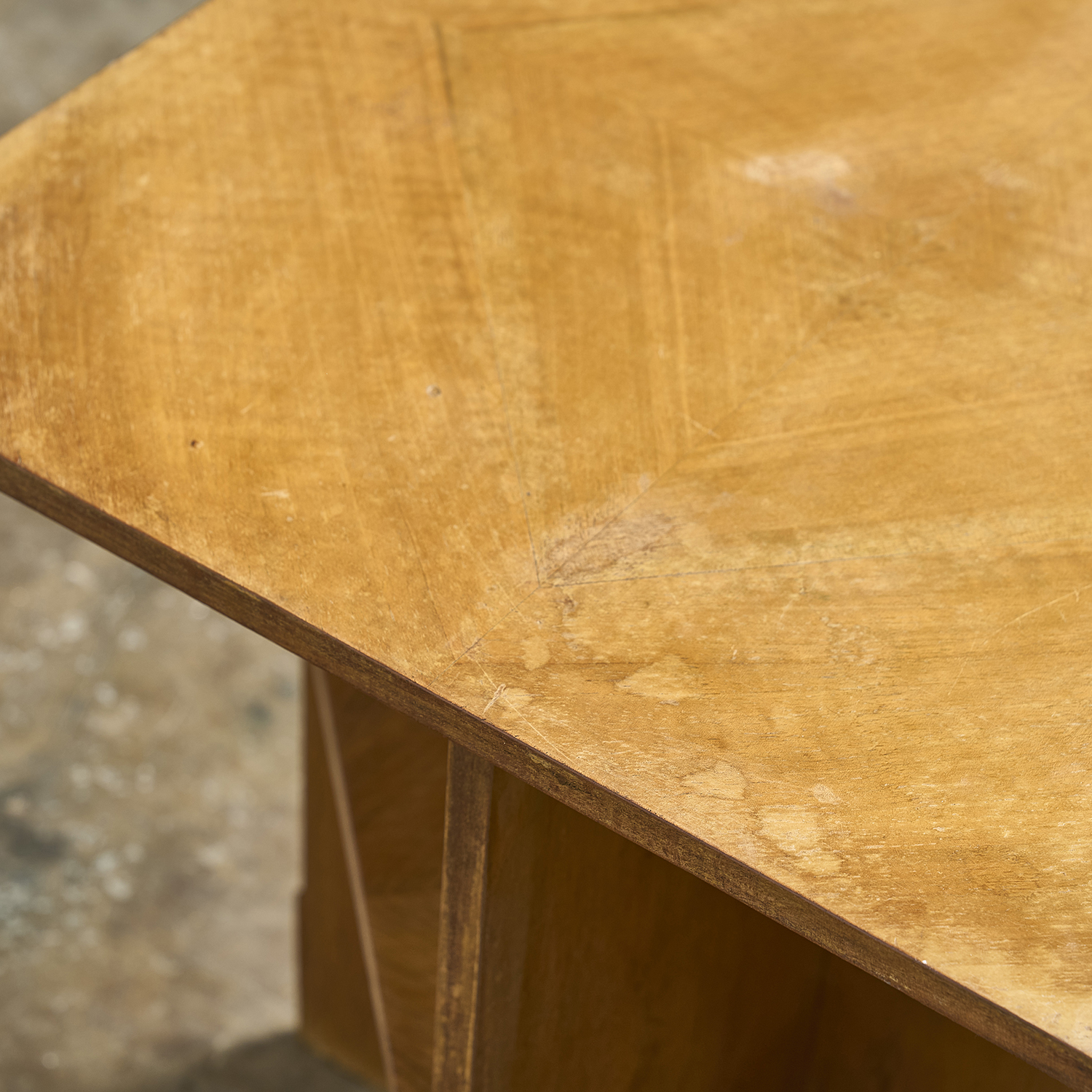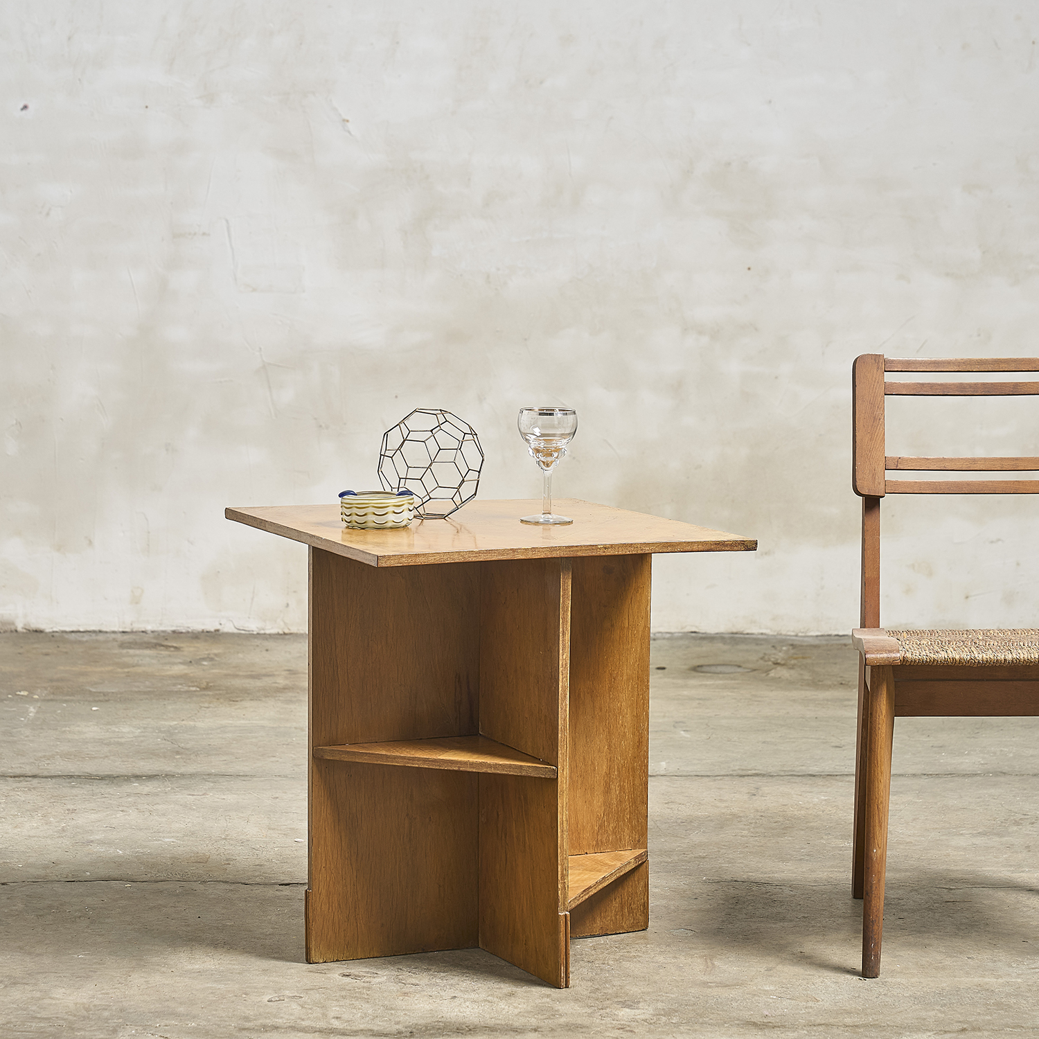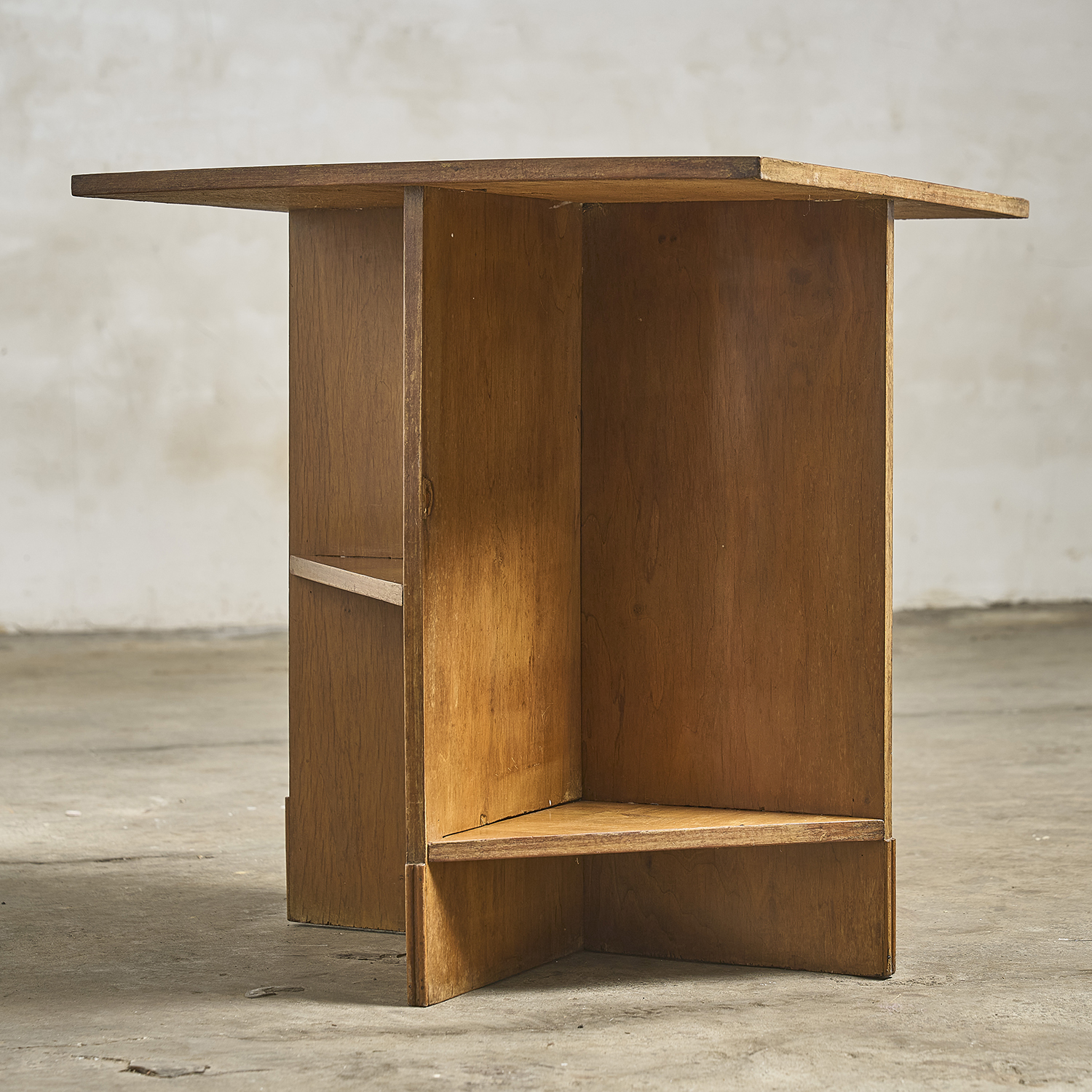 Guéridon art déco en placage de noyer à plateau carré reposant sur un piètement plein en croix découvrant des étagères asymétriques.