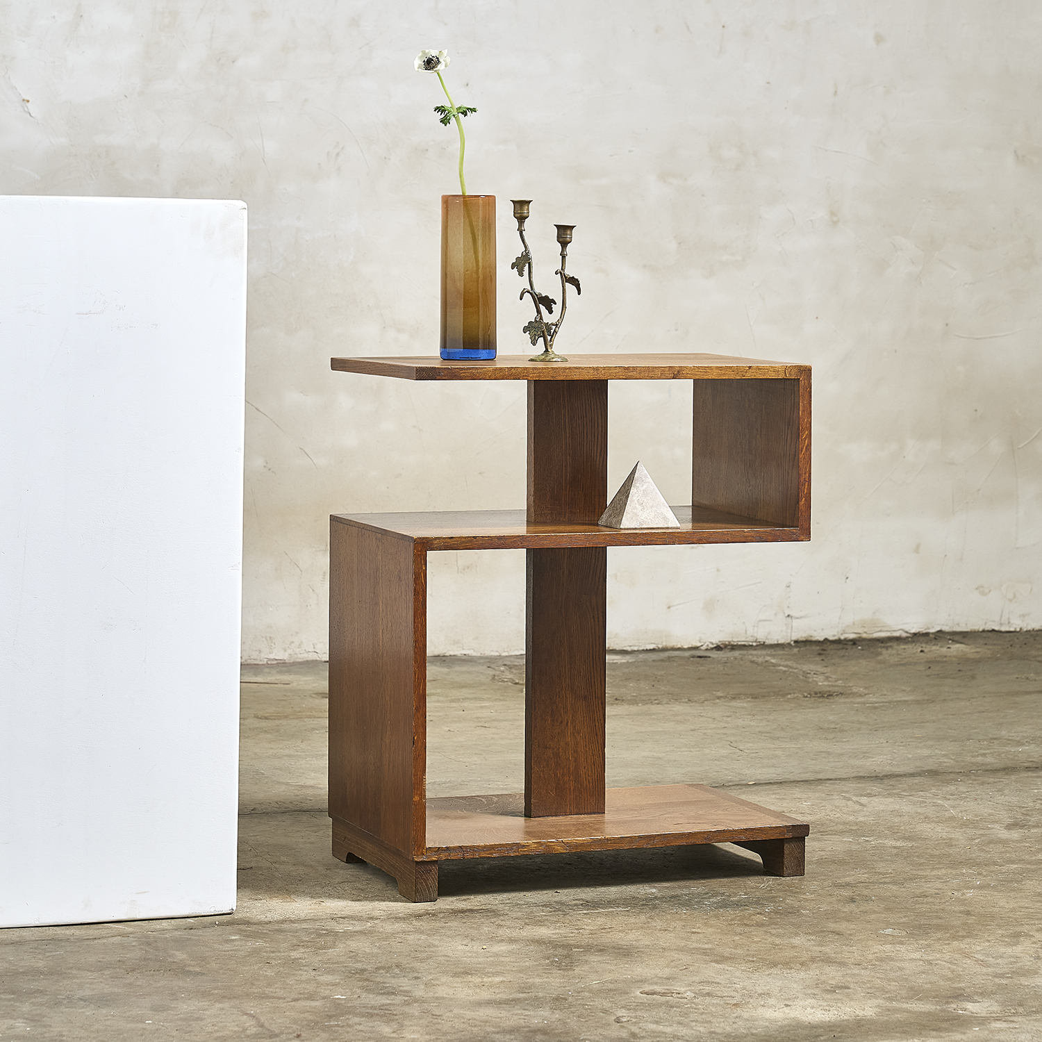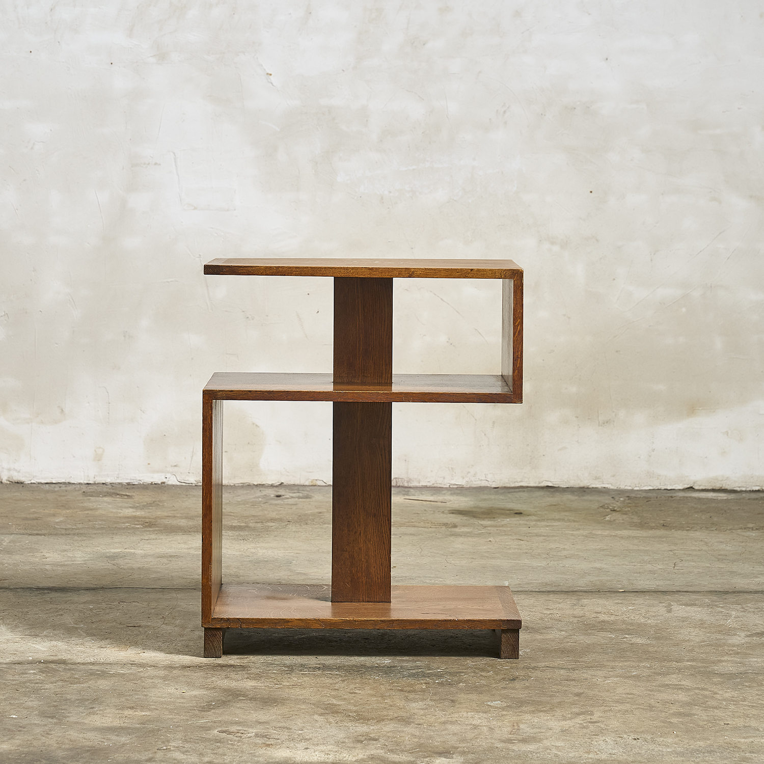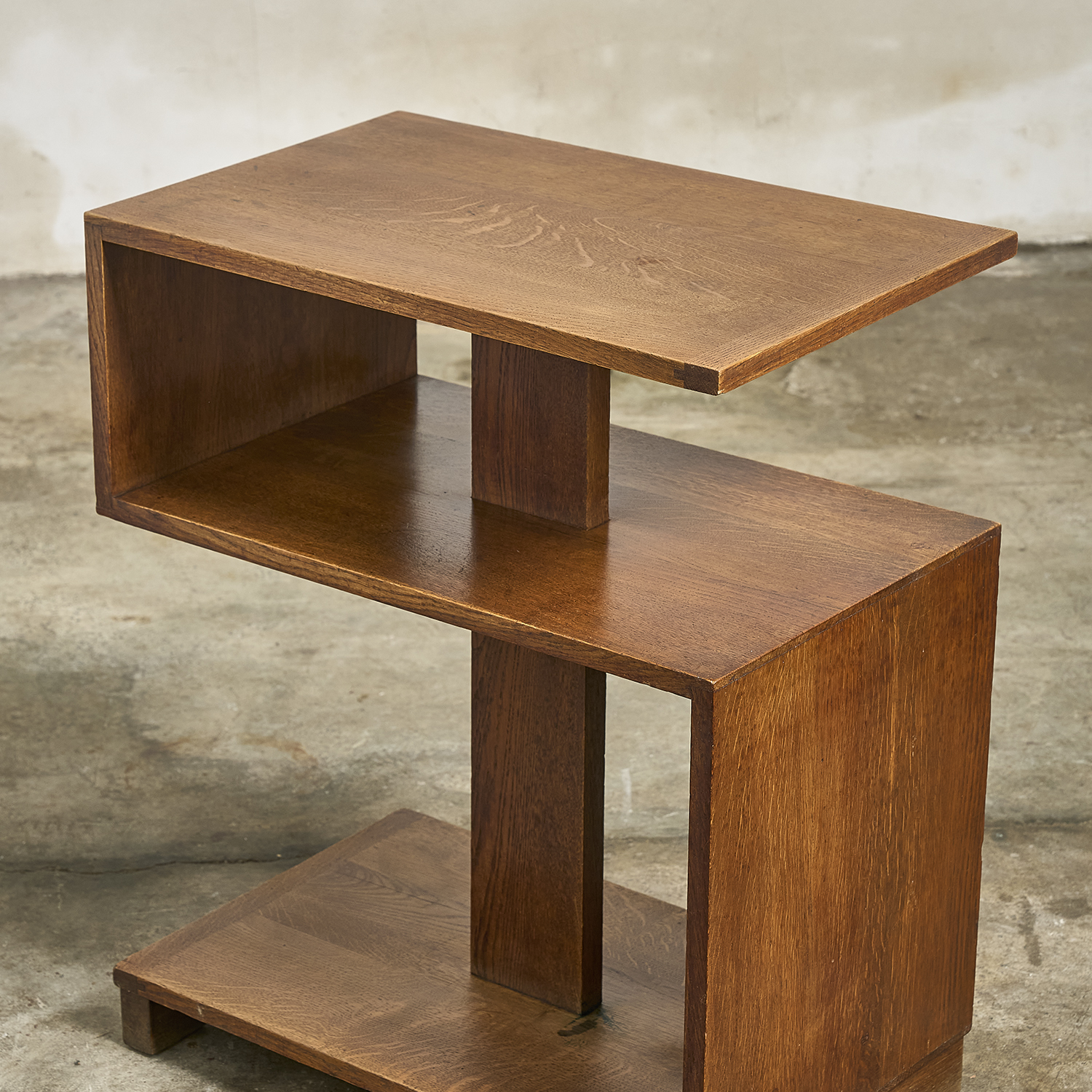 Bout de canapé en chêne massif de style Art Déco de forme architecturée à tablettes et étagères.