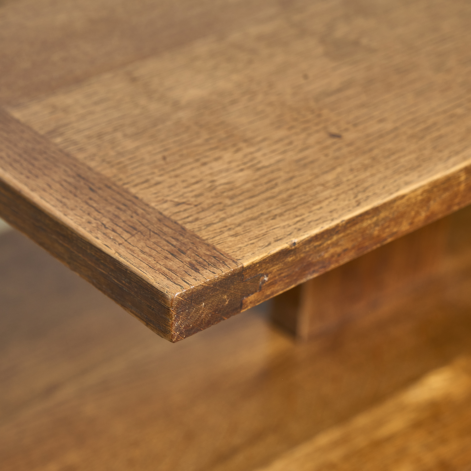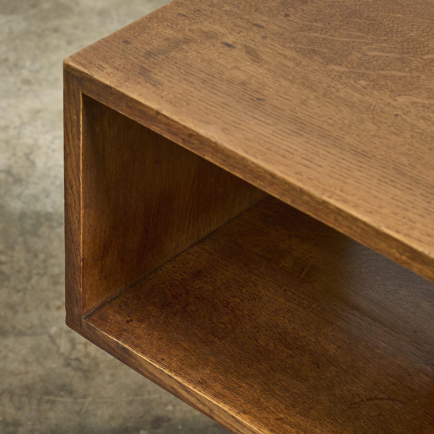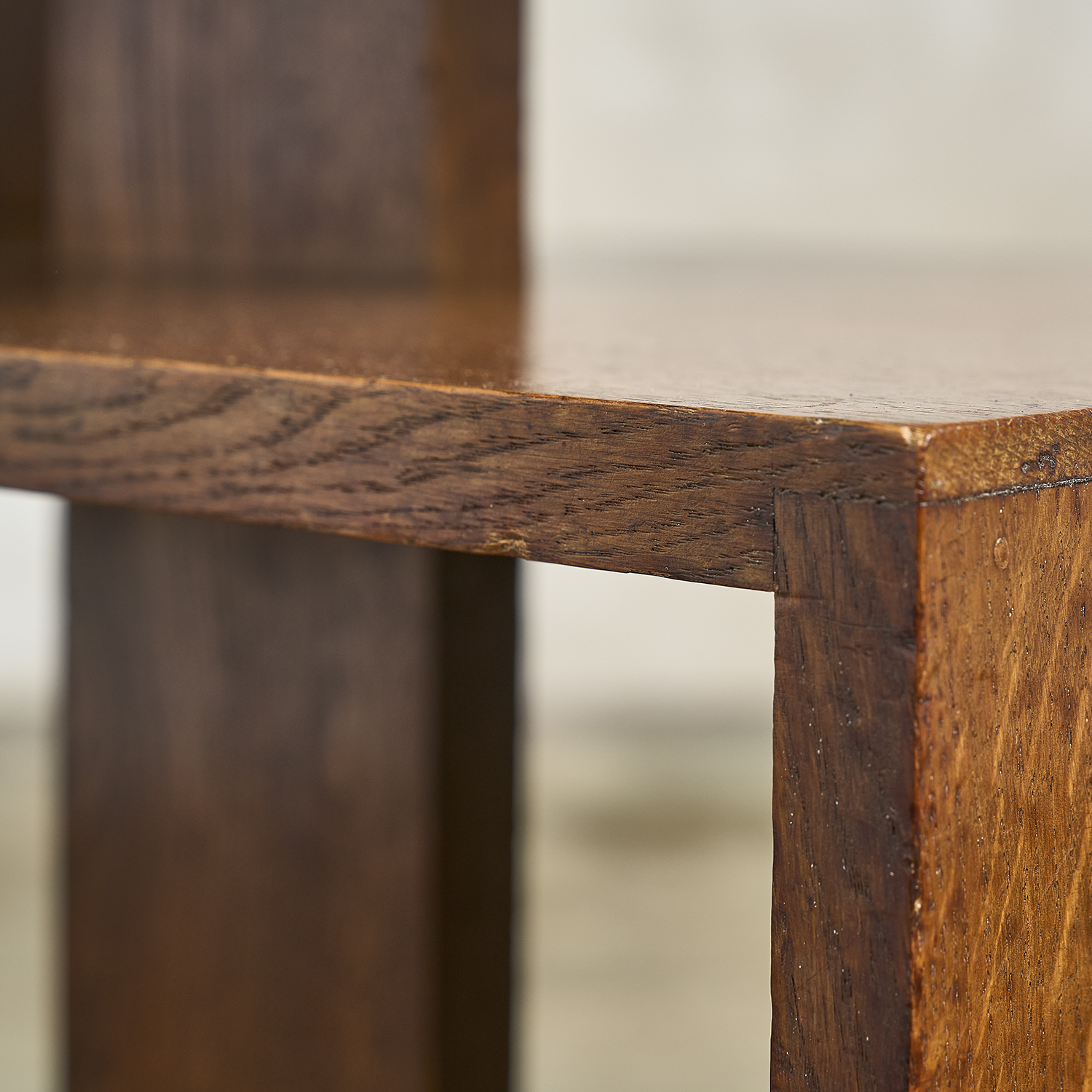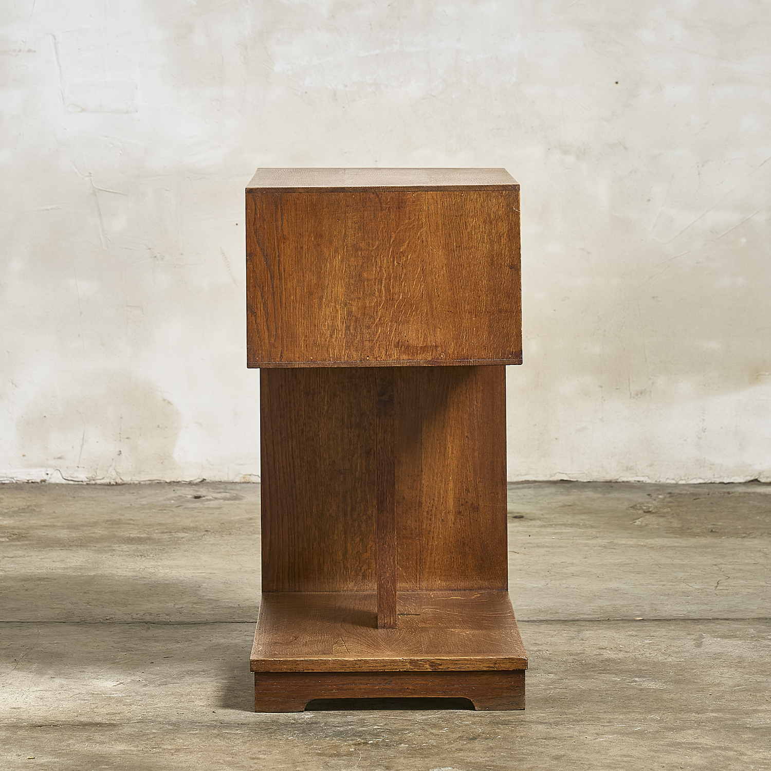 Bout de canapé en chêne massif de style Art Déco de forme architecturée à tablettes et étagères.