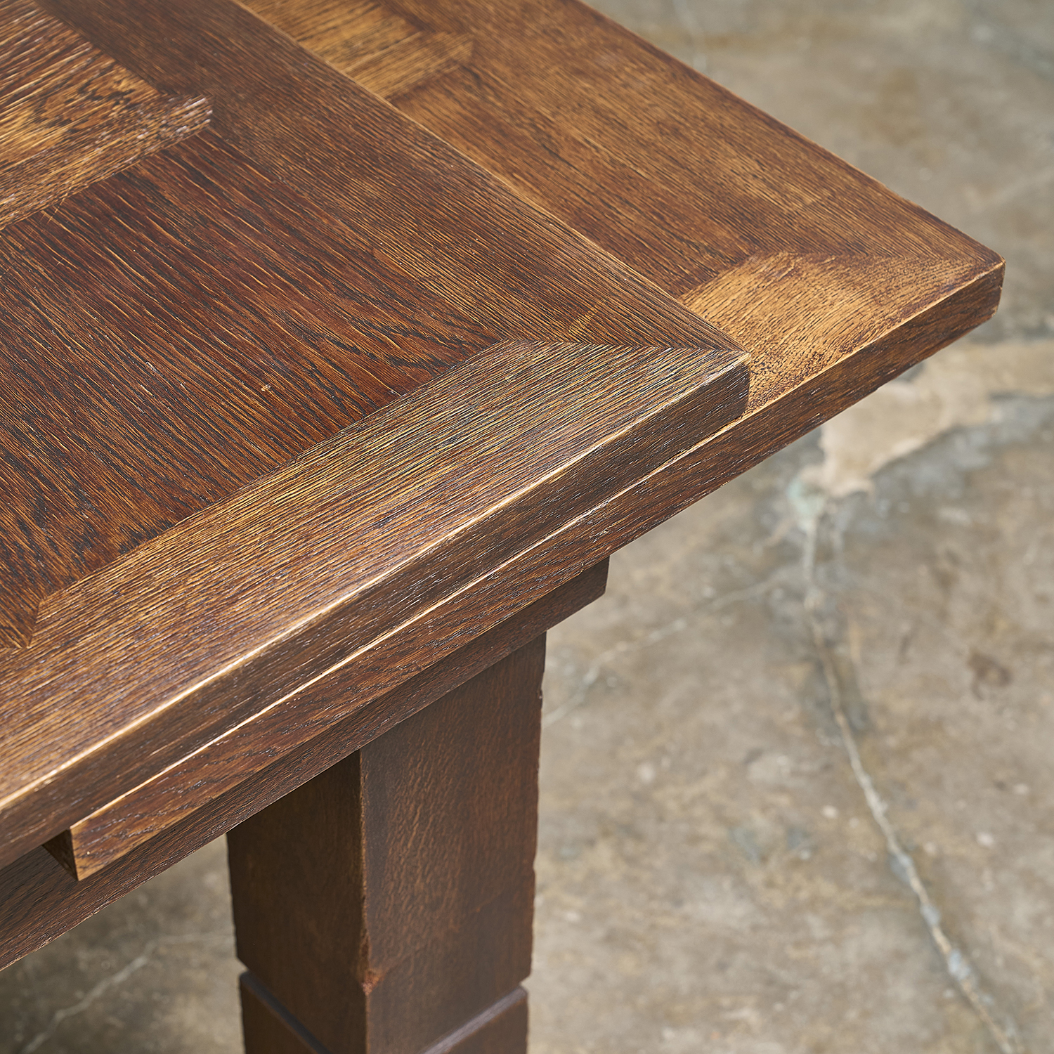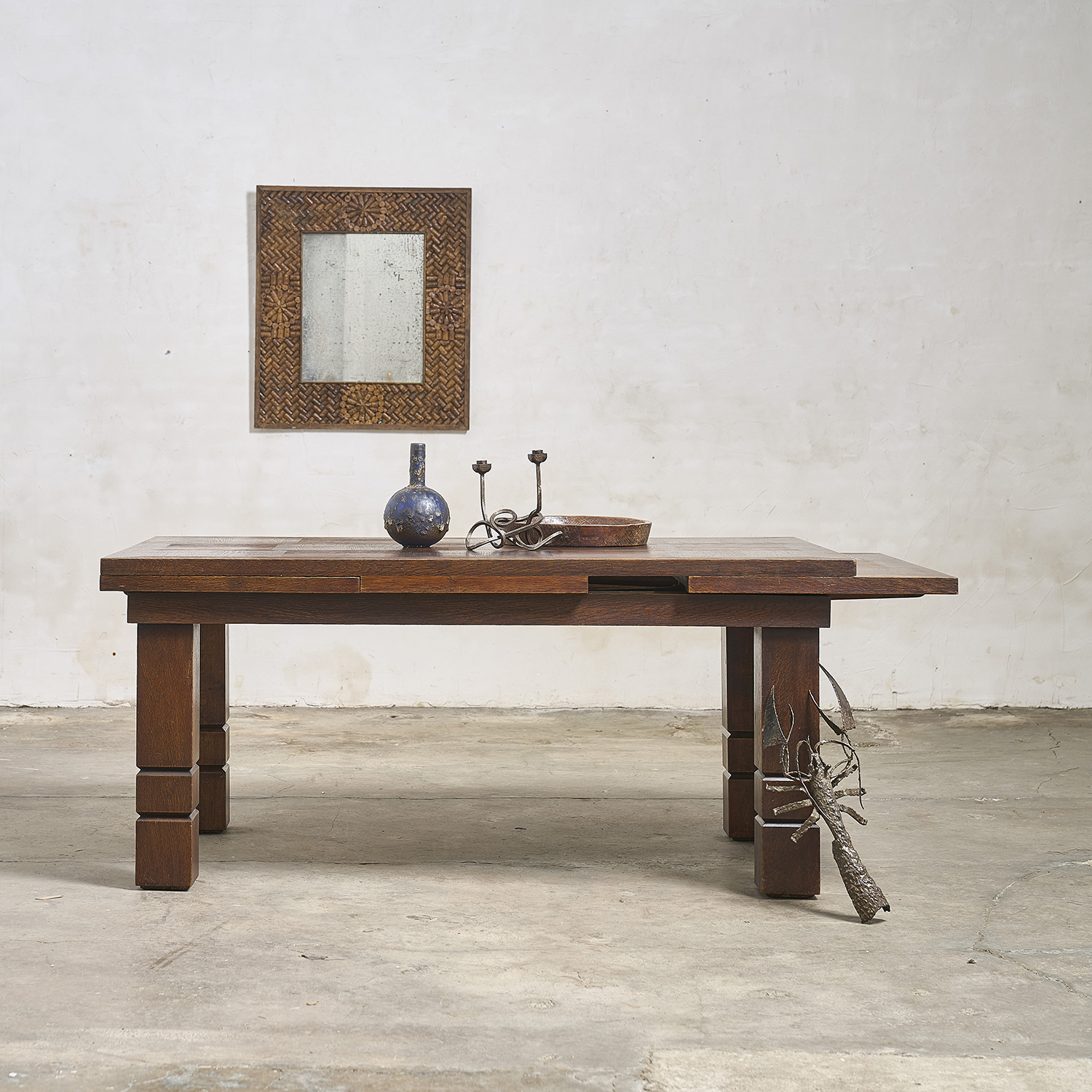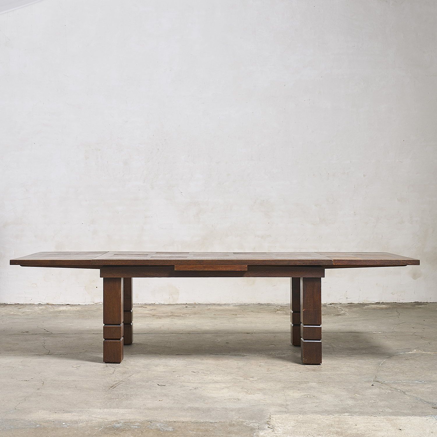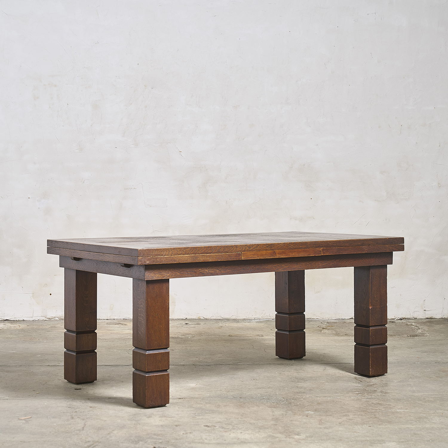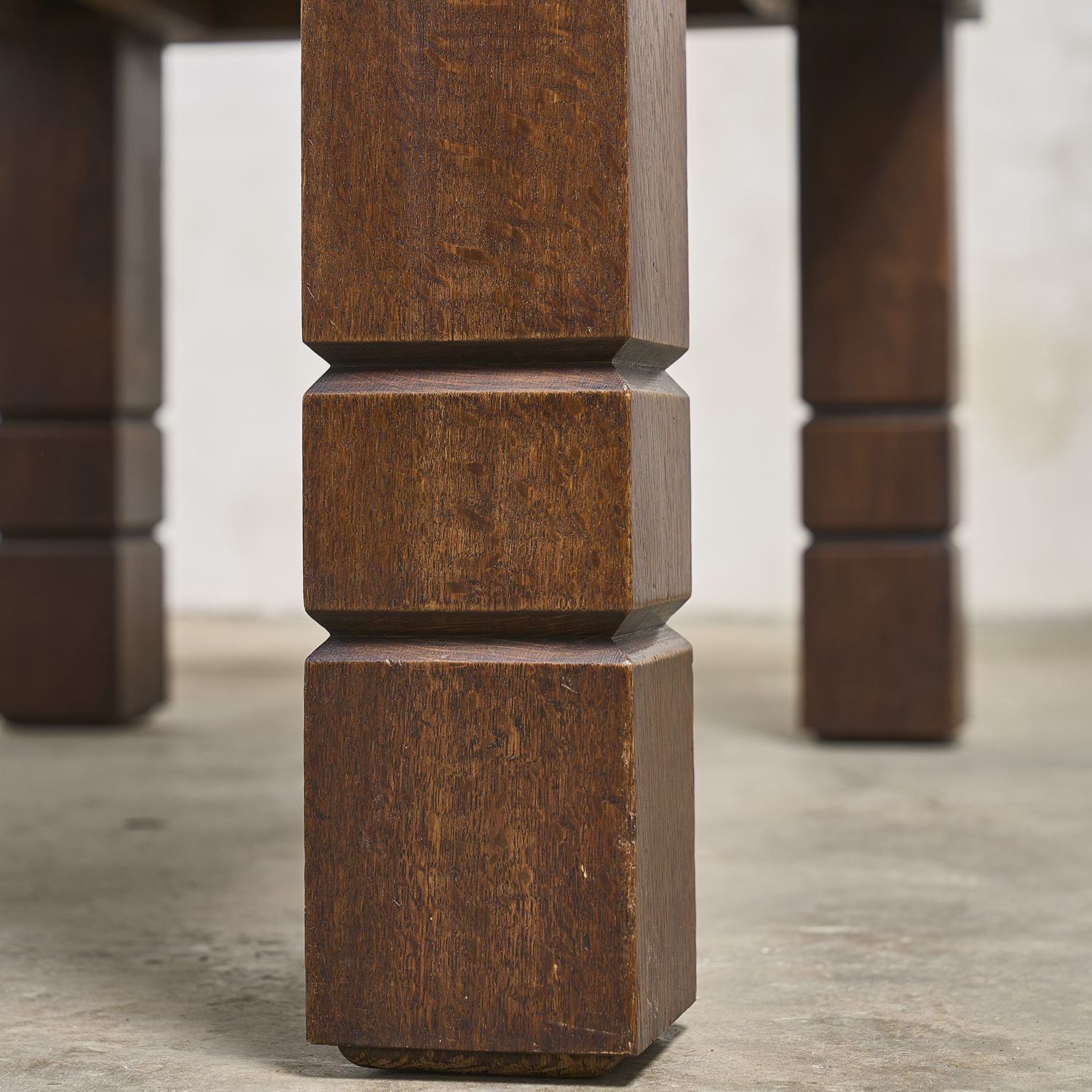 Table à dîner en chêne à plateau rectangulaire, reposant sur 4 imposants pieds droits de section carrée, France, vers 1940.