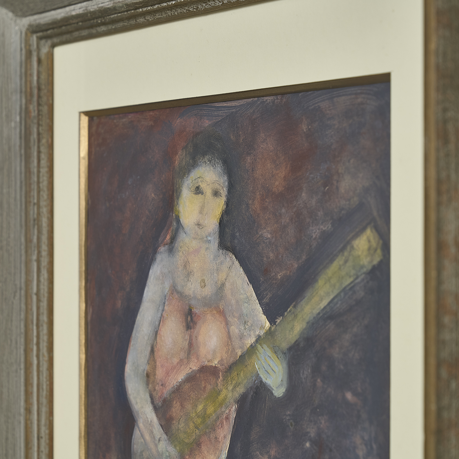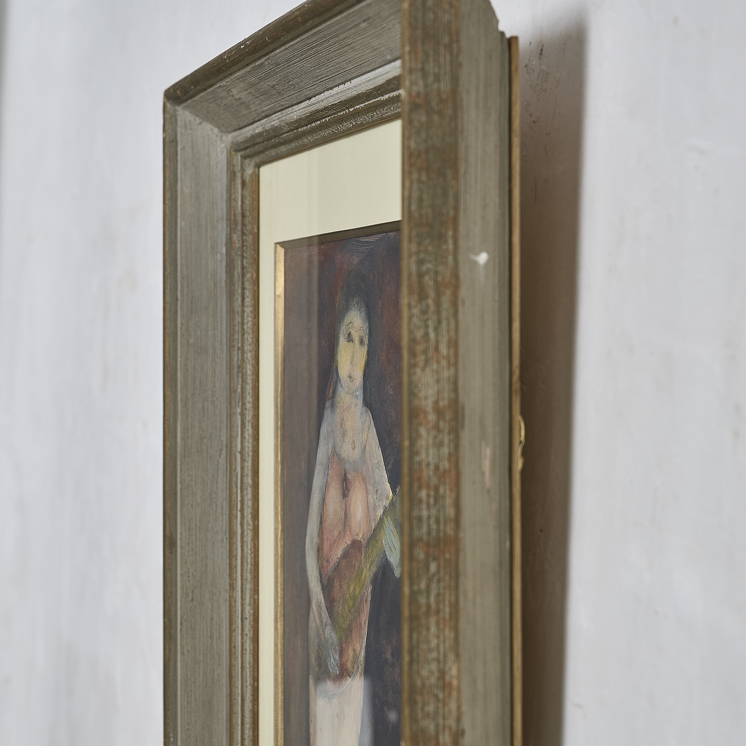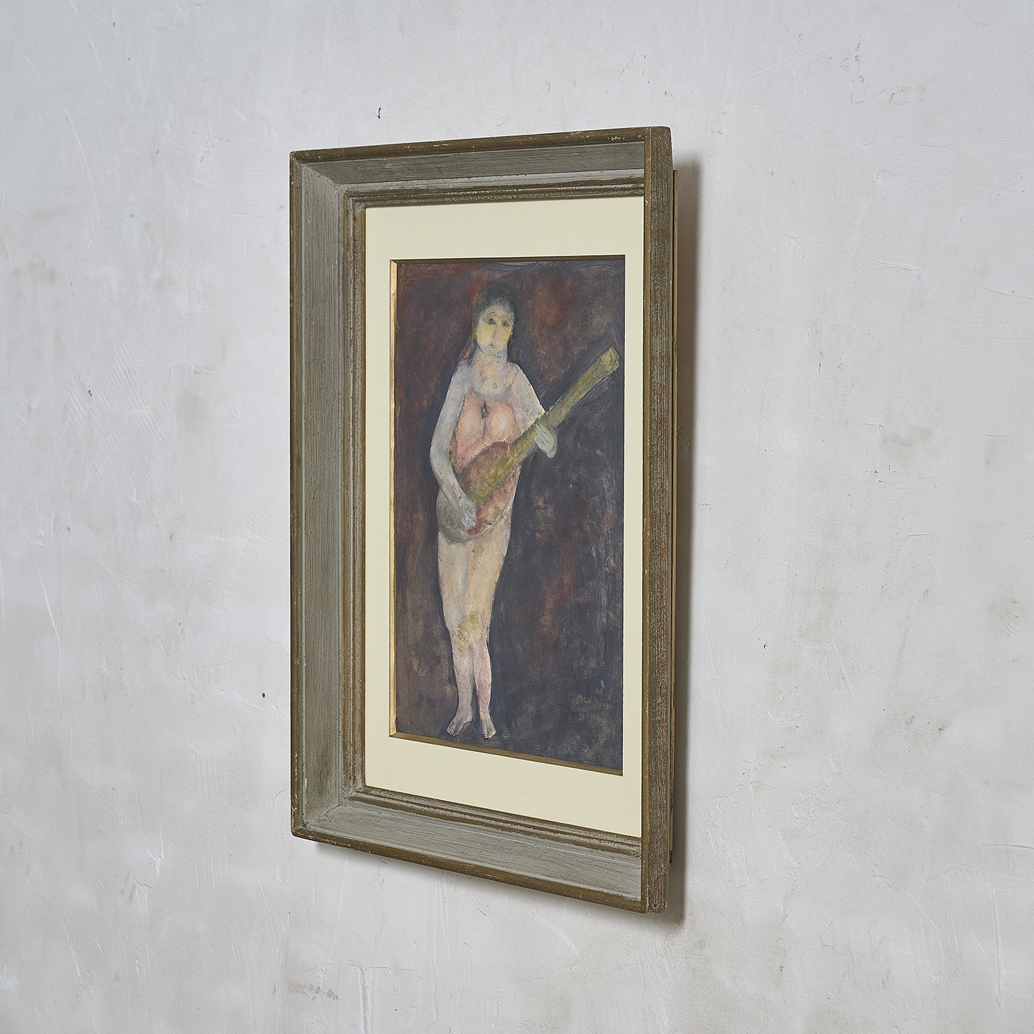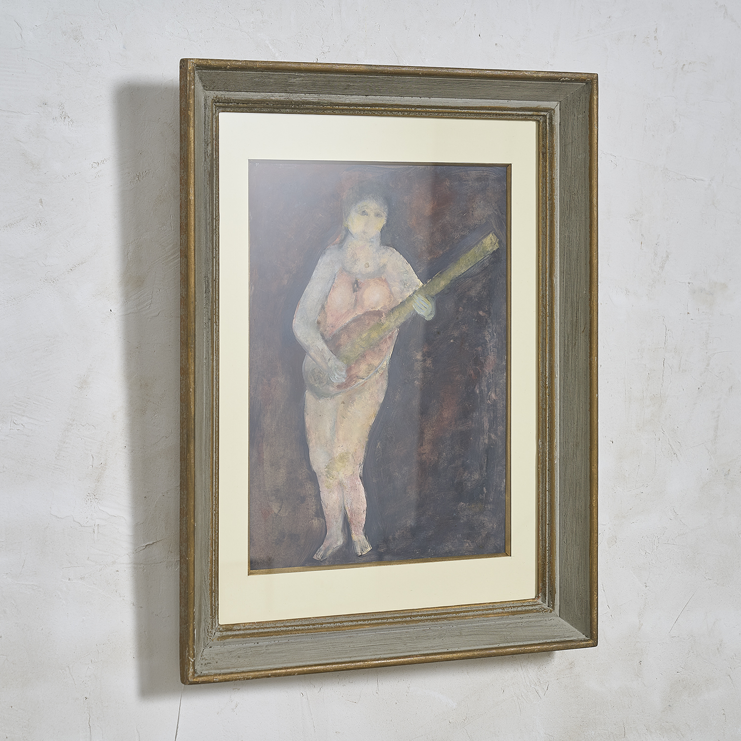 Musicienne au luth. Gouache encadrée aux teintes automnales.