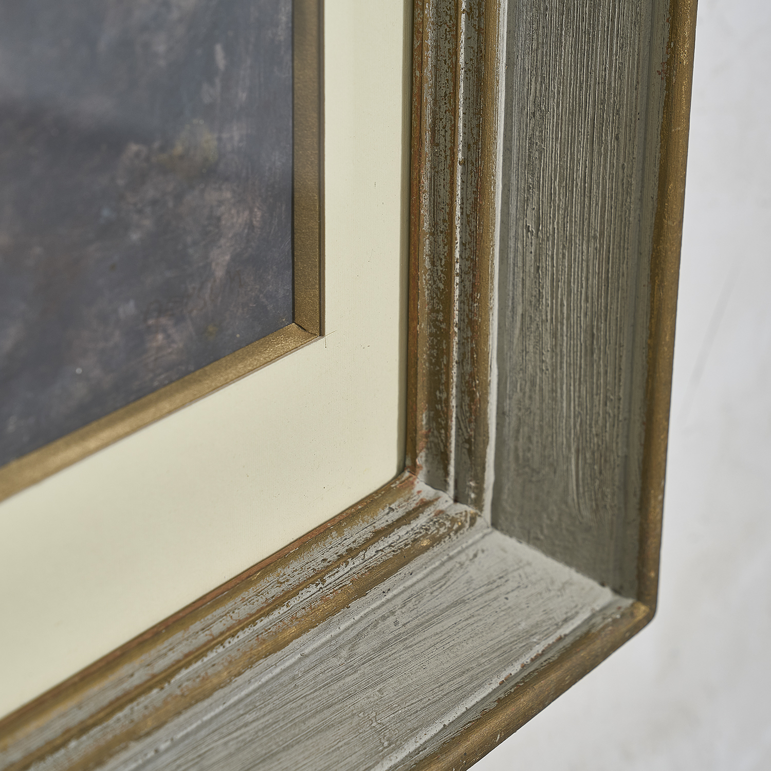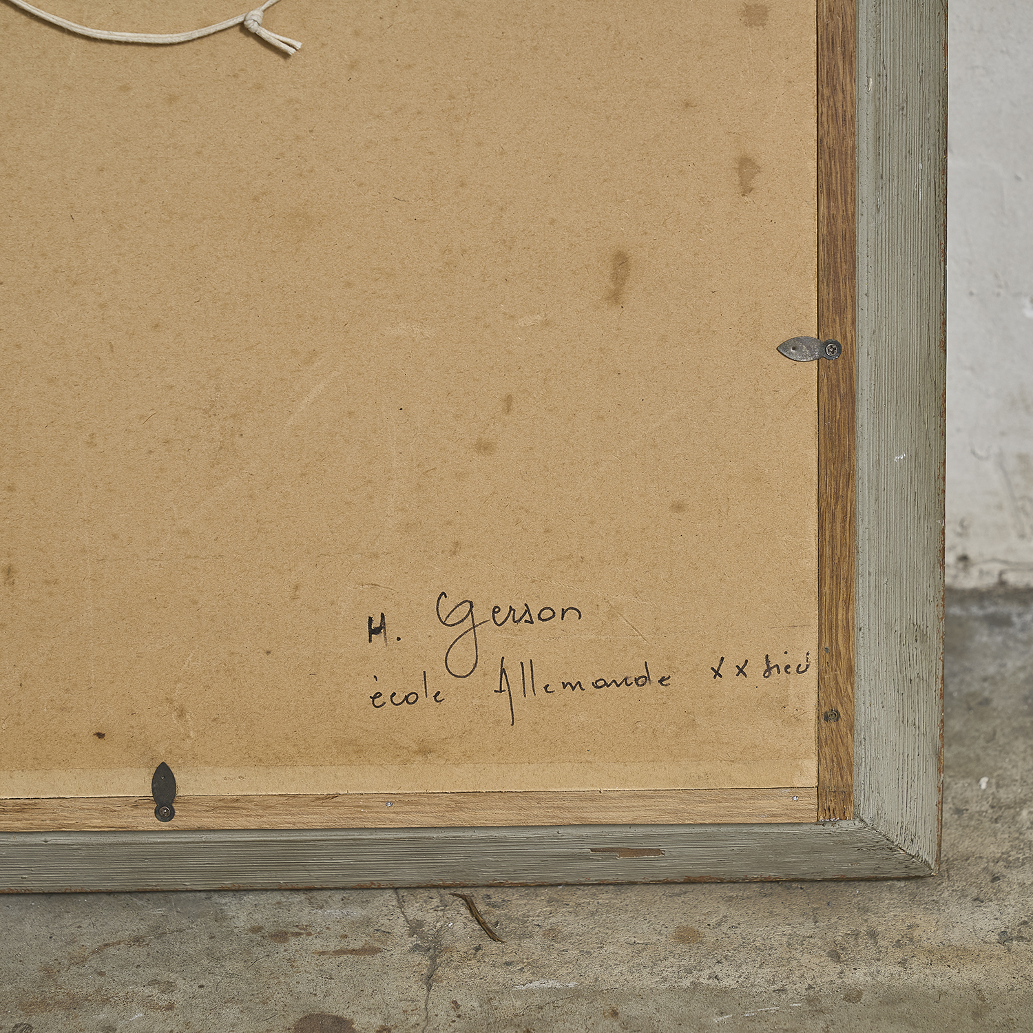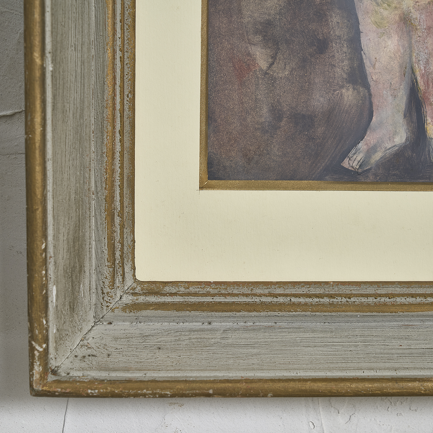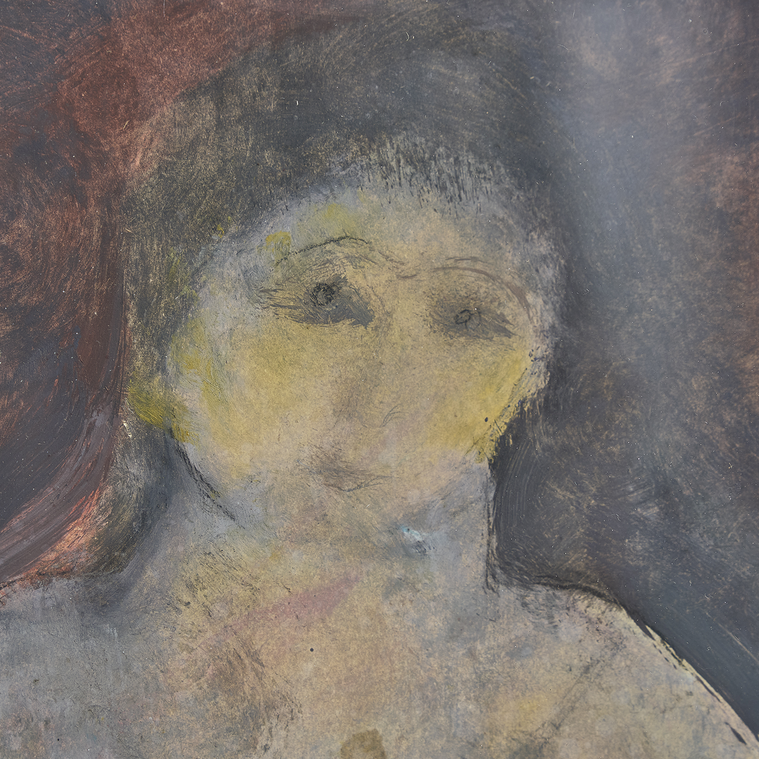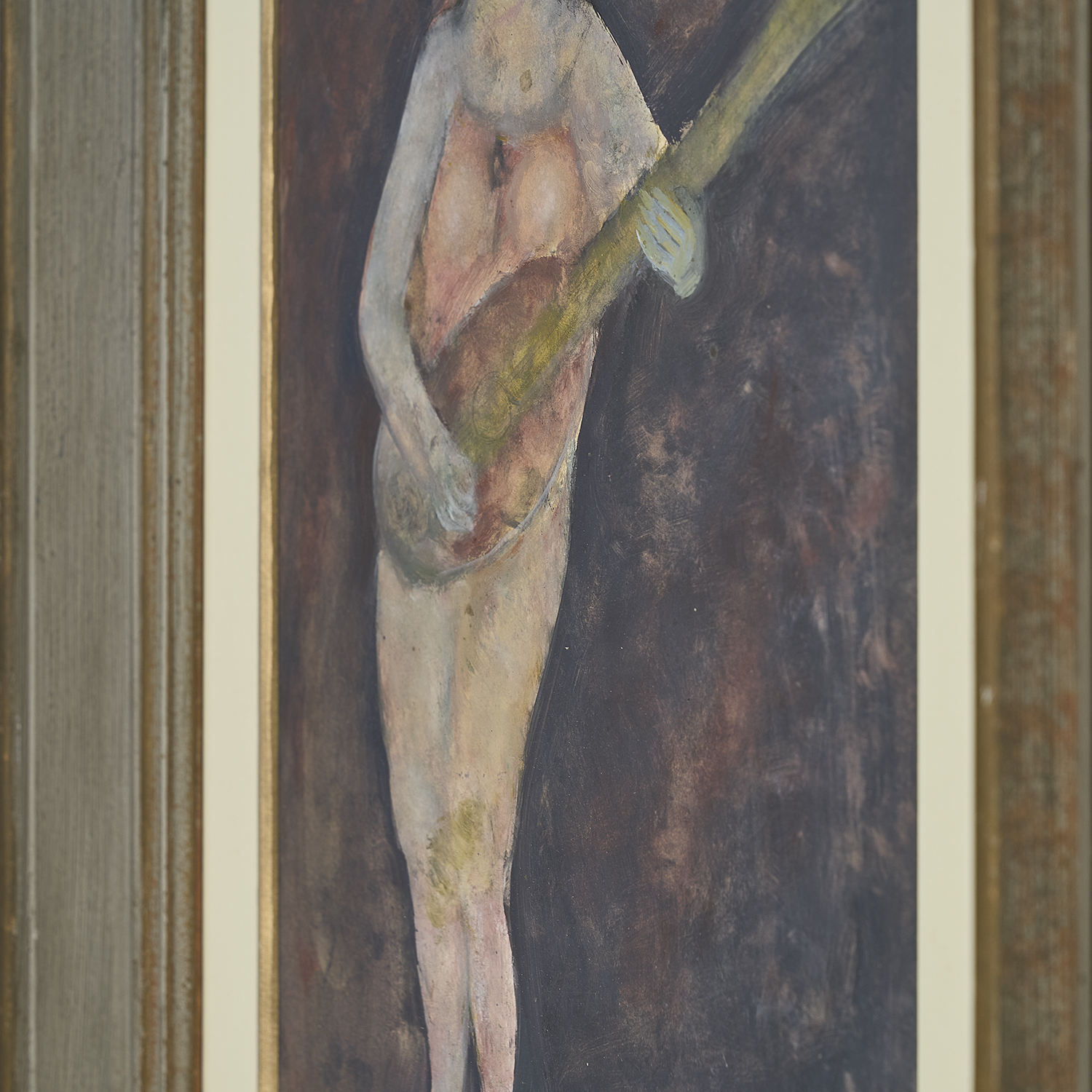 Musicienne au luth. Gouache encadrée aux teintes automnales.