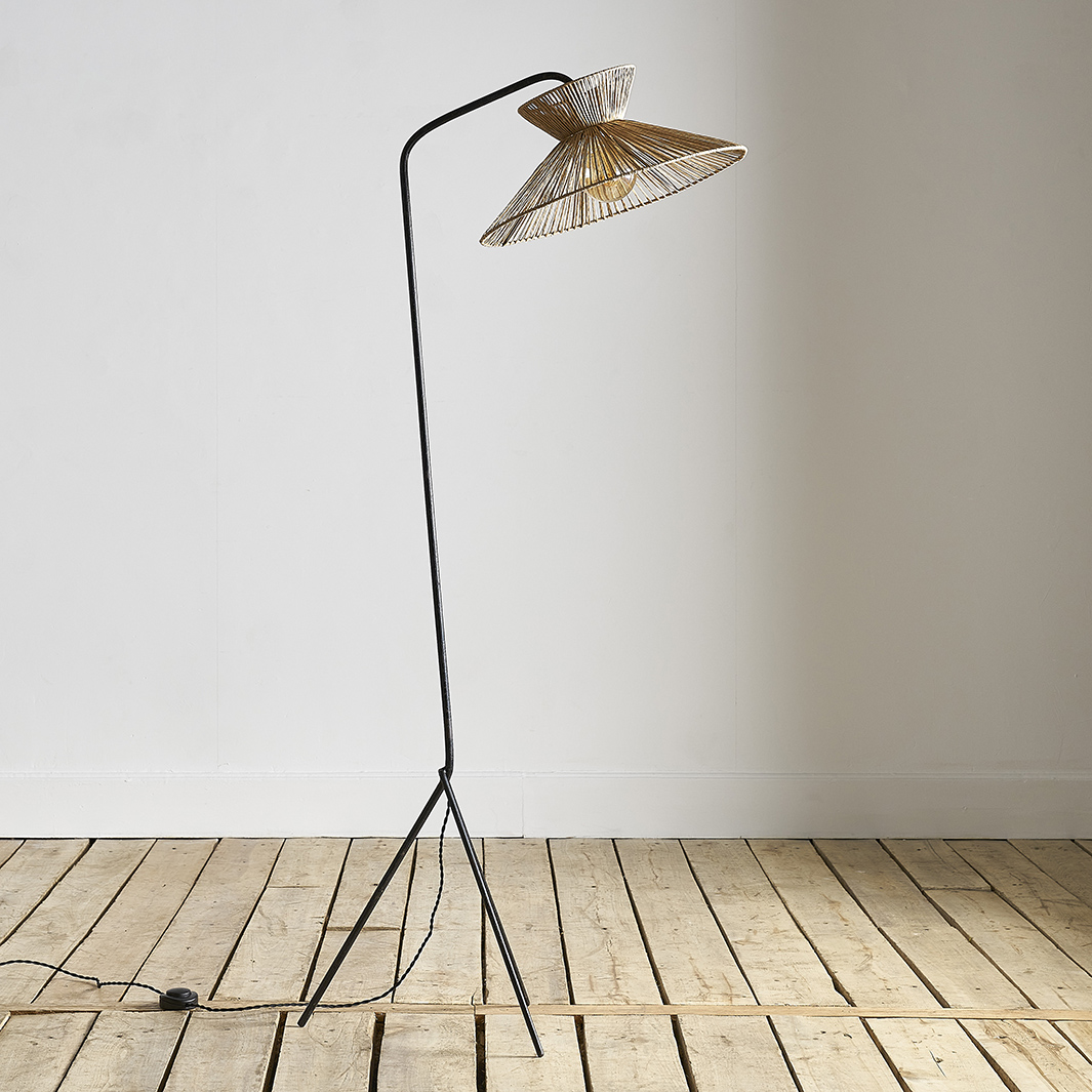 Lampadaire en placage de noyer, le fût de section carré sur une base asymétrique faisant office d’étagères.