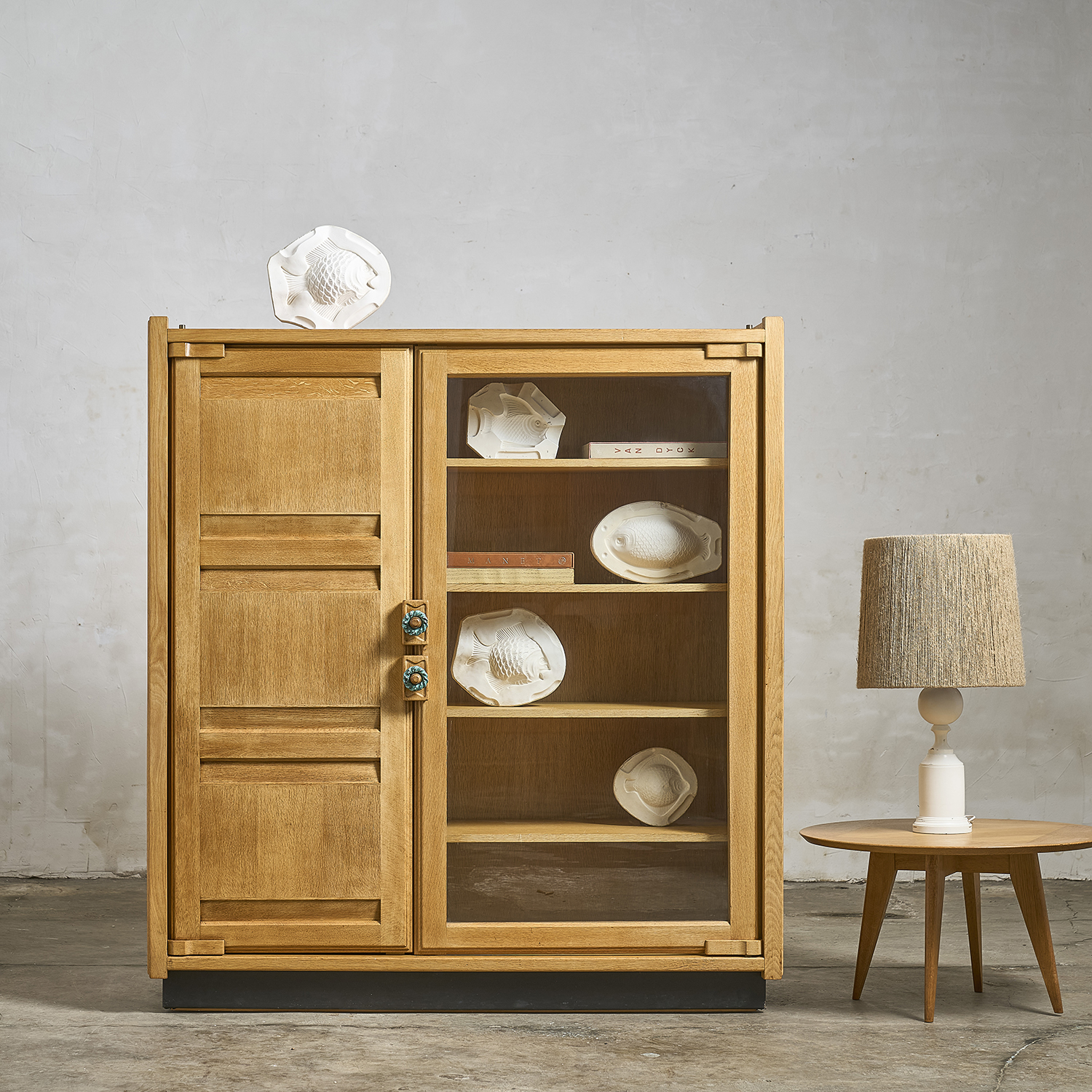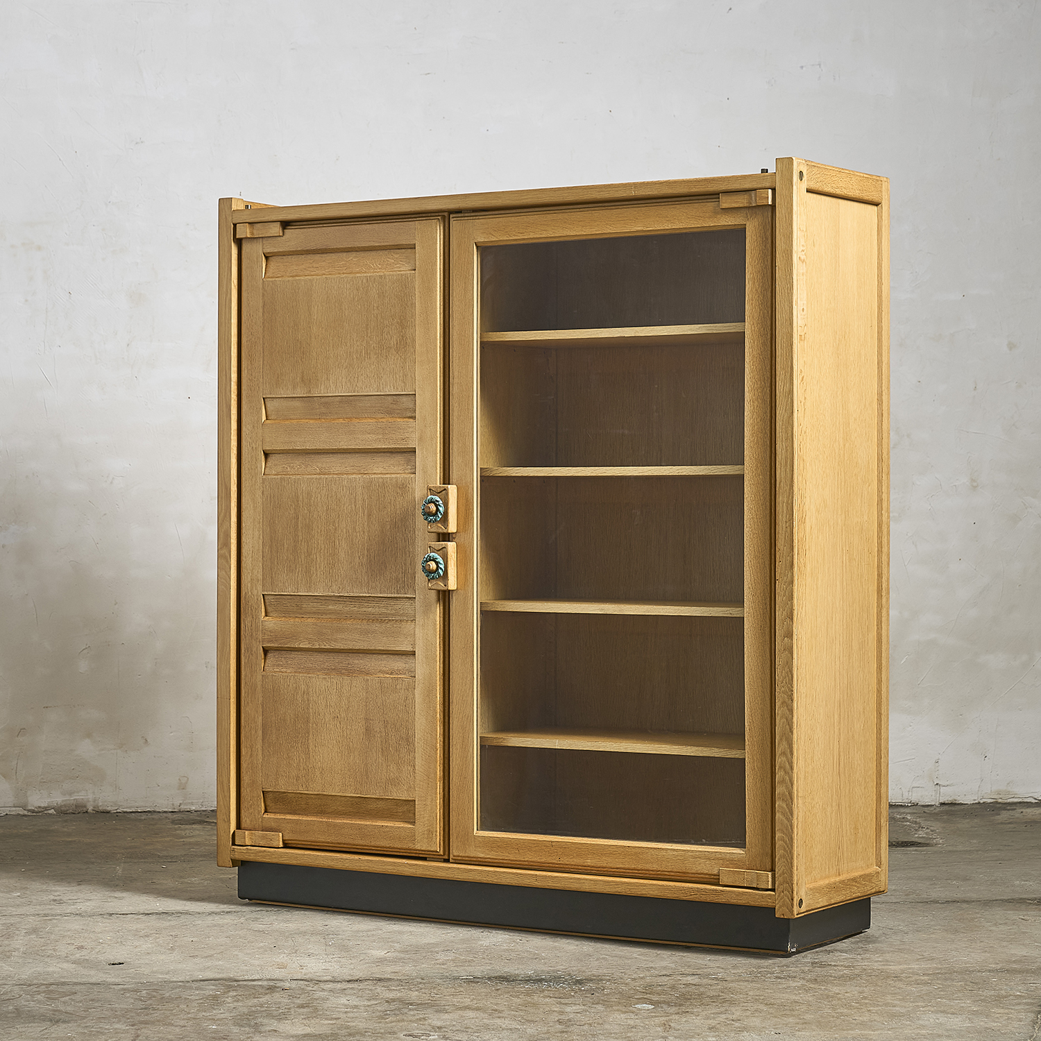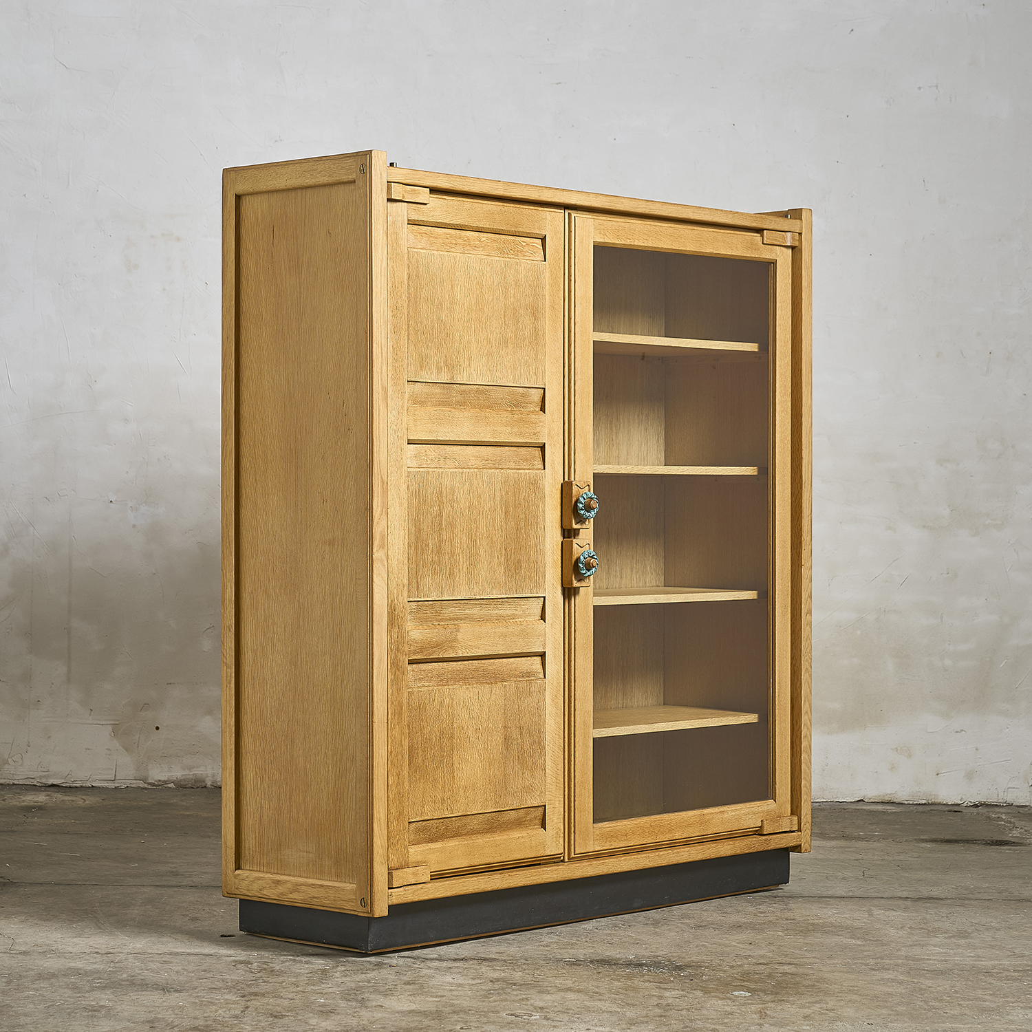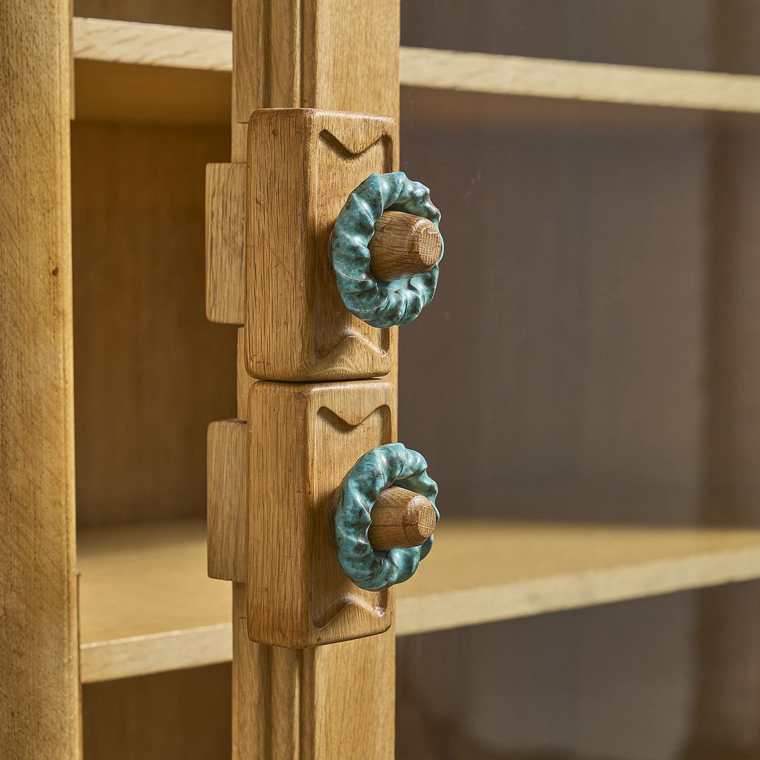 Armoire vitrine en chêne ouvrant par deux portes, l’une en chêne massif mouluré et l’autre vitrée, poignées à anneaux en céramique.