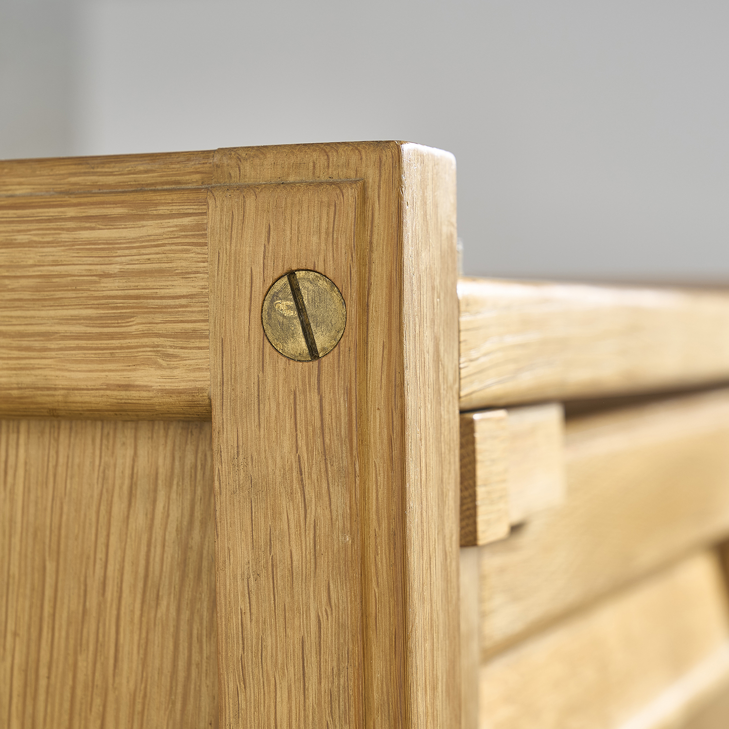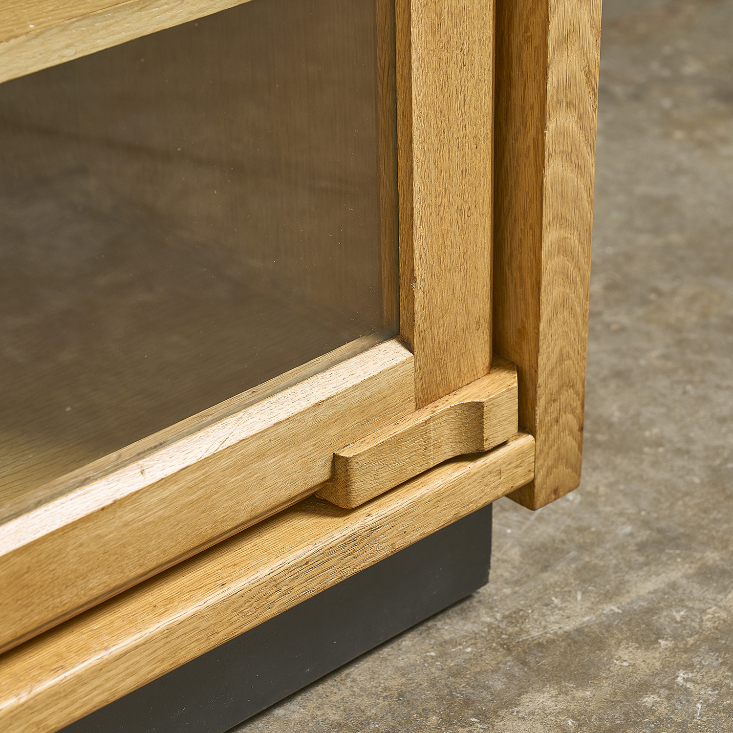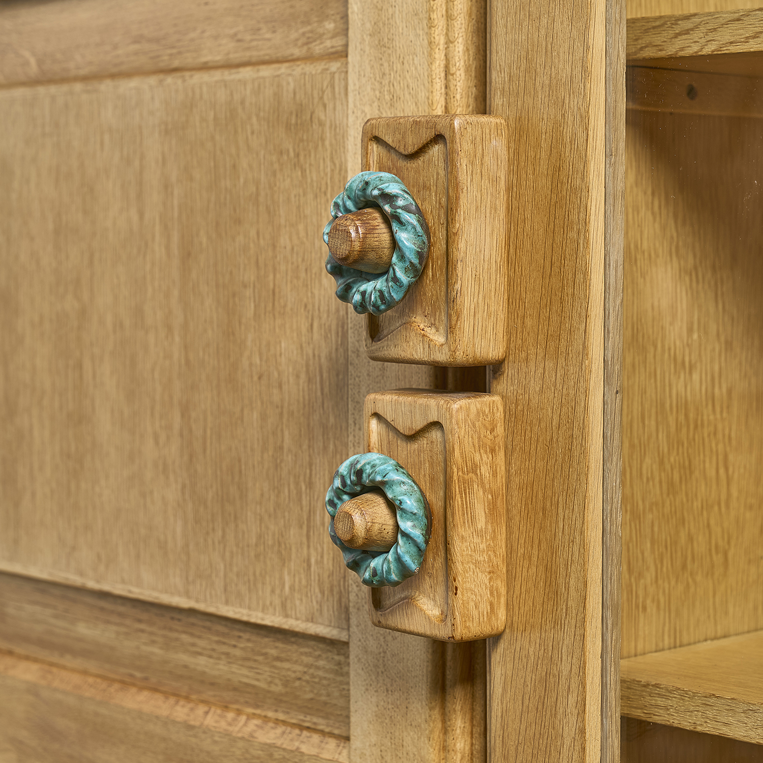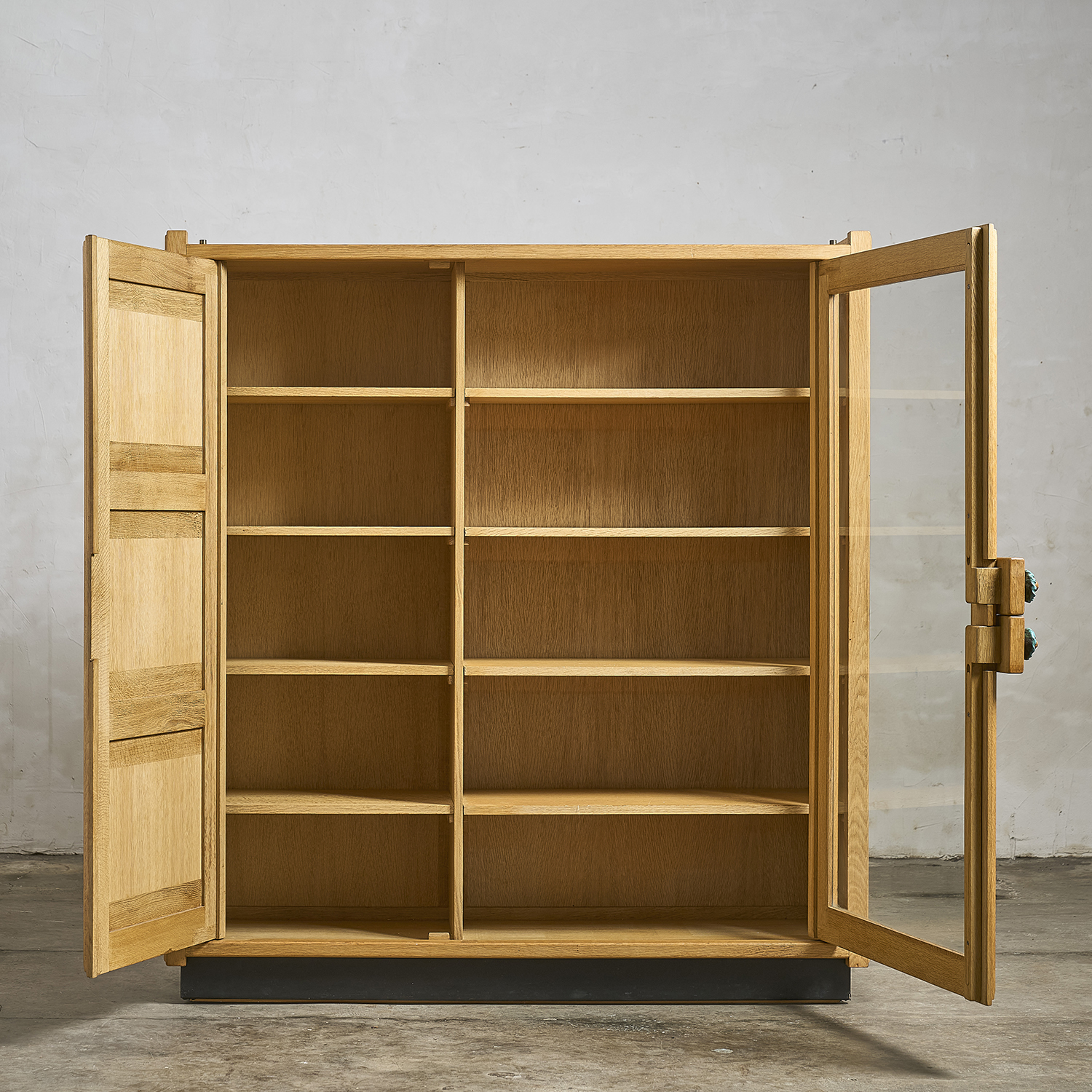 Armoire vitrine en chêne ouvrant par deux portes, l’une en chêne massif mouluré et l’autre vitrée, poignées à anneaux en céramique.