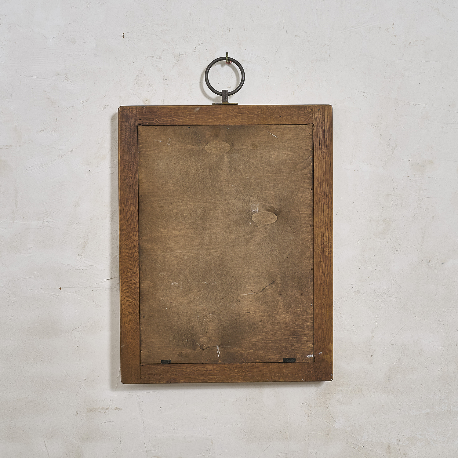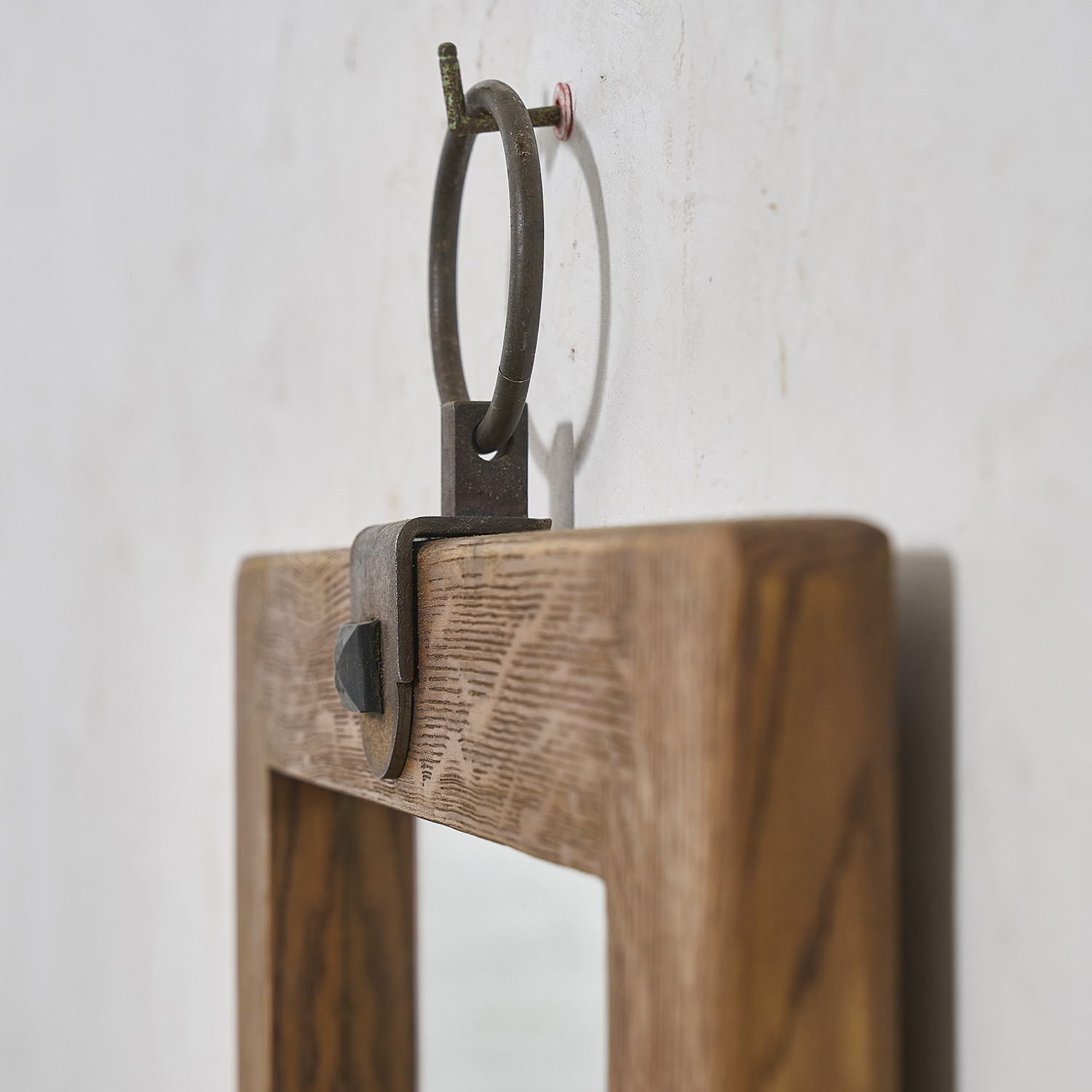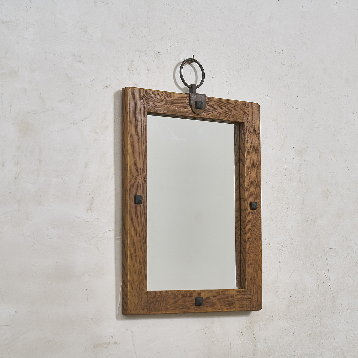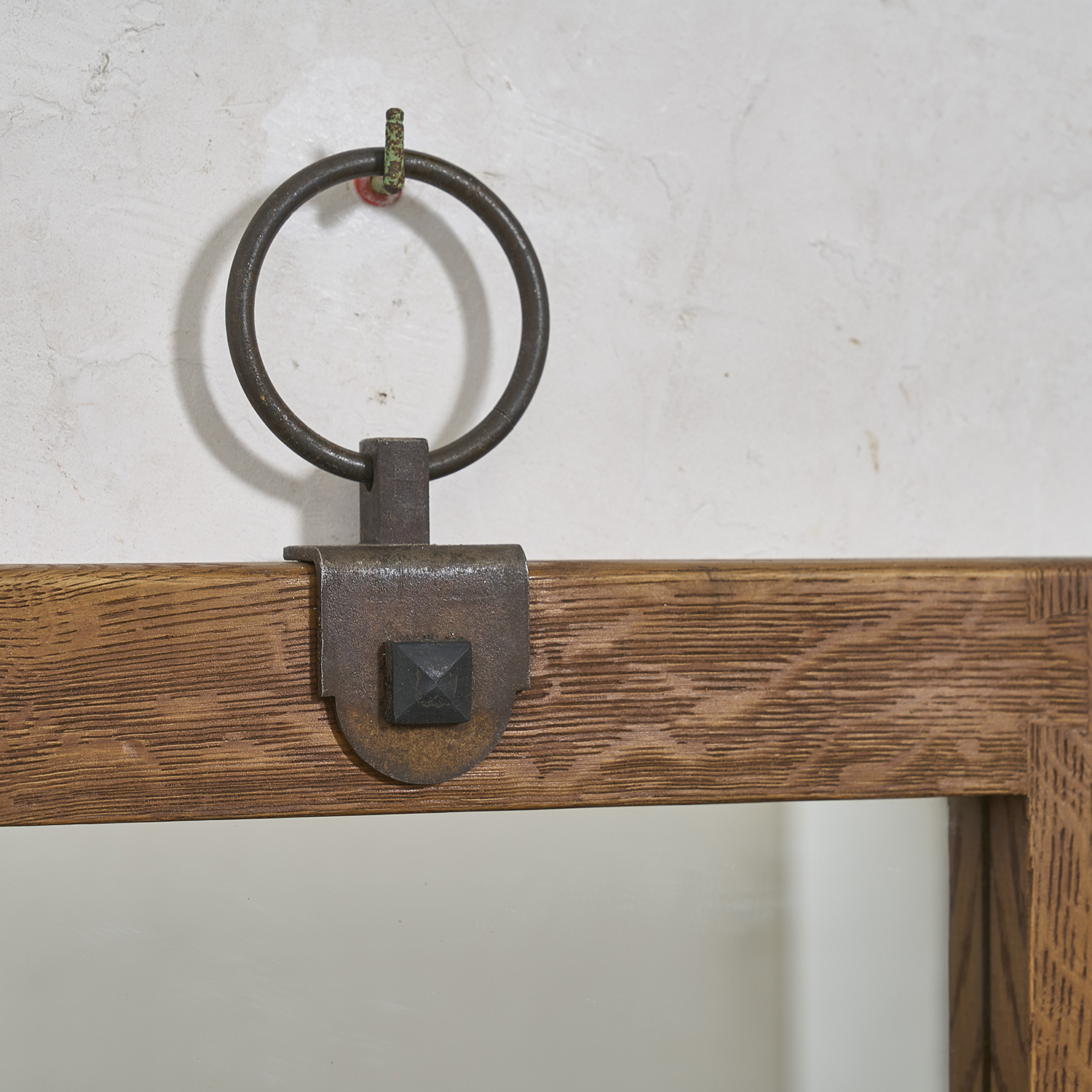 Miroir à encadrement en chêne à décor de ferrures, clous en fer forgé et important anneau d’attache.