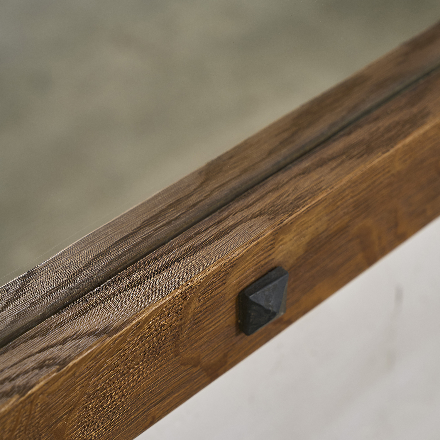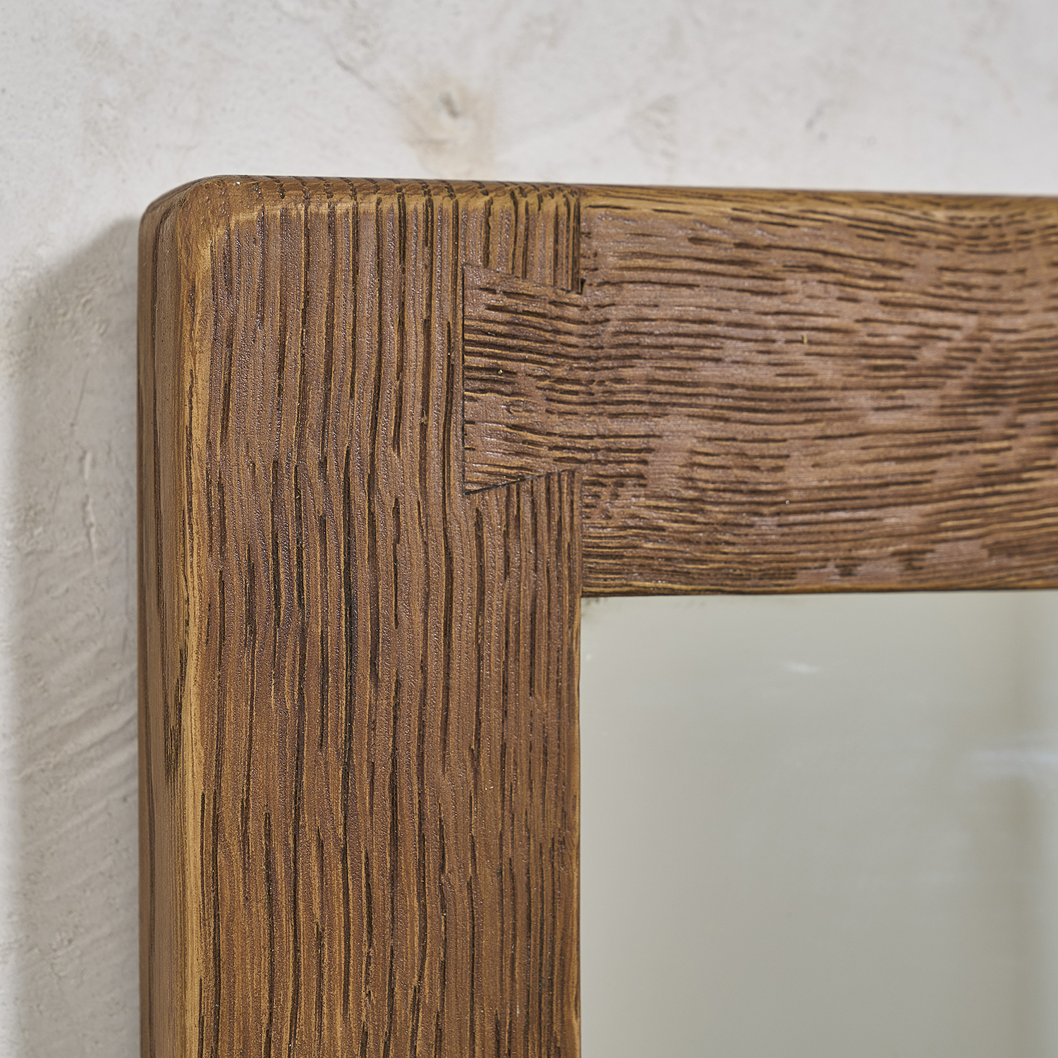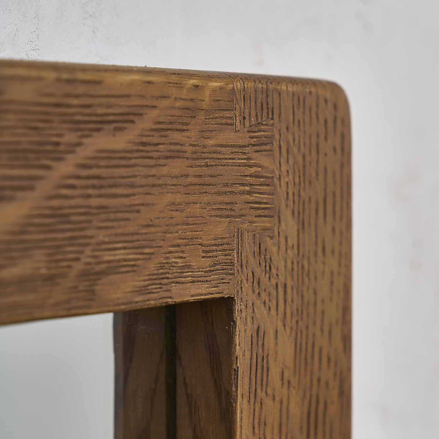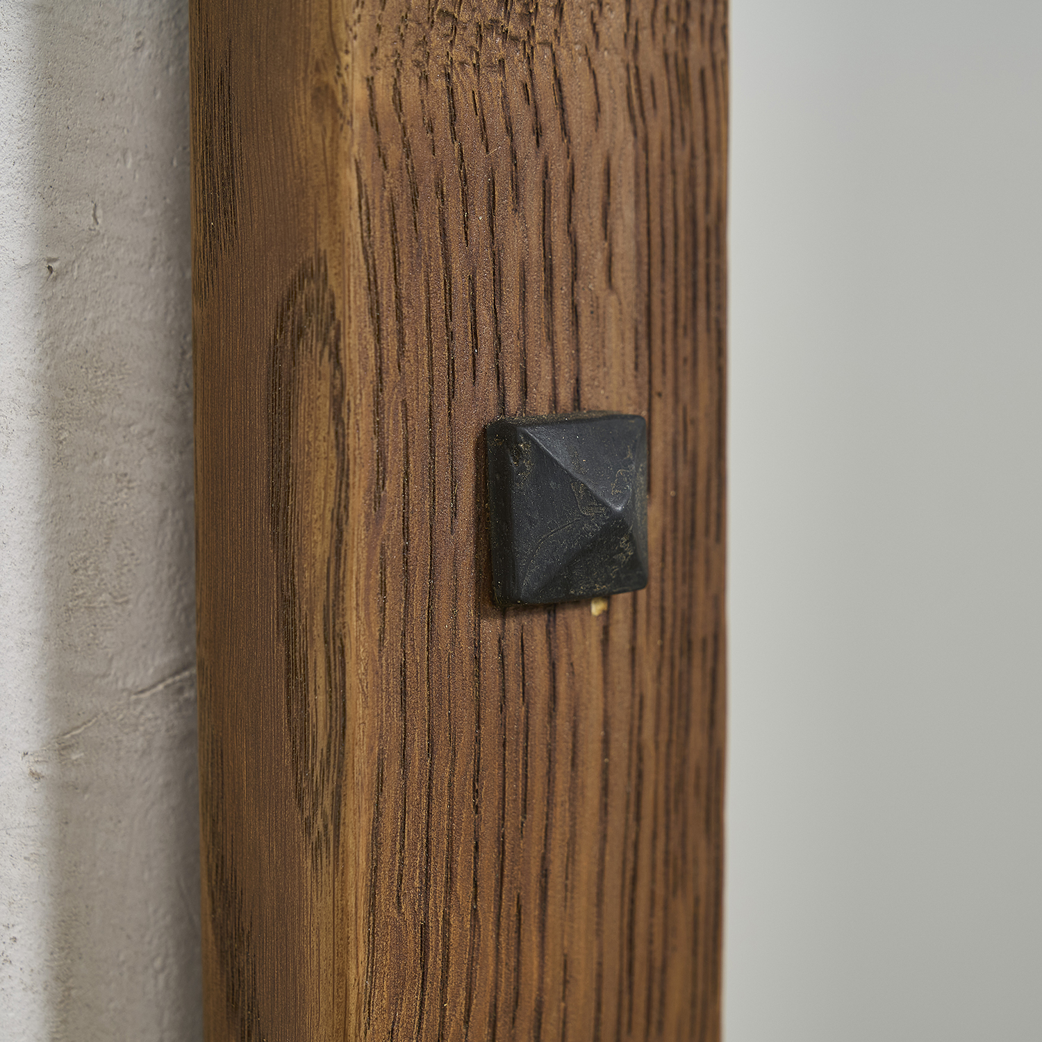 Miroir à encadrement en chêne à décor de ferrures, clous en fer forgé et important anneau d’attache.