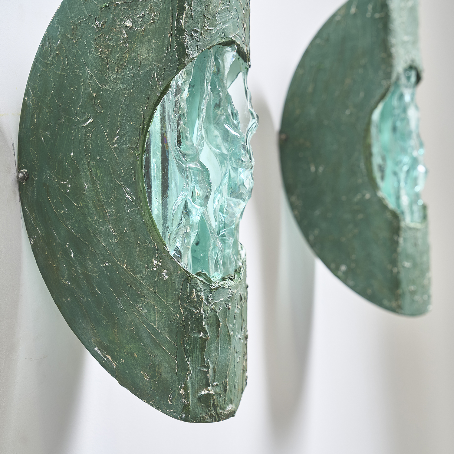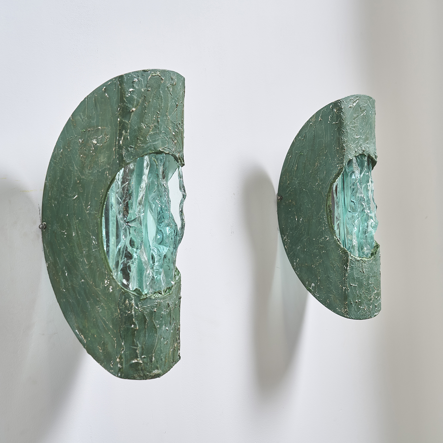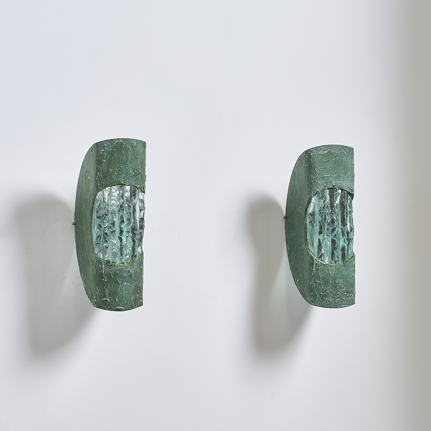 Paire d’appliques en métal découpé enduit et diffuseur en verre épais.