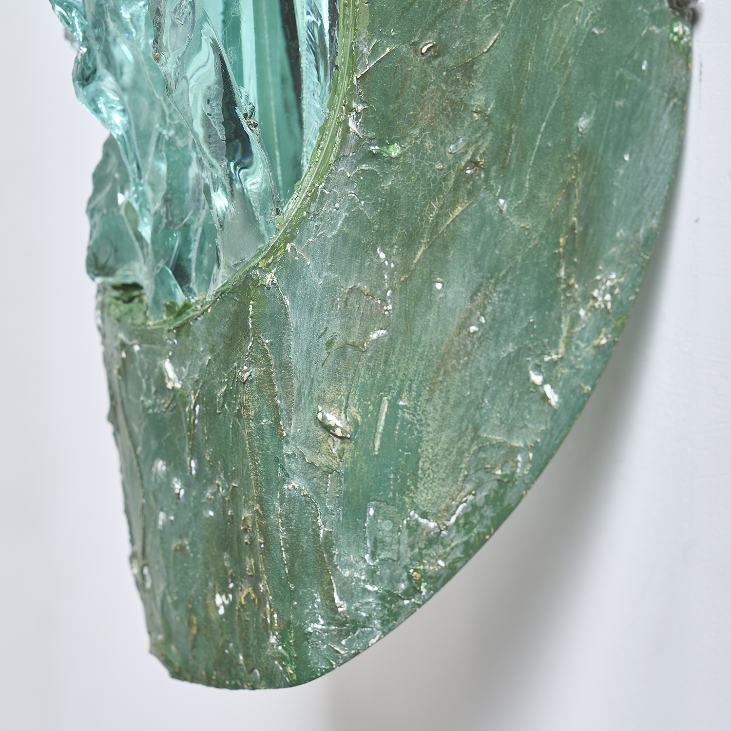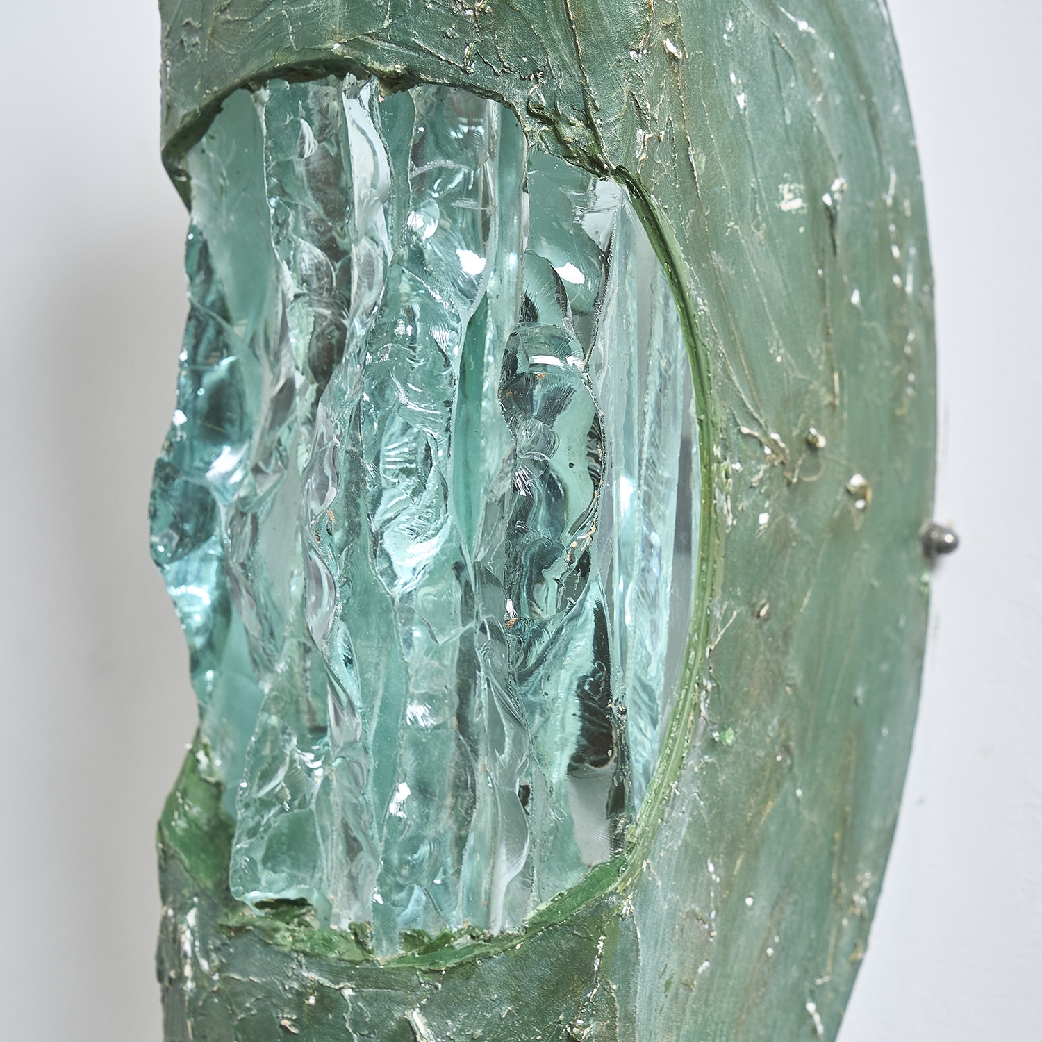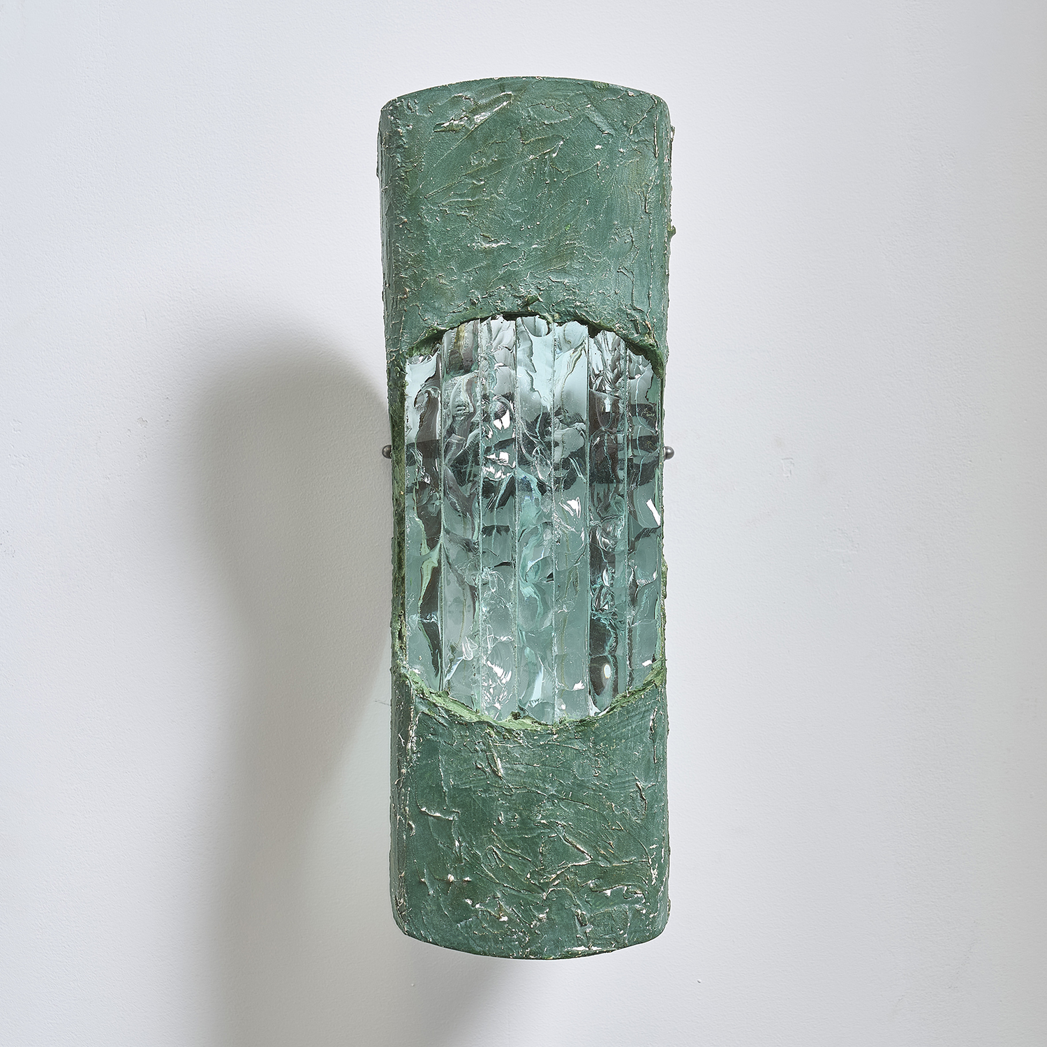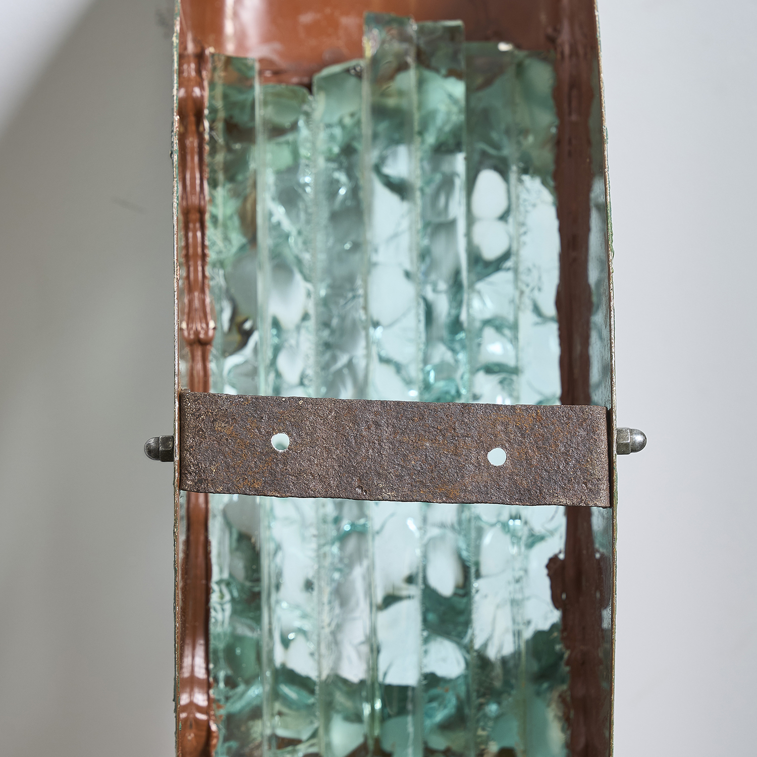 Paire d’appliques en métal découpé enduit et diffuseur en verre épais.